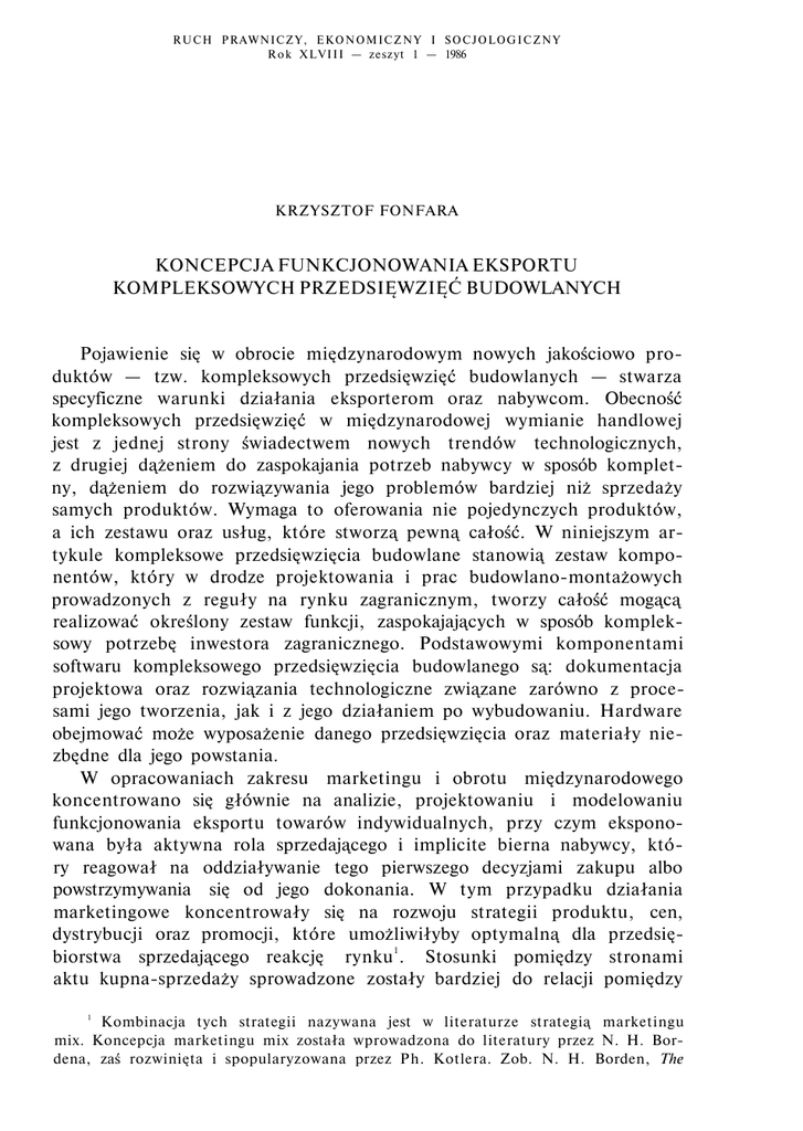 RUCH PRAWNICZY, EKONOMICZNY I SOCJOLOGICZNY R o k X L V I I I — zeszyt 1 — 1986 KRZYSZTOF FONFARA KONCEPCJA FUNKCJONOWANIA EKSPORTU KOMPLEKSOWYCH PRZEDSIĘWZIĘĆ BUDOWLANYCH Pojawienie się w obrocie międzynarodowym nowych jakościowo pro duktów — tzw. kompleksowych przedsięwzięć budowlanych — stwarza specyficzne warunki działania eksporterom oraz nabywcom. Obecność kompleksowych przedsięwzięć w międzynarodowej wymianie handlowej jest z jednej strony świadectwem nowych trendów technologicznych, z drugiej dążeniem do zaspokajania potrzeb nabywcy w sposób komplet ny, dążeniem do rozwiązywania jego problemów bardziej niż sprzedaży samych produktów. Wymaga to oferowania nie pojedynczych produktów, a ich zestawu oraz usług, które stworzą pewną całość. W niniejszym ar tykule kompleksowe przedsięwzięcia budowlane stanowią zestaw kompo nentów, który w drodze projektowania i prac budowlano-montażowych prowadzonych z reguły na rynku zagranicznym, tworzy całość mogącą realizować określony zestaw funkcji, zaspokajających w sposób komplek sowy potrzebę inwestora zagranicznego. Podstawowymi komponentami softwaru kompleksowego przedsięwzięcia budowlanego są: dokumentacja projektowa oraz rozwiązania technologiczne związane zarówno z proce sami jego tworzenia, jak i z jego działaniem po wybudowaniu. Hardware obejmować może wyposażenie danego przedsięwzięcia oraz materiały nie zbędne dla jego powstania. W opracowaniach zakresu marketingu i obrotu międzynarodowego koncentrowano się głównie na analizie, projektowaniu i modelowaniu funkcjonowania eksportu towarów indywidualnych, przy czym ekspono wana była aktywna rola sprzedającego i implicite bierna nabywcy, któ ry reagował na oddziaływanie tego pierwszego decyzjami zakupu albo powstrzymywania się od jego dokonania. W tym przypadku działania marketingowe koncentrowały się na rozwoju strategii produktu, cen, dystrybucji oraz promocji, które umożliwiłyby optymalną dla przedsię biorstwa sprzedającego reakcję rynku 1 . Stosunki pomiędzy stronami aktu kupna-sprzedaży sprowadzone zostały bardziej do relacji pomiędzy 1 Kombinacja tych strategii nazywana jest w literaturze strategią marketingu mix. Koncepcja marketingu mix została wprowadzona do literatury przez N. H. Bordena, zaś rozwinięta i spopularyzowana przez Ph. Kotlera. Zob. N. H. Borden, The 118 Krzysztof Fonfara sprzedającym a p e w n y m ogólnym rynkiem (tzw. rynkiem anonimowym), niż do relacji z indywidualnymi nabywcami. Odmienne od dotychczaso wo analizowanych warunki działania eksportera i nabywcy komplekso wych przedsięwzięć budowlanych wymagają innego spojrzenia na funk cjonowanie obrotu tymi przedsięwzięciami oraz stanowią przesłankę prze wartościowania koncepcji marketingowej. W dalszej części artykułu funkcjonowanie eksportu kompleksowych przedsięwzięć budowlanych interpretuje się jako relacje występujące po między eksporterem a nabywcą, na które wpływ mogą mieć różne czyn niki (np. specyfika nabywcy, p r o d u k t u czy gospodarki kraju eksportera), określające możliwości kształtowania nowych potrzeb nabywcy przez eksportera i/lub dostosowywanie się eksportera do preferencji nabywcy. Z uwagi bowiem na charakter nabywcy, jego kompetencje, możliwości techniczno-technologiczne, organizacyjne i finansowe oraz specyfikę przedmiotu obrotu, zakłada się, iż eksporter może (a często musi) w spo sób bierny przystosowywać się do konkretnie sprecyzowanej przez na bywcę potrzeby. Nabywca może przejawiać zatem daleko idącą aktyw ność, jeśli chodzi o generowanie potrzeby, jej dokładne opisanie oraz przesądzenie sposobu materializacji. Aktywna lub bierna rola jednej ze stron znajduje swój wyraz w uogólnionej wariantowej prezentacji relacji pomiędzy eksporterem a nabywcą. Relacje te bowiem mogą przybrać charakter: 1) oddziaływania nabywcy na eksportera (aktywny nabywca, bierny eksporter) — wariant pierwszy, 2) wzajemnego oddziaływania (interakcji) pomiędzy eksporterem a n a bywcą (aktywny może być zarówno nabywca, jak i eksporter) — wa riant drugi, 3) oddziaływania eksportera na nabywcę (aktywny eksporter, bierny nabywca) — wariant trzeci. W literaturze marketingowej, jak wyżej wspomniano, koncentrowano się głównie na uwzględnianiu funkcjonowania sprzedaży różnym nabyw com towarów indywidualnych, jednakże przede wszystkim w aspekcie r y n k u anonimowego, gdzie kupujący rozpatrywany był jako element większej zbiorowości. W t y m przypadku przyjmowano założenie o po dobieństwach występujących pomiędzy nabywcami, co znajdowało swoje odzwierciedlenie w stosowaniu tzw. przeciętnego nabywcy. Ponadto eks ponowano aktywną rolę sprzedającego i implicite bierną kupującego, co odpowiada trzeciemu wariantowi relacji pomiędzy eksporterem a nabyw cą 2 . Takie podejście przyjmowane z reguły słusznie dla towarów konConcept of the Marketing Mix, Journal of Advertising Research, June 1964; Ph. Kotler, Marketing Management. Analysis, Planning and Control, Prentice — Hall International, New York 1967. 2 Zob. R. M. Hill, R. S. Alexander, J. S. Cross, Industrial Marketing, Homewood, Illinois 1975 oraz Ph. Kotier, Marketing Management. Koncepcja funkcjonowania eksportu przedsięwzięć budowlanych 119 sumpcyjnych rozszerzano de facto również na towary inwestycyjne i m a sowe. Te trzy grupy towarowe i odpowiadające im trzy grupy nabywców bowiem były przedmiotem oddzielnych analiz i charakterystyk. Związana z wariantem trzecim koncepcja marketingu mix zakładała, iż zmienne w r a m a c h poszczególnych komponentów m a r k e t i n g u mix po w i n n y być zróżnicowane w zależności od wymienionych wyżej grup t o warowych, w r a m a c h g r u p towarowych, a w skrajnym przypadku każdy indywidualny towar powinien mieć swoją specyficzną wersję m a r k e t i n gu mix. Rynek jednak, z założenia rozpatrywany 