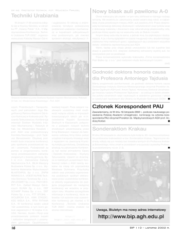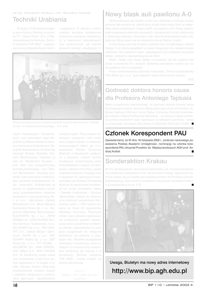 dr in¿. Krzysztof Kotwica, fot. Wojciech Faruzel Techniki Urabiania W dniach 17-20 wrzeœnia odby³a siê w Krynicy Górskiej, w oœrodku PT „Czarny Potok” S.A., II Miêdzynarodowa Konferencja „Techniki Urabiania TUR 2002”, organizowana przez Katedrê Maszyn Górni- i wyg³oszono 72 referaty o zró¿nicowanej tematyce poœwiêconej problemom urabiania i mechanizacji w kopalniach odkrywkowych oraz podziemnych, jak równie¿ sprawom ekologii, rekultywacji i li- Nowy blask auli pawilonu A-0 Okres wakacyjny jak zwykle i w tym roku obfitowa³ w ró¿nego rodzaju remonty. We wrzeœniu br. zakoñczony zosta³ ostatni etap robót, w najbardziej chyba presti¿owym miejscu AGH, auli pawilonu A-0. Prace obejmowa³y konserwacjê dekoracji stiukowych i sztukatorskich oraz tynków wraz z dekoracj¹ malarsk¹ i z³oceniami oraz rekonstrukcjê p³askorzeŸby or³a, podczas której oparto siê na wizerunku or³a ze Statutu Uczelni. Innymi s³owy aula niby ta sama, a jednak inna, bo piêkniejsza i dostojniejsza. A ja z dum¹ ogl¹da³em w czasie inauguracji roku akademickiego zdziwione miny niektórych goœci, ogl¹daj¹cych siê z podziwem wszystkie detale i zdobienia reprezentacyjnej auli AGH. Warto, bêd¹c przy okazji jakiejœ uroczystoœci lub te¿ zupe³nie bez okazji w pawilonie A-0, obejrzeæ dok³adniej odnowiony wystrój auli, bo rzeczywiœcie jest co podziwiaæ. Prace konserwatorskie wykona³a krakowska „Firma konserwatorska Piotr Bia³ko sp. z o.o.” pod nadzorem s³u¿b technicznych Uczelni. (red) Godnoœæ doktora honoris causa dla Profesora Antoniego Tajdusia Otwarcie Konferencji przez Dziekana Wydzia³u In¿ynierii Mechanicznej i Robotyki Mamy przyjemnoœæ poinformowaæ, ¿e godnoœæ doktora honoris causa Donbaskiego Instytutu Górniczo-Metalurgicznego otrzyma³ Prorektor ds. Spraw Ogólnych AGH prof. Antoni Tajduœ. Honorowy Doktorat Ukraiñskiego Instytutu nadano Profesorowi Tajdusiowi – za zas³ugi w dziele utrwalenia polsko-ukraiñskich wiêzi naukowych w dziedzinie górnictwa i wk³ad w rozwój kadr naukowych dla Ukrainy na Wydziale Górniczym DIGM. Dr hab. in¿. W³odzimierza Kowalskiego – Prof. AGH czych, Przeróbczych i Transportowych, pod patronatem Jego Magnificencji Rektora Akademii Górniczo-Hutniczej w Krakowie prof. Ryszarda Tadeusiewicza. Konferencjê otworzyli Dziekan Wydzia³u In¿ynierii Mechanicznej i Robotyki dr hab. in¿. W³odzimierz Kowalski – prof. AGH oraz przewodnicz¹cy Komitetu Naukowego – prof. Tadeusz Banaszewski. Obydwaj podkreœlili du¿e znaczenie konferencji, jako spotkania przedstawicieli nauki i przemys³u. Podziêkowali za pomoc w zorganizowaniu konferencji przedstawicielom zak³adów zwi¹zanych z bran¿¹ górnicz¹. Byli to m.in.: Zabrzañskie Zak³ady Mechaniczne S.A., BILIA Maszyny Budowlane Polska Sp. z o.o., Wytwórnia Materia³ów Wybuchowych BLASTEXPOL Sp. z o.o., ZNPW REMAG S.A., VOEST-ALPINE Technika Górnicza i Tunelowa Sp. z o.o., ZM LEGMET Sp. z o.o., FAiH GEORYT S.A., Zak³ad Maszyn Górniczych GLINIK Sp. z o.o., DBT SCHARF Polska Sp. z o.o., DBT Polska Sp. z o.o., FTT STOMIL – WOLBROM S.A., KWK STASZIC, KSS WIS£A S.A., RFM RYFAMA S.A.. W konferencji wziê³o udzia³ 152 uczestników, w tym liczni goœcie zagraniczni z 10 krajów m.in. USA, Niemiec, Austrii i Rosji oraz przedstawiciele polskich kopalñ i zak³adów zwi¹zanych z przemys³em górniczym. Opublikowano 16 kwidacji kopalñ. Poza sesjami naukowymi uczestnicy mieli mo¿liwoœæ wziêcia udzia³u w imprezach towarzysz¹cych takich jak m.in. zwiedzenie Kopalni Surowców Skalnych w Klêczanach, po³¹czone z pokazem nowych technik strza³owych prezentowan¹ przez firmê Blastexpol i maszyn do ³adowania i odstawy firmy Volvo, pokaz urz¹dzeñ transportu linowego wraz z wyjazdem na Jaworzynê Krynick¹ kolejk¹ gondolow¹. Dodatkow¹ atrakcj¹ na zakoñczenie Konferencji by³ recital primadonny Opery i Operetki Krakowskiej – Krystyny Tyburowskiej. Ujawni³ on drzemi¹ce w niektórych uczestnikach Konferencji rodem z AGH talenty wokalne na miarê ich poprzednika Wies³awa Ochmana. Przychylny odbiór oraz potrzeba organizowania podobnych spotkañ deklarowane przez uczestników konferencji sk³oni³y organizatorów do podjêcia przygotowañ do nastêpnej konferencji we wrzeœniu w przysz³ym roku. Wszelkie szczegó³owe informacje o konferencji, liœcie referatów i ich autorów oraz uczestników konferencji jak równie¿ o III Konferencji „Techniki Urabiania TUR 2003”, mo¿na znaleŸæ na stronie internetowej: http:// kmgpit.imir.agh.edu.pl/ tur2002/ Cz³onek Korespondent PAU Zawiadamiamy, ¿e W dniu 16 listopada 2002 r., podczas naukowego posiedzenia Polskiej Akademii Umiejêtnoœci, nominacjê na cz³onka korespondenta PAU otrzyma³ Prorektor ds. Miêdzynarodowych AGH prof. Andrzej Korbel. Sonderaktion Krakau W dniu 30 listopada br. obchodzona by³a kolejna, 63. rocznica aresztowania profesorów krakowskich w tzw. Sonderaktion Krakau. Tegoroczne obchody odby³y siê ju¿ niestety bez œwiadka tamtych dni Profesora Andrzeja Bolewskiego, który zmar³ w przeddzieñ uroczystoœci (sylwetkê Profesora przedstawiamy na str. 2–3). Uwaga, Biuletyn ma nowy adres internetowy http://www.bip.agh.edu.pl BIP 110 – listopad 2002 r.