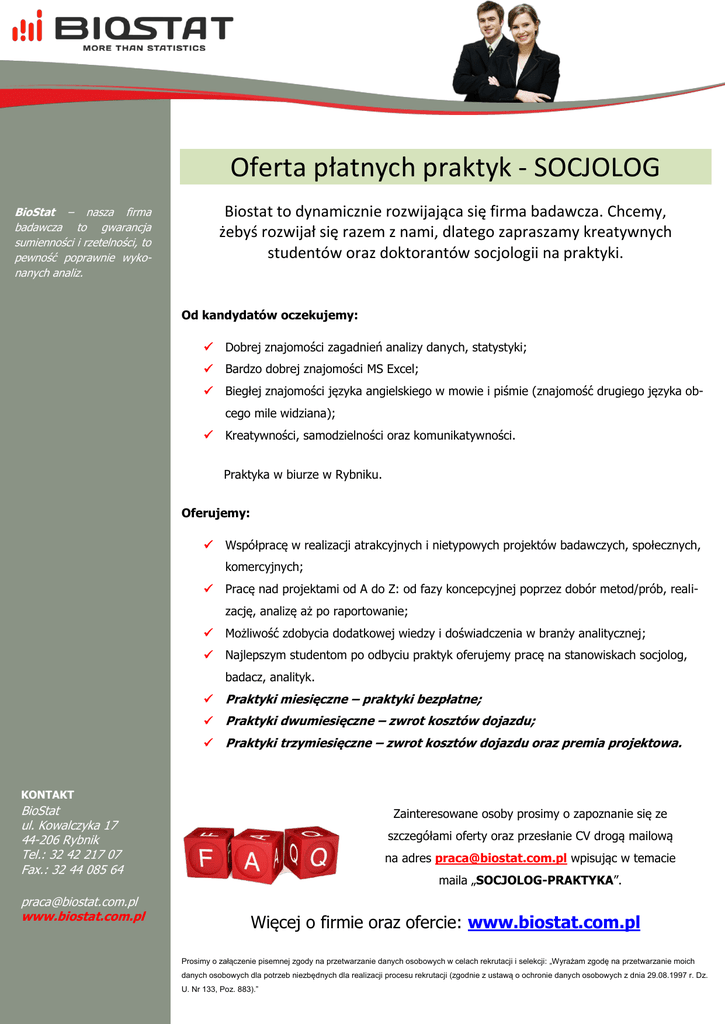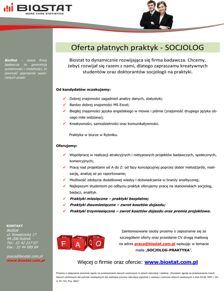 Oferta płatnych praktyk - SOCJOLOG Biostat to dynamicznie rozwijająca się firma badawcza. Chcemy, żebyś rozwijał się razem z nami, dlatego zapraszamy kreatywnych studentów oraz doktorantów socjologii na praktyki. BioStat – nasza firma badawcza to gwarancja sumienności i rzetelności, to pewność poprawnie wykonanych analiz. Od kandydatów oczekujemy: Dobrej znajomości zagadnień analizy danych, statystyki; Bardzo dobrej znajomości MS Excel; Biegłej znajomości języka angielskiego w mowie i piśmie (znajomość drugiego języka obcego mile widziana); Kreatywności, samodzielności oraz komunikatywności. Praktyka w biurze w Rybniku. Oferujemy: Współpracę w realizacji atrakcyjnych i nietypowych projektów badawczych, społecznych, komercyjnych; Pracę nad projektami od A do Z: od fazy koncepcyjnej poprzez dobór metod/prób, realizację, analizę aż po raportowanie; Możliwość zdobycia dodatkowej wiedzy i doświadczenia w branży analitycznej; Najlepszym studentom po odbyciu praktyk oferujemy pracę na stanowiskach socjolog, badacz, analityk. Praktyki miesięczne – praktyki bezpłatne; Praktyki dwumiesięczne – zwrot kosztów dojazdu; Praktyki trzymiesięczne – zwrot kosztów dojazdu oraz premia projektowa. KONTAKT BioStat ul. Kowalczyka 17 44-206 Rybnik Tel.: 32 42 217 07 Fax.: 32 44 085 64 [email protected] www.biostat.com.pl Zainteresowane osoby prosimy o zapoznanie się ze szczegółami oferty oraz przesłanie CV drogą mailową na adres [email protected] wpisując w temacie maila „SOCJOLOG-PRAKTYKA”. Więcej o firmie oraz ofercie: www.biostat.com.pl Prosimy o załączenie pisemnej zgody na przetwarzanie danych osobowych w celach rekrutacji i selekcji: „Wyrażam zgodę na przetwarzanie moich danych osobowych dla potrzeb niezbędnych dla realizacji procesu rekrutacji (zgodnie z ustawą o ochronie danych osobowych z dnia 29.08.1997 r. Dz. U. Nr 133, Poz. 883).”
