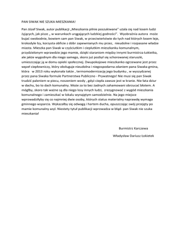 PAN SIWAK NIE SZUKA MIESZKANIA! Pan Józef Siwak, autor publikacji „Mieszkania pilnie poszukiwane” użala się nad losem ludzi żyjących, jak pisze „ w warunkach urągających ludzkiej godności”. Wyobraźnia autora może bujać swobodnie, bowiem sam pan Siwak, w przeciwieństwie do tych nad których losem leje, krokodyle łzy, korzysta obficie z dóbr zapewnianych mu przez, nieudolne i rozpasane władze miasta. Mieszka pan Siwak w czyściutkim i cieplutkim mieszkanku komunalnym, przydzielonym wprawdzie jego mamie, dzięki staraniom między innymi burmistrza Łokietka, ale jakże wygodnym dla niego samego, skoro już pozbył się schorowanej staruszki, umieszczając ją w domu opieki społecznej. Dwupokojowe mieszkanko ogrzewane jest przez węzeł ciepłowniczy, który obsługuje nieudolna i niegospodarna zdaniem pana Siwaka gmina, która w 2013 roku wykonała także , termomodernizację jego budynku , w wyszydzanej przez pana Siwaka formule Partnerstwa Publiczno - Prywatnego! Nie musi się pan Siwak trudzić paleniem w piecu, noszeniem wody , gdyż ciepła zawsze jest w kranie. Nie łata dziur w dachu, bo to dach komunalny. Może za to bez żadnych zahamowani obrzucać błotem. A mógłby, skoro tak ważne są dla niego losy innych ludzi, zrezygnować z wygód mieszkania komunalnego i zamieszkać w lokalu wynajętym samodzielnie. Na jego miejsce wprowadziłyby się co najmniej dwie osoby, których status materialny naprawdę wymaga gminnego wsparcia. Wykazałby się odwagą i hartem ducha, opuszczając swój przejęty po mamie komunalny azyl. Niestety tytuł publikacji wprowadza w błąd- pan Siwak nie szuka mieszkania! Burmistrz Karczewa Władysław Dariusz Łokietek
