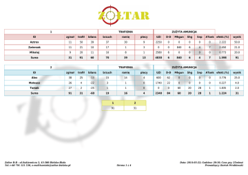 1 TRAFIENIA ZUŻYTA AMUNICJA ID zginał trafił bilans brzuch ramię plecy UZI D-D Mhgun Shg Snp Astrox 11 50 39 37 30 9 2250 0 0 0 0 0 2.222 50.0 Zwierzak 11 21 10 17 1 3 0 0 840 6 4 7 2.450 21.0 Mikolaj 9 20 11 16 8 1 2580 6 0 0 0 0 0.773 20.0 Suma 31 91 60 70 39 13 4830 6 840 6 4 7 1.598 91 2 TRAFIENIA ATank efekt.(%) wynik ZUŻYTA AMUNICJA ID zginał trafił bilans brzuch ramię plecy UZI D-D Mhgun Shg Snp Alex 38 25 -13 15 14 4 600 62 0 0 0 0 3.776 25.0 Mateusz 26 4 -22 3 1 0 1740 22 0 0 0 0 0.227 4.0 Tomek 27 2 -25 1 1 0 0 0 60 20 28 1 1.835 2.0 Suma 91 31 -60 19 16 4 2340 84 60 20 28 1 1.224 31 Zoltar B-B - ul.Sukiennicza 3, 43-300 Bielsko-Biała Tel.:+48 791 121 530, e-mail:[email protected] 1 2 91 31 Strona 1 z 4 ATank efekt.(%) wynik Data: 2014-03-22; Godzina: 20:10; Czas gry: 25minut Prowadzący: Bartek Wroblewski Drużyny Miejsce Nazwa Zoltar B-B - ul.Sukiennicza 3, 43-300 Bielsko-Biała Tel.:+48 791 121 530, e-mail:[email protected] Rozgrywki 1 Suma 1 91 91 2 31 31 Strona 2 z 4 Data: 2014-03-22 Prowadzący: Bartek Wroblewski Zestawienie wg wyniku Miejsce TRAFIENIA ZUŻYTA AMUNICJA ID zginał trafił bilans brzuch ramię plecy UZI D-D Mhgun Shg Snp aTank efekt.(%) wynik Astrox 26.40 120.00 93.60 88.80 72.00 21.60 5400.00 0.00 0.00 0.00 0.00 0.00 2.222 120.00 Alex 91.20 60.00 -31.20 36.00 33.60 9.60 1440.00 148.80 0.00 0.00 0.00 0.00 3.776 60.00 Zwierzak 26.40 50.40 24.00 40.80 2.40 7.20 0.00 0.00 2016.00 14.40 9.60 16.80 2.450 50.40 4 Mikolaj 21.60 48.00 26.40 38.40 19.20 2.40 6192.00 14.40 0.00 0.00 0.00 0.00 0.773 48.00 5 Mateusz 62.40 9.60 -52.80 7.20 2.40 0.00 4176.00 52.80 0.00 0.00 0.00 0.00 0.227 9.60 6 Tomek 64.80 4.80 -60.00 2.40 2.40 0.00 0.00 0.00 144.00 48.00 67.20 2.40 1.835 4.80 Zestawienie wg bilansu Miejsce TRAFIENIA ZUŻYTA AMUNICJA ID zginał trafił bilans brzuch ramię plecy UZI D-D Mhgun Shg Snp aTank efekt.(%) wynik Astrox 26.40 120.00 93.60 88.80 72.00 21.60 5400.00 0.00 0.00 0.00 0.00 0.00 2.222 120.00 Mikolaj 21.60 48.00 26.40 38.40 19.20 2.40 6192.00 14.40 0.00 0.00 0.00 0.00 0.773 48.00 Zwierzak 26.40 50.40 24.00 40.80 2.40 7.20 0.00 0.00 2016.00 14.40 9.60 16.80 2.450 50.40 4 Alex 91.20 60.00 -31.20 36.00 33.60 9.60 1440.00 148.80 0.00 0.00 0.00 0.00 3.776 60.00 5 Mateusz 62.40 9.60 -52.80 7.20 2.40 0.00 4176.00 52.80 0.00 0.00 0.00 0.00 0.227 9.60 6 Tomek 64.80 4.80 -60.00 2.40 2.40 0.00 0.00 0.00 144.00 48.00 67.20 2.40 1.835 4.80 Zoltar B-B - ul.Sukiennicza 3, 43-300 Bielsko-Biała Tel.:+48 791 121 530, e-mail:[email protected] Strona 3 z 4 Data: 2014-03-22 Prowadzący: Bartek Wroblewski Zestawienie wg efektywności Miejsce TRAFIENIA ZUŻYTA AMUNICJA ID zginał trafił bilans brzuch ramię plecy UZI D-D Mhgun Shg Snp aTank efekt.(%) wynik Alex 91.20 60.00 -31.20 36.00 33.60 9.60 1440.00 148.80 0.00 0.00 0.00 0.00 3.776 60.00 Zwierzak 26.40 50.40 24.00 40.80 2.40 7.20 0.00 0.00 2016.00 14.40 9.60 16.80 2.450 50.40 Astrox 26.40 120.00 93.60 88.80 72.00 21.60 5400.00 0.00 0.00 0.00 0.00 0.00 2.222 120.00 4 Tomek 64.80 4.80 -60.00 2.40 2.40 0.00 0.00 0.00 144.00 48.00 67.20 2.40 1.835 4.80 5 Mikolaj 21.60 48.00 26.40 38.40 19.20 2.40 6192.00 14.40 0.00 0.00 0.00 0.00 0.773 48.00 6 Mateusz 62.40 9.60 -52.80 7.20 2.40 0.00 4176.00 52.80 0.00 0.00 0.00 0.00 0.227 9.60 Zoltar B-B - ul.Sukiennicza 3, 43-300 Bielsko-Biała Tel.:+48 791 121 530, e-mail:[email protected] Strona 4 z 4 Data: 2014-03-22 Prowadzący: Bartek Wroblewski