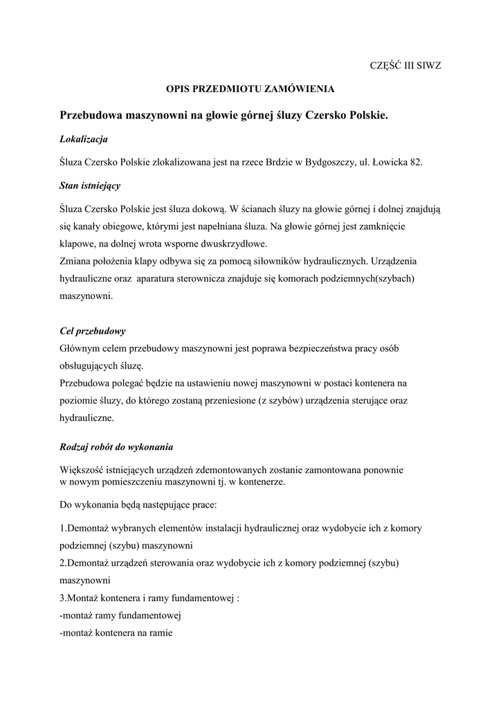CZĘŚĆ III SIWZ OPIS PRZEDMIOTU ZAMÓWIENIA Przebudowa maszynowni na głowie górnej śluzy Czersko Polskie. Lokalizacja Śluza Czersko Polskie zlokalizowana jest na rzece Brdzie w Bydgoszczy, ul. Łowicka 82. Stan istniejący Śluza Czersko Polskie jest śluza dokową. W ścianach śluzy na głowie górnej i dolnej znajdują się kanały obiegowe, którymi jest napełniana śluza. Na głowie górnej jest zamknięcie klapowe, na dolnej wrota wsporne dwuskrzydłowe. Zmiana położenia klapy odbywa się za pomocą siłowników hydraulicznych. Urządzenia hydrauliczne oraz aparatura sterownicza znajduje się komorach podziemnych(szybach) maszynowni. Cel przebudowy Głównym celem przebudowy maszynowni jest poprawa bezpieczeństwa pracy osób obsługujących śluzę. Przebudowa polegać będzie na ustawieniu nowej maszynowni w postaci kontenera na poziomie śluzy, do którego zostaną przeniesione (z szybów) urządzenia sterujące oraz hydrauliczne. Rodzaj robót do wykonania Większość istniejących urządzeń zdemontowanych zostanie zamontowana ponownie w nowym pomieszczeniu maszynowni tj. w kontenerze. Do wykonania będą następujące prace: 1.Demontaż wybranych elementów instalacji hydraulicznej oraz wydobycie ich z komory podziemnej (szybu) maszynowni 2.Demontaż urządzeń sterowania oraz wydobycie ich z komory podziemnej (szybu) maszynowni 3.Montaż kontenera i ramy fundamentowej : -montaż ramy fundamentowej -montaż kontenera na ramie -montaż schodów i barierek wejściowych 4.Montaż włazu do maszynowni 5.Montaż instalacji hydraulicznej 6.Roboty elektryczne: -montaż skrzynki zaciskowej w komorze maszynowni oraz rozdzielnicy przyłączeniowej wewnątrz kontenera -podłączenie urządzeń sterowania -wykonanie połączeń elektrycznych Szczegółowy zakres robót jest podany w przedmiarach. Z uwagi na ryczałtowy charakter wynagrodzenia, przedmiary robót załączone do SIWZ nie stanowią załączników do opisu przedmiotu zamówienia lecz są materiałem informacyjnym (pomocniczym). Termin zakończenia robót – 15 grudnia 2012r. Załączniki: Nr 1. Projekt budowlany Nr 2. Specyfikacja techniczna wykonania i odbioru robót Nr 3. Projekt wykonawczy