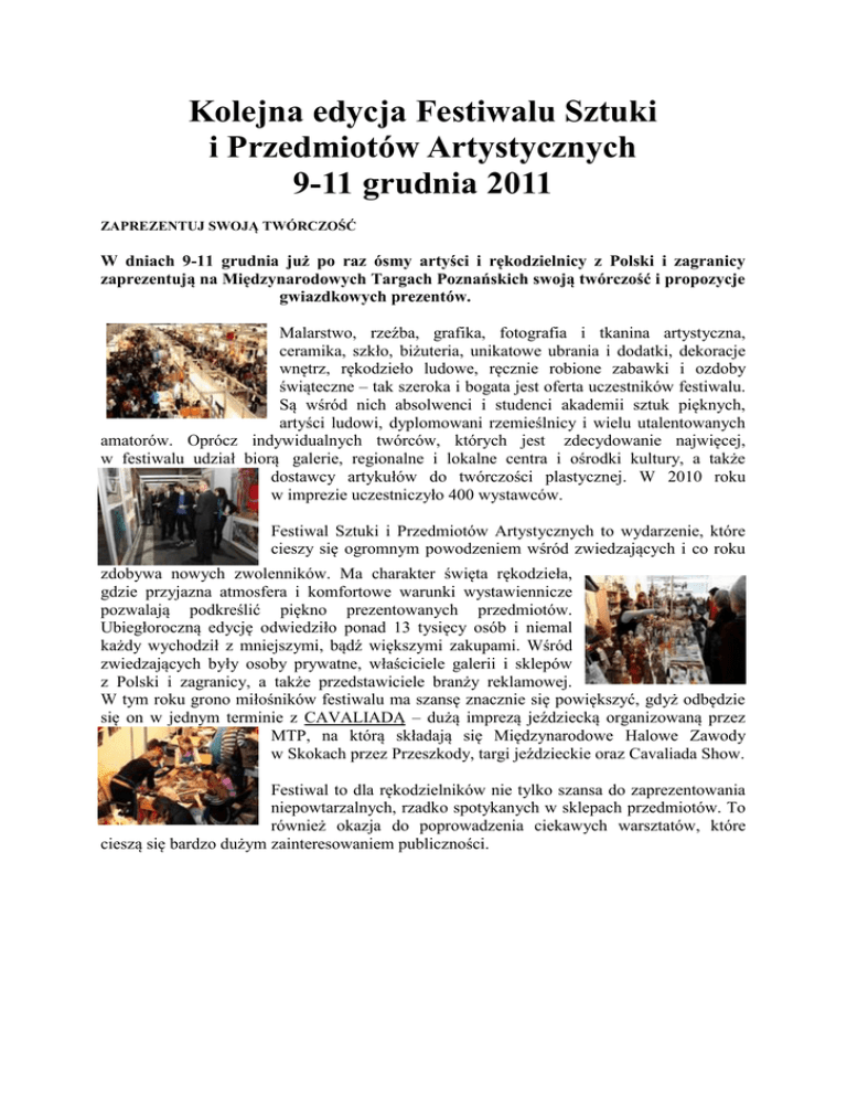 Kolejna edycja Festiwalu Sztuki i Przedmiotów Artystycznych 9-11 grudnia 2011 ZAPREZENTUJ SWOJĄ TWÓRCZOŚĆ W dniach 9-11 grudnia już po raz ósmy artyści i rękodzielnicy z Polski i zagranicy zaprezentują na Międzynarodowych Targach Poznańskich swoją twórczość i propozycje gwiazdkowych prezentów. Malarstwo, rzeźba, grafika, fotografia i tkanina artystyczna, ceramika, szkło, biżuteria, unikatowe ubrania i dodatki, dekoracje wnętrz, rękodzieło ludowe, ręcznie robione zabawki i ozdoby świąteczne – tak szeroka i bogata jest oferta uczestników festiwalu. Są wśród nich absolwenci i studenci akademii sztuk pięknych, artyści ludowi, dyplomowani rzemieślnicy i wielu utalentowanych amatorów. Oprócz indywidualnych twórców, których jest zdecydowanie najwięcej, w festiwalu udział biorą galerie, regionalne i lokalne centra i ośrodki kultury, a także dostawcy artykułów do twórczości plastycznej. W 2010 roku w imprezie uczestniczyło 400 wystawców. Festiwal Sztuki i Przedmiotów Artystycznych to wydarzenie, które cieszy się ogromnym powodzeniem wśród zwiedzających i co roku zdobywa nowych zwolenników. Ma charakter święta rękodzieła, gdzie przyjazna atmosfera i komfortowe warunki wystawiennicze pozwalają podkreślić piękno prezentowanych przedmiotów. Ubiegłoroczną edycję odwiedziło ponad 13 tysięcy osób i niemal każdy wychodził z mniejszymi, bądź większymi zakupami. Wśród zwiedzających były osoby prywatne, właściciele galerii i sklepów z Polski i zagranicy, a także przedstawiciele branży reklamowej. W tym roku grono miłośników festiwalu ma szansę znacznie się powiększyć, gdyż odbędzie się on w jednym terminie z CAVALIADĄ – dużą imprezą jeździecką organizowaną przez MTP, na którą składają się Międzynarodowe Halowe Zawody w Skokach przez Przeszkody, targi jeździeckie oraz Cavaliada Show. Festiwal to dla rękodzielników nie tylko szansa do zaprezentowania niepowtarzalnych, rzadko spotykanych w sklepach przedmiotów. To również okazja do poprowadzenia ciekawych warsztatów, które cieszą się bardzo dużym zainteresowaniem publiczności.