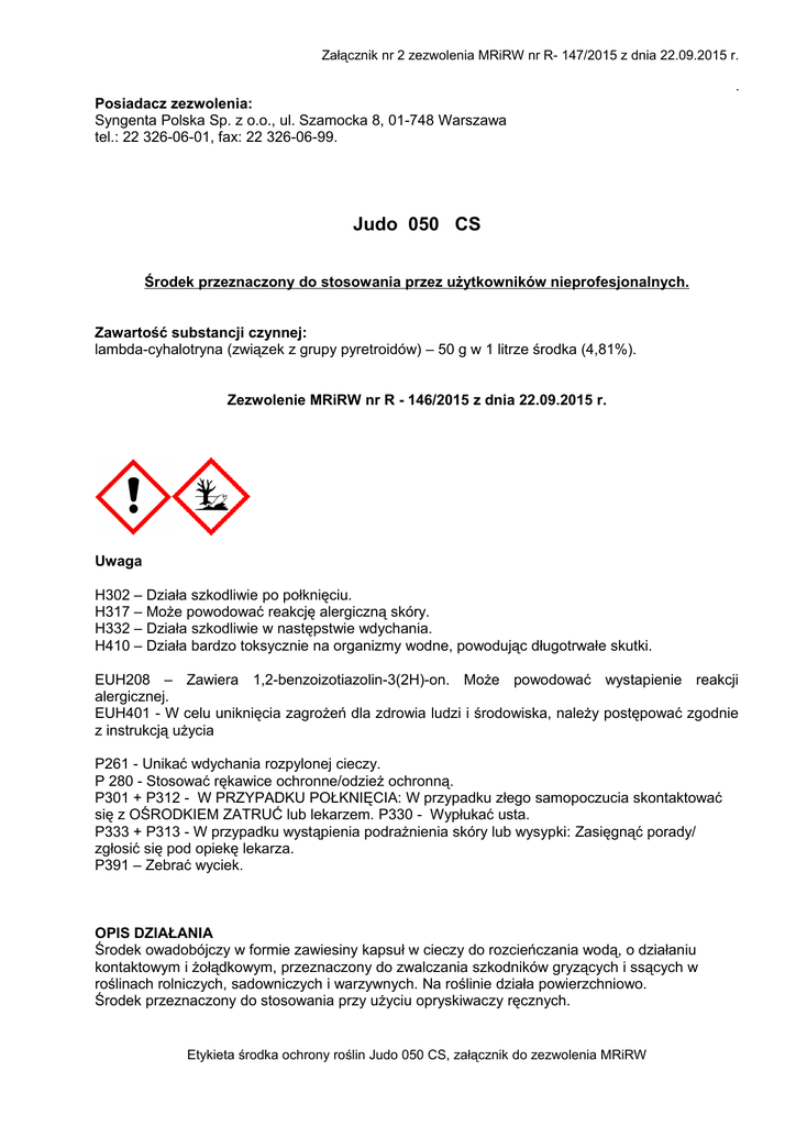 Załącznik nr 2 zezwolenia MRiRW nr R- 147/2015 z dnia 22.09.2015 r. . Posiadacz zezwolenia: Syngenta Polska Sp. z o.o., ul. Szamocka 8, 01-748 Warszawa tel.: 22 326-06-01, fax: 22 326-06-99. Judo 050 CS Środek przeznaczony do stosowania przez użytkowników nieprofesjonalnych. Zawartość substancji czynnej: lambda-cyhalotryna (związek z grupy pyretroidów) – 50 g w 1 litrze środka (4,81%). Zezwolenie MRiRW nr R - 146/2015 z dnia 22.09.2015 r. Uwaga H302 – Działa szkodliwie po połknięciu. H317 – Może powodować reakcję alergiczną skóry. H332 – Działa szkodliwie w następstwie wdychania. H410 – Działa bardzo toksycznie na organizmy wodne, powodując długotrwałe skutki. EUH208 – Zawiera 1,2-benzoizotiazolin-3(2H)-on. Może powodować wystapienie reakcji alergicznej. EUH401 - W celu uniknięcia zagrożeń dla zdrowia ludzi i środowiska, należy postępować zgodnie z instrukcją użycia P261 - Unikać wdychania rozpylonej cieczy. P 280 - Stosować rękawice ochronne/odzież ochronną. P301 + P312 - W PRZYPADKU POŁKNIĘCIA: W przypadku złego samopoczucia skontaktować się z OŚRODKIEM ZATRUĆ lub lekarzem. P330 - Wypłukać usta. P333 + P313 - W przypadku wystąpienia podrażnienia skóry lub wysypki: Zasięgnąć porady/ zgłosić się pod opiekę lekarza. P391 – Zebrać wyciek. OPIS DZIAŁANIA Środek owadobójczy w formie zawiesiny kapsuł w cieczy do rozcieńczania wodą, o działaniu kontaktowym i żołądkowym, przeznaczony do zwalczania szkodników gryzących i ssących w roślinach rolniczych, sadowniczych i warzywnych. Na roślinie działa powierzchniowo. Środek przeznaczony do stosowania przy użyciu opryskiwaczy ręcznych. Etykieta środka ochrony roślin Judo 050 CS, załącznik do zezwolenia MRiRW Załącznik nr 2 zezwolenia MRiRW nr R- 147/2015 z dnia 22.09.2015 r. . STOSOWANIE ŚRODKA ROŚLINY ROLNICZE Ziemniak larwy i chrząszcze stonki ziemniaczanej. Maksymalna dawka dla jednorazowego zastosowania: 1,6 ml/100 m2 Zalecana dawka dla jednorazowego zastosowania: 1,2 – 1,6 ml/100 m2 Termin stosowania: Zabieg wykonać po wystąpieniu szkodnika. Wyższą z zalecanych dawek stosować do zwalczania chrząszczy oraz w przypadku bujnej naci ziemniaczanej. Mszyce Maksymalna dawka dla jednorazowego zastosowania: 2,0 ml/100 m2 Zalecana dawka dla jednorazowego zastosowania: 1,6 – 2,0 ml/100 m2 Termin stosowania: Zabieg wykonać po wystąpieniu szkodnika. Maksymalna liczba zabiegów w sezonie wegetacyjnym: 2 Odstęp między zabiegami: co najmniej 10 -14 dni Zalecana ilość wody: 3 – 4 l/100 m2 Zalecane opryskiwane: średniokropliste Rzepak ozimy słodyszek rzepakowy (zabieg przeciwko słodyszkowi zwalcza również chowacza czterozębnego). Maksymalna / zalecana dawka dla jednorazowego zastosowania: 1,2 ml/100 m2 Termin stosowania: Opryskiwać po wystąpieniu chrząszczy na plantacji, zgodnie z sygnalizacją. chowacz brukwiaczek. Maksymalna / zalecana dawka dla jednorazowego zastosowania: 1,25 ml/100 m2 Termin stosowania: Opryskiwać przed złożeniem jaj przez chrząszcze, zgodnie z sygnalizacją. Maksymalna liczba zabiegów w sezonie wegetacyjnym: 2 Odstęp między zabiegami: co najmniej 10 -14 dni Zalecana ilość wody: 3 l/100 m2 Zalecane opryskiwane: średniokropliste 3. Pszenica ozima, jęczmień jary skrzypionki. Maksymalna dawka dla jednorazowego zastosowania: 1,0 ml/100 m2 Zalecana dawka dla jednorazowego zastosowania: 0,75 - 1,0 ml/100 m2 Termin stosowania: Stosować od początku wylęgania się larw. mszyce. Etykieta środka ochrony roślin Judo 050 CS, załącznik do zezwolenia MRiRW Załącznik nr 2 zezwolenia MRiRW nr R- 147/2015 z dnia 22.09.2015 r. . 2 Maksymalna dawka dla jednorazowego zastosowania: 1,0 ml/100 m Zalecana dawka dla jednorazowego zastosowania: 0,75 - 1,0 ml/100 m2 Termin stosowania: Zabieg wykonać po wykłoszeniu, nie później niż do fazy mlecznej dojrzałości ziarna. mszyce (wektory chorób wirusowych we wczesnej fazie rozwoju zbóż). Maksymalna dawka dla jednorazowego zastosowania: 1,0 ml/100 m2 Zalecana dawka dla jednorazowego zastosowania: 0,75 - 1,0 ml/100 m2 Termin stosowania: Zabieg wykonać na: zbożu ozimym – jesienią, zbożu jarym - wiosną po pojawieniu się pierwszych mszyc. Maksymalna liczba zabiegów w sezonie wegetacyjnym: 2 Odstęp między zabiegami: co najmniej 10 -14 dni Zalecana ilość wody: 3 – 4 l/100 m2 Zalecane opryskiwane: średniokropliste Kukurydza omacnica prosowianka. Maksymalna / zalecana dawka dla jednorazowego zastosowania: 2,0 ml/100 m2 Termin stosowania: Zabieg wykonać w okresie wiechowania kukurydzy po wystąpieniu szkodnika. mszyce. Maksymalna / zalecana dawka dla jednorazowego zastosowania: 1,0 ml/100 m2 Termin stosowania: Opryskiwać w okresie masowego nalotu mszyc uskrzydlonych na rośliny. Maksymalna liczba zabiegów w sezonie wegetacyjnym: 2 Odstęp między zabiegami: co najmniej 10 -14 dni Zalecana ilość wody: 3 - 4 l/100 m2. Zalecane opryskiwanie: średniokropliste. ROŚLINY SADOWNICZE Jabłoń Mszyca jabłoniowa Maksymalna dawka dla jednorazowego zastosowania: 2,0 ml/100 m2 Zalecana dawka dla jednorazowego zastosowania: 1,5 – 2,0 ml/100 m2 Termin stosowania: Zabieg wykonać po wystąpieniu szkodnika. W sadach towarowych ograniczyć stosowanie środka do jednego zabiegu w sezonie wegetacyjnym. Dalsze niezbędne zabiegi wykonać stosując środki z innych grup chemicznych Maksymalna liczba zabiegów w sezonie wegetacyjnym: 1 Zalecana ilość wody: 5 – 7,5 l/100 m2. Etykieta środka ochrony roślin Judo 050 CS, załącznik do zezwolenia MRiRW Załącznik nr 2 zezwolenia MRiRW nr R- 147/2015 z dnia 22.09.2015 r. . Zalecane opryskiwanie: średniokropliste. ROŚLINY WARZYWNE W GRUNCIE Cebula wciornastek tytoniowiec Maksymalna / zalecana dawka dla jednorazowego zastosowania: 1,2 ml/100 m2 Termin stosowania: Zabieg wykonać po wystąpieniu pierwszych szkodników. śmietka cebulanka. Maksymalna / zalecana dawka dla jednorazowego zastosowania: 1,2 ml/100 m2 Termin stos