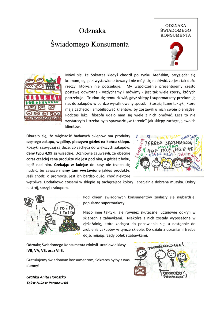 Odznaka ODZNAKA ŚWIADOMEGO KONSUMENTA Świadomego Konsumenta Mówi się, że Sokrates kiedyś chodził po rynku Ateńskim, przyglądał się kramom, oglądał wystawione towary i nie mógł się nadziwić, że jest tak dużo rzeczy, których nie potrzebuje. My współcześnie prezentujemy często postawę odwrotną - wzdychamy i mówimy - jest tak wiele rzeczy, których potrzebuje. Trudno się temu dziwić, gdyż sklepy i supermarkety przekonują nas do zakupów w bardzo wyrafinowany sposób. Stosują liczne taktyki, które mają zachęcić i zmobilizować klientów, by zostawili u nich swoje pieniądze. Podczas lekcji filozofii udało nam się wiele z nich omówić. Lecz to nie wystarczyło i trzeba było sprawdzić „w terenie” jak sklepy zachęcają swoich klientów. Okazało się, że większość badanych sklepów ma produkty częstego zakupu, wędliny, pieczywo gdzieś na końcu sklepu. Koszyki zazwyczaj są duże, co zachęca do większych zakupów. Ceny typu 4,99 są wszędzie. Uczniowie zauważyli, że obecnie coraz częściej cena produktu nie jest pod nim, a gdzieś z boku, bądź nad nim. Czekając w kolejce do kasy nie trzeba się nudzić, bo zawsze mamy tam wystawione jakieś produkty. Jeśli chodzi o promocje, jest ich bardzo dużo, choć niektóre wątpliwe. Dodatkowo czasami w sklepie są zachęcające kolory i specjalnie dobrana muzyka. Dobry nastrój, sprzyja zakupom. Pod okiem świadomych konsumentów znalazły się najbardziej popularne supermarkety. Nieco inne taktyki, ale również skuteczne, uczniowie odkryli w sklepach z zabawkami. Niektóre z nich zostały wyposażone w zjeżdżalnię, która zachęca do pobawienia się, a następnie do zrobienia zakupów w tymże sklepie. Do działu z ubraniami trzeba dojść mijając rzędy półek z zabawkami. Odznakę Świadomego Konsumenta zdobyli uczniowie klasy IVB, VA, VB, oraz VI B. Gratulujemy świadomym konsumentom, Sokrates byłby z was dumny! Grafika Anita Horoszko Tekst Łukasz Przanowski