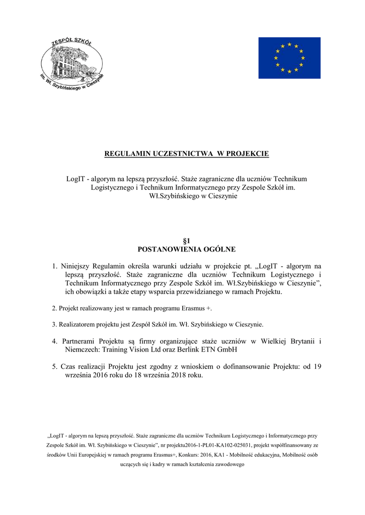 REGULAMIN UCZESTNICTWA W PROJEKCIE LogIT - algorym na lepszą przyszłość. Staże zagraniczne dla uczniów Technikum Logistycznego i Technikum Informatycznego przy Zespole Szkół im. Wł.Szybińskiego w Cieszynie §1 POSTANOWIENIA OGÓLNE 1. Niniejszy Regulamin określa warunki udziału w projekcie pt. „LogIT - algorym na lepszą przyszłość. Staże zagraniczne dla uczniów Technikum Logistycznego i Technikum Informatycznego przy Zespole Szkół im. Wł.Szybińskiego w Cieszynie”, ich obowiązki a także etapy wsparcia przewidzianego w ramach Projektu. 2. Projekt realizowany jest w ramach programu Erasmus +. 3. Realizatorem projektu jest Zespół Szkół im. Wł. Szybińskiego w Cieszynie. 4. Partnerami Projektu są firmy organizujące staże uczniów w Wielkiej Brytanii i Niemczech: Training Vision Ltd oraz Berlink ETN GmbH 5. Czas realizacji Projektu jest zgodny z wnioskiem o dofinansowanie Projektu: od 19 września 2016 roku do 18 września 2018 roku. „LogIT ‐ algorym na lepszą przyszłość. Staże zagraniczne dla uczniów Technikum Logistycznego i Informatycznego przy Zespole Szkół im. Wł. Szybińskiego w Cieszynie”, nr projektu2016-1-PL01-KA102-025031, projekt współfinansowany ze środków Unii Europejskiej w ramach programu Erasmus+, Konkurs: 2016, KA1 - Mobilność edukacyjna, Mobilność osób uczących się i kadry w ramach kształcenia zawodowego §2 DEFINICJE 1. Ilekroć w niniejszym dokumencie jest mowa o Projekcie – należy przez to rozumieć projekt „ LogIT - algorym na lepszą przyszłość. Staże zagraniczne dla uczniów Technikum Logistycznego i Technikum Informatycznego przy Zespole Szkół im. Wł.Szybińskiego w Cieszynie” 2. Ilekroć w niniejszym dokumencie jest mowa o Realizatorze- należy przez to rozumieć Zespół Szkół im. WŁ. Szybińskiego w Cieszynie. 3. Ilekroć w niniejszym dokumencie jest mowa o Partnerach – należy przez to rozumieć podmiot/y wymienione w § 1 ust. 4; 4. Ilekroć w niniejszym dokumencie jest mowa o Uczestniku – należy przez to rozumieć ucznia, który został zakwalifikowany do udziału w Projekcie i zawarł z Realizatorem umowę uczestnictwa; 5. Ilekroć w niniejszym dokumencie jest mowa o Komisji Rekrutacyjnej – należy przez to rozumieć zespół osób powołanych przez Realizatora, weryfikujących dokumenty i zatwierdzających listę uczestników Projektu; 6. Ilekroć w niniejszym dokumencie jest mowa o przygotowaniu do stażu – należy przez to rozumieć zespół form wsparcia oferowany uczestnikom projektu, na który składają się: a) zajęcia mające na celu nabycie umiejętności praktycznych potrzebnych do odbycia stażu, b) pakietu artykułów papierniczych i biurowych oraz pomocy dydaktycznych potrzebnych do udziału zajęciach przygotowujących do stażu i odbycia stażu 7. Ilekroć w niniejszym dokumencie jest mowa o stażu – należy przez to rozumieć zajęcia praktyczne odbywające się w miejscach odbywania stażu, 8. Ilekroć w niniejszym dokumencie jest mowa o godzinie – należy przez to rozumieć godzinę lekcyjną trwającą 45 minut. §3 WARUNKI UDZIAŁU W PROJEKCIE 1. Uczestnikiem Projektu może być osoba, która w chwili podpisywania deklaracji uczestnictwa spełnia łącznie następujące kryteria: a) jest uczniem III klasy Technikum Informatycznego lub Technikum Logistycznego przy Zespole Szkół im. Wł.Szybińskiego w Cieszynie, „LogIT ‐ algorym na lepszą przyszłość. Staże zagraniczne dla uczniów Technikum Logistycznego i Informatycznego przy Zespole Szkół im. Wł. Szybińskiego w Cieszynie”, nr projektu2016-1-PL01-KA102-025031, projekt współfinansowany ze środków Unii Europejskiej w ramach programu Erasmus+, Konkurs: 2016, KA1 - Mobilność edukacyjna, Mobilność osób uczących się i kadry w ramach kształcenia zawodowego b) nie była Uczestnikiem Projektu w poprzednim roku szkolnym; c) przeszła pomyślnie rekrutację do projektu wg Regulaminu Rekrutacji 2. Warunkiem ubiegania się o udział w Projekcie jest złożenie przez Kandydata Realizatorowi następujących dokumentów: a) Formularza zgłoszenia do Projektu b) oświadczenia o wyrażeniu zgody na przetwarzanie danych osobowych c) Kontraktu z Realizatorem 3. Dokumenty, o których mowa w ust. 2 muszą zostać opatrzone podpisem Kandydata. Ponadto w przypadku Kandydata niepełnoletniego, dokumenty o których mowa w ust. 2 lit. b oraz lit. b muszą zostać podpisane przez rodzica Kandydata lub jego opiekuna prawnego. §4 ETAPY UDZIAŁU W PROJEKCIE Udział w projekcie obejmuje następujące etapy: a). przygotowanie do stażu-zajęcia psychologiczno-pedagogiczno-kulturowe i przygotowanie językowe b) odbycie stażu w wyznaczonych miejscach realizacji stażu w Wielskiej Brytanii lub Niemczech c) działania kończące- dyseminacja projektu i jego wyników. d) po zakończeniu udziału w danej formie wsparcia Uczestnik otrzymuje zaświadczenie lub certyfikat. §5 ZAKOŃCZENIE/PRZERWANIE UDZIAŁU W PROJEKCIE Momentem zakończenia uczestnictwa w Projekcie jest zrealizowanie wszystkich działań przewidzianych we wniosku aplikacyjnym Realizatora. 2. Zakończenie udziału w Projekcie przez Uczestnika następuje także w sytuacji: a) przekroczenia liczby dopuszczalnych nieobecności na zajęciach, zgodnie z Kontraktem Uczestnika; b) złożenia oświadczenia o rezygnacji z udziału w Projekcie. 3. Nieuzasadnione przerwanie uczestnictwa w Projekcie skutkuje konsekwencjami finansowymi w postaci obowiązku zwrotu kosztów poniesionych przez Realizatora lub Partnera na realizację wsparcia na rzecz danego Uczestnika zgodnie z zapisami w Kontrakcie z Uczestnikiem. 4.W przypadku wcześniejszego zakończenia udziału w projekcie Uczestnika zostanie on zastąpiony osobą znajdującą się na liście rezerwowej. 1. „LogIT ‐ algorym na lepszą przyszłość. Staże zagraniczne dla uczniów Technikum Logistycznego i Informatycznego przy Zespole Szkół im. Wł. Szybińskiego w Cieszynie”, nr projektu2016-1-