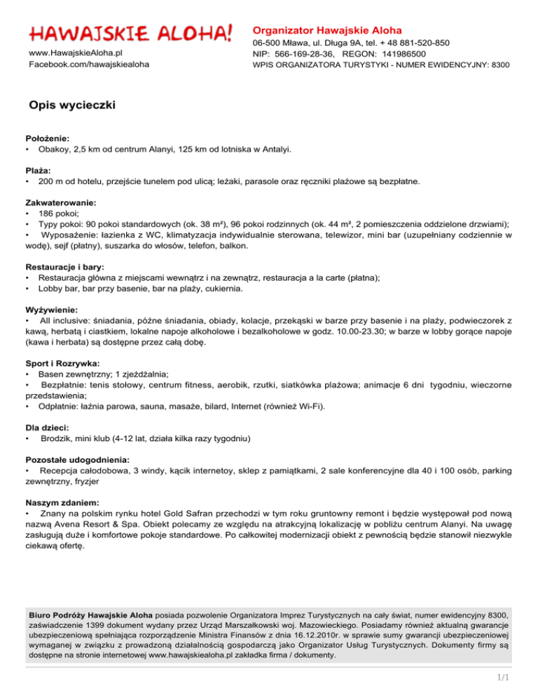 Organizator Hawajskie Aloha www.HawajskieAloha.pl Facebook.com/hawajskiealoha 06-500 Mława, ul. Długa 9A, tel. + 48 881-520-850 NIP: 566-169-28-36, REGON: 141986500 WPIS ORGANIZATORA TURYSTYKI - NUMER EWIDENCYJNY: 8300 Opis wycieczki Położenie: • Obakoy, 2,5 km od centrum Alanyi, 125 km od lotniska w Antalyi. Plaża: • 200 m od hotelu, przejście tunelem pod ulicą; leżaki, parasole oraz ręczniki plażowe są bezpłatne. Zakwaterowanie: • 186 pokoi; • Typy pokoi: 90 pokoi standardowych (ok. 38 m²), 96 pokoi rodzinnych (ok. 44 m², 2 pomieszczenia oddzielone drzwiami); • Wyposażenie: łazienka z WC, klimatyzacja indywidualnie sterowana, telewizor, mini bar (uzupełniany codziennie w wodę), sejf (płatny), suszarka do włosów, telefon, balkon. Restauracje i bary: • Restauracja główna z miejscami wewnątrz i na zewnątrz, restauracja a la carte (płatna); • Lobby bar, bar przy basenie, bar na plaży, cukiernia. Wyżywienie: • All inclusive: śniadania, późne śniadania, obiady, kolacje, przekąski w barze przy basenie i na plaży, podwieczorek z kawą, herbatą i ciastkiem, lokalne napoje alkoholowe i bezalkoholowe w godz. 10.00-23.30; w barze w lobby gorące napoje (kawa i herbata) są dostępne przez całą dobę. Sport i Rozrywka: • Basen zewnętrzny; 1 zjeżdżalnia; • Bezpłatnie: tenis stołowy, centrum fitness, aerobik, rzutki, siatkówka plażowa; animacje 6 dni tygodniu, wieczorne przedstawienia; • Odpłatnie: łaźnia parowa, sauna, masaże, bilard, Internet (również Wi-Fi). Dla dzieci: • Brodzik, mini klub (4-12 lat, działa kilka razy tygodniu) Pozostałe udogodnienia: • Recepcja całodobowa, 3 windy, kącik internetoy, sklep z pamiątkami, 2 sale konferencyjne dla 40 i 100 osób, parking zewnętrzny, fryzjer Naszym zdaniem: • Znany na polskim rynku hotel Gold Safran przechodzi w tym roku gruntowny remont i będzie występował pod nową nazwą Avena Resort & Spa. Obiekt polecamy ze względu na atrakcyjną lokalizację w pobliżu centrum Alanyi. Na uwagę zasługują duże i komfortowe pokoje standardowe. Po całkowitej modernizacji obiekt z pewnością będzie stanowił niezwykle ciekawą ofertę. Biuro Podróży Hawajskie Aloha posiada pozwolenie Organizatora Imprez Turystycznych na cały świat, numer ewidencyjny 8300, zaświadczenie 1399 dokument wydany przez Urząd Marszałkowski woj. Mazowieckiego. Posiadamy również aktualną gwarancje ubezpieczeniową spełniająca rozporządzenie Ministra Finansów z dnia 16.12.2010r. w sprawie sumy gwarancji ubezpieczeniowej wymaganej w związku z prowadzoną działalnością gospodarczą jako Organizator Usług Turystycznych. Dokumenty firmy są dostępne na stronie internetowej www.hawajskiealoha.pl zakładka firma / dokumenty. 1/1