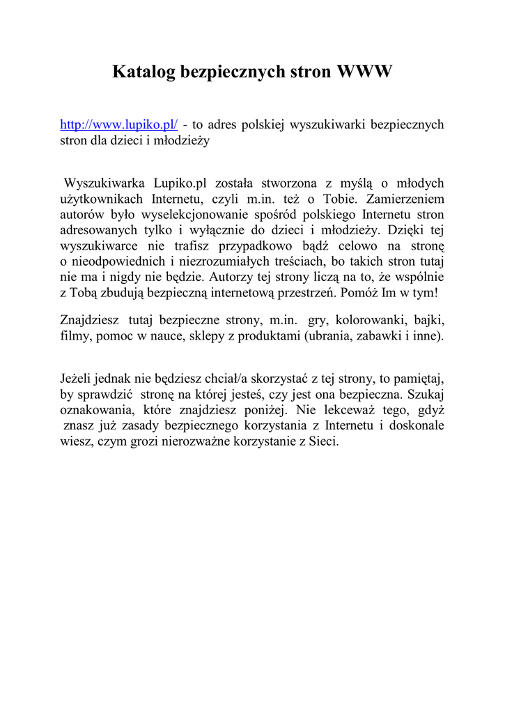 Katalog bezpiecznych stron WWW http://www.lupiko.pl/ - to adres polskiej wyszukiwarki bezpiecznych stron dla dzieci i młodzieży Wyszukiwarka Lupiko.pl została stworzona z myślą o młodych użytkownikach Internetu, czyli m.in. też o Tobie. Zamierzeniem autorów było wyselekcjonowanie spośród polskiego Internetu stron adresowanych tylko i wyłącznie do dzieci i młodzieży. Dzięki tej wyszukiwarce nie trafisz przypadkowo bądź celowo na stronę o nieodpowiednich i niezrozumiałych treściach, bo takich stron tutaj nie ma i nigdy nie będzie. Autorzy tej strony liczą na to, że wspólnie z Tobą zbudują bezpieczną internetową przestrzeń. Pomóż Im w tym! Znajdziesz tutaj bezpieczne strony, m.in. gry, kolorowanki, bajki, filmy, pomoc w nauce, sklepy z produktami (ubrania, zabawki i inne). Jeżeli jednak nie będziesz chciał/a skorzystać z tej strony, to pamiętaj, by sprawdzić stronę na której jesteś, czy jest ona bezpieczna. Szukaj oznakowania, które znajdziesz poniżej. Nie lekceważ tego, gdyż znasz już zasady bezpiecznego korzystania z Internetu i doskonale wiesz, czym grozi nierozważne korzystanie z Sieci.