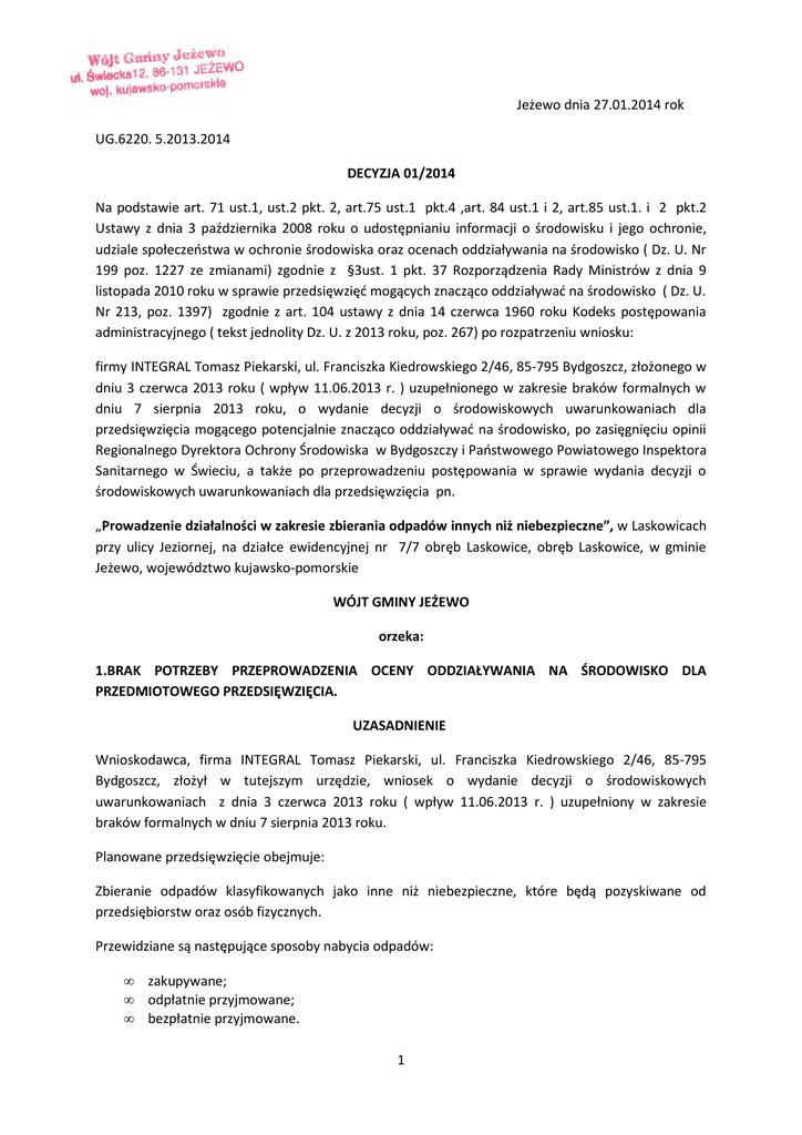 Jeżewo dnia 27.01.2014 rok UG.6220. 5.2013.2014 DECYZJA 01/2014 Na podstawie art. 71 ust.1, ust.2 pkt. 2, art.75 ust.1 pkt.4 ,art. 84 ust.1 i 2, art.85 ust.1. i 2 pkt.2 Ustawy z dnia 3 października 2008 roku o udostępnianiu informacji o środowisku i jego ochronie, udziale społeczeństwa w ochronie środowiska oraz ocenach oddziaływania na środowisko ( Dz. U. Nr 199 poz. 1227 ze zmianami) zgodnie z §3ust. 1 pkt. 37 Rozporządzenia Rady Ministrów z dnia 9 listopada 2010 roku w sprawie przedsięwzięć mogących znacząco oddziaływać na środowisko ( Dz. U. Nr 213, poz. 1397) zgodnie z art. 104 ustawy z dnia 14 czerwca 1960 roku Kodeks postępowania administracyjnego ( tekst jednolity Dz. U. z 2013 roku, poz. 267) po rozpatrzeniu wniosku: firmy INTEGRAL Tomasz Piekarski, ul. Franciszka Kiedrowskiego 2/46, 85-795 Bydgoszcz, złożonego w dniu 3 czerwca 2013 roku ( wpływ 11.06.2013 r. ) uzupełnionego w zakresie braków formalnych w dniu 7 sierpnia 2013 roku, o wydanie decyzji o środowiskowych uwarunkowaniach dla przedsięwzięcia mogącego potencjalnie znacząco oddziaływać na środowisko, po zasięgnięciu opinii Regionalnego Dyrektora Ochrony Środowiska w Bydgoszczy i Państwowego Powiatowego Inspektora Sanitarnego w Świeciu, a także po przeprowadzeniu postępowania w sprawie wydania decyzji o środowiskowych uwarunkowaniach dla przedsięwzięcia pn. „Prowadzenie działalności w zakresie zbierania odpadów innych niż niebezpieczne”, w Laskowicach przy ulicy Jeziornej, na działce ewidencyjnej nr 7/7 obręb Laskowice, obręb Laskowice, w gminie Jeżewo, województwo kujawsko-pomorskie WÓJT GMINY JEŻEWO orzeka: 1.BRAK POTRZEBY PRZEPROWADZENIA OCENY ODDZIAŁYWANIA NA ŚRODOWISKO DLA PRZEDMIOTOWEGO PRZEDSIĘWZIĘCIA. UZASADNIENIE Wnioskodawca, firma INTEGRAL Tomasz Piekarski, ul. Franciszka Kiedrowskiego 2/46, 85-795 Bydgoszcz, złożył w tutejszym urzędzie, wniosek o wydanie decyzji o środowiskowych uwarunkowaniach z dnia 3 czerwca 2013 roku ( wpływ 11.06.2013 r. ) uzupełniony w zakresie braków formalnych w dniu 7 sierpnia 2013 roku. Planowane przedsięwzięcie obejmuje: Zbieranie odpadów klasyfikowanych jako inne niż niebezpieczne, które będą pozyskiwane od przedsiębiorstw oraz osób fizycznych. Przewidziane są następujące sposoby nabycia odpadów: • • • zakupywane; odpłatnie przyjmowane; bezpłatnie przyjmowane. 1 Według dokumentacji stanowiącej załączniki do wniosku, zebrane odpady inne niż niebezpieczne będą wyłącznie czasowo magazynowane wewnątrz istniejącego budynku magazynowego w oznakowanych pojemnikach typu (kontener, beczki lub boksie magazynowym). Inwestor według przedstawionej dokumentacji nie przewiduje montowania żadnej instalacji służącej do segregacji. W zakresie przedsięwzięcia, według złożonych wyjaśnień, w uzupełnieniu do karty informacyjnej przedsięwzięcia, jest przewidziany częściowy proces odzysku ( R12 i R13) i unieszkodliwiania zebranych odpadów na terenie planowanej działalności. Inwestor planuje prowadzenie częściowych procesów odzysku i unieszkodliwiania, określonych w załączniku nr 1 i 2 do ustawy z dnia 14 grudnia 2012 roku (Dz. U. z 2013 roku, poz. 21) polegających na cyt. „ R 12 Wymiana odpadów w celu poddania ich któremukolwiek z procesów wymienionych w pozycji R1-R11****, R13 Magazynowanie odpadów poprzedzających którykolwiek z procesów wymienionych w pozycji R1-R12( z wyjątkiem wstępnego magazynowania u wytwórcy odpadów)” k.cyt. Przedsięwzięcie polega na prowadzeniu działalności gospodarczej w zakresie zbierania odpadów innych niż niebezpieczne i przekazywania – sprzedawania odbiorcom, w ilościach określonych w Karcie informacyjnej przedsięwzięcia załączonej do wniosku oraz uzupełnieniu- wyjaśnieniach z dnia 25.10.2013 roku. Natomiast według danych przedstawionych w dokumentacji przez wnioskodawcę - nie będą w ramach tego zamierzenia prowadzone żadne procesy termiczne ani chemiczne jak również nie przewiduje się cięcia i rozdrabniania odpadów wielkogabarytowych. Poza tym, w ramach realizacji przedsięwzięcia inwestor przewiduje wyposażenie obiektu, w urządzenia służące do transportu wewnątrzzakładowego, w postaci wózka widłowego oraz wózków niskiego podnoszenia – 1 wózek widłowy oraz 3 wózki niskiego podnoszenia. Ponadto przewidziano wyposażenie obiektu w wagę służącą do pomiaru ilości przyjmowanych odpadów, prasę hydrauliczną (belownica) służąca do zagęszczania przyjmowanych odpadów oraz pojemniki służące do magazynowania poszczególnych rodzajów odpadów. Inwestor planuje również według danych z dokumentacji, ustawienie ok. 40 sztuk pojemników z tworzywa sztucznego o pojemności 1000 l oraz ok. 100 sztuk pojemników z tworzywa sztucznego o pojemności 200 l. Działalność tego rodzaju będzie prowadzona przez inwestora w istniejącym obiekcie magazynowym o powierzchni 293,52m2. Załadunek i rozładunek odpadów również danych z dokumentacji będzie się odbywał w hali magazynowej oraz na placu manewrowym przy obiekcie. Przedsięwzięcie projektowane jest zlokalizowane na terenie działki ewidencyjnej nr 7/7 w miejscowości Laskowice, Gmina Jeżewo o powierzchni całkowitej 0,1931 ha, z dostępem dojazdu do drogi gminnej (ul. Jeziorna) w miejscowości Laskowice. 2 Działka ewidencyjna nr 7/7 obręb Laskowice, na której Inwestor zamierza prowadzić tego rodzaju działalność, nie jest objęta aktualnie obowiązującym miejscowym planem zagospodarowania przestrzennego. Przedsięwzięcie zgodnie z załączoną do wniosku dokumentacją, szczególności będzie polegać na pozyskiwaniu odpadów komunalnych i innych niż niebezpieczne, sprawdzaniu w zakresie ewentualnych zanieczyszczeń i zawartości związków mogących powodować zmianę kwalifikacji odpadów np. do grupy odpadów niebezpiecznych, ważeniu, sortowaniu ręcznym, selektywnym magazynowaniu w pojemnikach, kontenerach lub boksach 