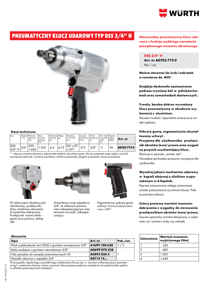 PNEUMATYCZNY KLUCZ UDAROWY TYP DSS 3/4” h Niezawodny pneumatyczny klucz udarowy z funkcją szybkiego narastania początkowego momentu obrotowego. DSS 3/4“ H Art. nr A0703 773 0 Pak. 1 szt. Można stosować do śrub i nakrętek o rozmiarze do M27. Znajduje doskonałe zastosowanie podczas wymiany kół w półciężarówkach oraz samochodach dostawczych. Trwały, bardzo dobrze wyważony klucz pneumatyczny w obudowie wykonanej z aluminium. Wysoka trwałość i optymalnie umieszczony środek ciężkości. Dane techniczne Typ Napęd Moment Max. 4 - kt. roboczy* moment Nm luzujący Nm 350– DSS 1.500 3/4” 1.440 3/4“ H Ciśnienie Waga robocze kg bar 6,3 4,73 Wymiary (L x B x H) mm Zużycie Gwint Min. śred- Poziom powietrza przyłącza nica prze- hałasu l/min. cal wodu dB(A) mm 261 x 87 215 x 227 3/8” 11 96 Art. nr A0703 773 0 *- roboczy moment obrotowy odpowiada średnim warunkom pracy. Na ten parametr mają wpływ czynniki zewnętrzne takie jak: ciśnienie powietrza, średnica przewodu, długość przewodu, zanieczyszczenia. Pokryty gumą, ergonomicznie ukształtowany uchwyt . Przyjazny dla użytkownika przełącznik obrotów lewo/ prawo oraz wygodny przycisk uruchamiający klucz. Eliminuje to zjawisko „zimnej ręki”. Narzędzie jest bardzo poręczne i przyjazne dla użytkownika. Wysokiej jakości mechanizm udarowy w kąpieli olejowej z silnikiem wyposażonym w 6 łopatek. Poprzez zastosowanie stałego smarowania została podwyższona żywotność klucza. Praktycznie bez wibracji. W tylnej części obudowy jest wbudowany przełącznik, który umożliwia ustawianie 4 momentów dokręcania. Przełącznik można obsługiwać przy pomocy jednej ręki. Utwardzony czop napędowy 3/4” ze stalowym pierścieniem zabezpieczającym oraz otworem na sztyft zabezpieczający. Ergonomiczny, pokryty gumą uchwyt. Gwint przyłącza obracany o 360º. J.W. 12.04.2012 - © Akcesoria Opis Art. nr Wtyk szybkozłączki serii 2000 z gwintem zewnętrzmym 3/8” A1699 100 638 Mały naolejacz z gwintem wewnętrznym 3/8” A0699 070 338 Olej specjalny do narzędzi pneumatycznych (1l) A0893 050 5 Nasadki udarowe z napędem 3/4” A0714 14… Pak./szt. 1/3 1 W przypadku regularnego, prawidłowego użytkowania klucza (np: w serwisie wulkanizacyjnym powinien on być codziennie oliwiony. Jest to czynność, którą przeprowadzamy niezależnie od zadania jakie spełnia w układzie pneumatycznym naolejacz. Cztery poziomy wartości momentu dokręcania z wygodny do sterowania przełącznikiem obrotów lewo/ prawo. Zawsze optymalny moment dokręcania w zależności od rozmiaru śruby czy nakrętki. Ustawienie Wartość momentu wyjściowego (Nm) 1 2 3 4 350 685 1.300 1.440