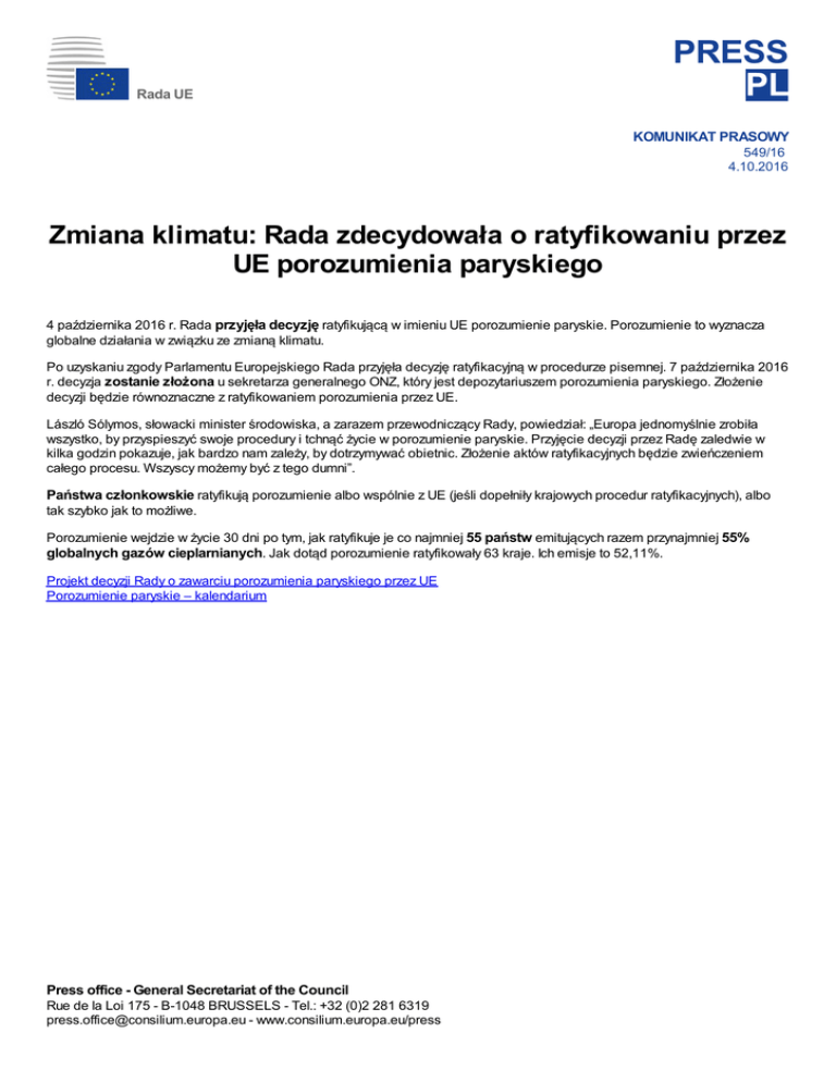 Rada UE PRESS PL KOMUNIKAT PRASOWY 549/16 4.10.2016 Zmiana klimatu: Rada zdecydowała o ratyfikowaniu przez UE porozumienia paryskiego 4 października 2016 r. Rada przyjęła decyzję ratyfikującą w imieniu UE porozumienie paryskie. Porozumienie to wyznacza globalne działania w związku ze zmianą klimatu. Po uzyskaniu zgody Parlamentu Europejskiego Rada przyjęła decyzję ratyfikacyjną w procedurze pisemnej. 7 października 2016 r. decyzja zostanie złożona u sekretarza generalnego ONZ, który jest depozytariuszem porozumienia paryskiego. Złożenie decyzji będzie równoznaczne z ratyfikowaniem porozumienia przez UE. László Sólymos, słowacki minister środowiska, a zarazem przewodniczący Rady, powiedział: „Europa jednomyślnie zrobiła wszystko, by przyspieszyć swoje procedury i tchnąć życie w porozumienie paryskie. Przyjęcie decyzji przez Radę zaledwie w kilka godzin pokazuje, jak bardzo nam zależy, by dotrzymywać obietnic. Złożenie aktów ratyfikacyjnych będzie zwieńczeniem całego procesu. Wszyscy możemy być z tego dumni”. Państwa członkowskie ratyfikują porozumienie albo wspólnie z UE (jeśli dopełniły krajowych procedur ratyfikacyjnych), albo tak szybko jak to możliwe. Porozumienie wejdzie w życie 30 dni po tym, jak ratyfikuje je co najmniej 55 państw emitujących razem przynajmniej 55% globalnych gazów cieplarnianych. Jak dotąd porozumienie ratyfikowały 63 kraje. Ich emisje to 52,11%. Projekt decyzji Rady o zawarciu porozumienia paryskiego przez UE Porozumienie paryskie – kalendarium Press office - General Secretariat of the Council Rue de la Loi 175 - B-1048 BRUSSELS - Tel.: +32 (0)2 281 6319 [email protected] - www.consilium.europa.eu/press