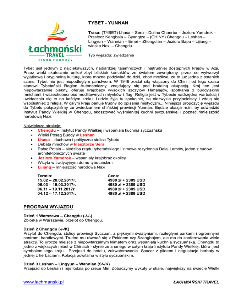 TYBET - YUNNAN Trasa: (TYBET) Lhasa – Sera – Dolina Chaerba – Jezioro Yamdrok – Przełęcz Kangbala – Gyangtze – (CHINY) Chengdu – Leshan – Lingyun – Wannian – Emei – Zhongdian – Jezioro Bapa – Lijiang – wioska Naxi – Chengdu Typ wyjazdu: zwiedzanie Tybet jest jednym z najciekawszych, najbardziej tajemniczych i najtrudniej dostępnych krajów w Azji. Przez wieki skutecznie unikał zbyt bliskich kontaktów ze światem zewnętrzny, przez co wytworzył wyjątkową i oryginalną kulturę, którą można podziwiać do dziś, choć możliwe, że to już jedna z ostanich szans. Tybet nie jest niepodległym państwem. W 1949 został siłą włączony do Chin i od tego czasu stanowi Tybetański Region Autonomiczny, znajdujący się pod brutalną okupacją. Kraj ten jest niepowtarzalnie piękny, oferuje krajobazy wysokich szczytów Himalajów, spotkania z buddyjskimi mnichami i wszechobecność modlitewnych młynków i flag. Religia jest w Tybecie nadrzędną wartością i uwidacznia się to na każdym kroku. Ludzie żyją tu spokojnie, są niezwykle przyjacielscy i zdają się współistnieć z religią. W całym kraju panuje trudny do opisania mistycyzm... Niniejszą propozycję wyjazdu do Tybetu połączyliśmy ze zwiedzaniem chińskiej prowincji Yunnan. Będzie okazja m.in. by odwiedzić Instytut Pandy Wielkiej w Chengdu, skosztować wyśmienitej kuchni syczuańskiej i poznać mniejszość narodową Naxi. Największe atrakcje: Chengdu – Instytut Pandy Wielkiej i wspaniała kuchnia syczuańska Wielki Posąg Buddy w Leshan Lhasa – duchowa i polityczna stolica Tybetu Debata mnichów w klasztorze Sera Pałac Potala – siedziba rządu tybetańskiego i zimowa rezydencja Dalaj Lamów, jeden z cudów architektonicznych świata Jezioro Yamdrok – wspaniały krajobraz okolicy Wizyta w tradycyjnym domu tybetańskim Lijiang – mniejszość narodowa Naxi Termin: 15.02 – 28.02.2017r. 06.03 – 19.03.2017r. 06.11 – 19.11.2017r. 04.12 – 17.12.2017r. Cena: 4980 zł + 2389 USD 4980 zł + 2389 USD 4980 zł + 2389 USD 4980 zł + 2389 USD PROGRAM WYJAZDU Dzień 1 Warszawa – Chengdu (-/-/-) Zbiórka w Warszawie, przelot do Chengdu. Dzień 2 Chengdu (-/-/K) Przylot do Chengdu, stolicy prowincji Syczuan, z pięknymi świątyniami, rozległymi parkami i ogromnymi centrami handlowymi. Trudno mu równać się z Pekinem czy Szanghajem, ale ma do zaoferowania wiele atrakcji. To urocze miejsce z niepowtarzalnym klimatem oraz wspaniałą kuchnią syczuańską. Chengdu to jedno z większych miast w Chinach - słynie ze znanego w całym kraju Instytutu Pandy Wielkiej, która jest symbolem tego kraju. Przejazd do hotelu, zakwaterowanie. Spacer z pilotem i degustacja herbaty w jednej z herbaciarni. Kolacja powitalna w stylu syczuańskim. Dzień 3 Leshan – Lingyun – Wannian (S/-/K) Przejazd do Leshan i rejs łodzią po rzece Min. Zobaczymy wykuty w skale, największy na świecie Wielki www.lachmanski.pl ŁACHMAŃSKI TRAVEL Posąg Buddy, mierzący 71 m. Powstał w czasie panowania dynastii Tang (VII-IX w. n.e.). Posąg ten został wykuty w zboczu klifu, u zbiegu rzek Minjiang, Dadu i Qingyi. Jest to największy wykuty posąg Buddy na świecie. Teren Góry Emei wraz z posągiem Buddy - został wpisany na listę światowego dziedzictwa UNESCO. Przejazd w góry Emei, następnie kolejką linową dojedziemy do najsłynniejszej świątyni Wannian. Kolacja i nocleg w niezwykłym gościńcu w Wannian. Dzień 4 Emei – Chengdu (S/-/K) Wczesnym rankiem oglądanie porannych obrządków w świątyni Wannian. Po śniadaniu zjazd kolejką, a następnie przejazd do Chengdu. Odwiedzimy Panda Research Centre - ośrodek, gdzie naukowcy starają się ratować wymierający gatunek pandy wielkiej i małej (czerwonej). Wszystkie alejki dla zwiedzających obrośnięte są bambusowymi tunelami, które dodatkowo zatrzymują wilgoć. Trasa prowadzi alejkami instytutu do najciekawszych miejsc. Zwiedzający zobaczą więc dorosłe pandy podczas ich śniadania, pandzie przedszkole... Nocleg w Chengdu. Dzień 5 Chengdu – (TYBET) Lhasa (S/-/K) Transfer na lotnisko w Chengdu i przelot do Lhasy, leżącej na wysokości 3683 m n.p.m., która przez całe wieki była polityczną i duchową stolicą Tybetu, sercem i duszą Kraju Na Dachu Świata, siedzibą Dalaj Lamów, celem niezliczonych pielgrzymek, a do dziś jest miastem jednego z największych cudów świata. Transfer do hotelu, zakwaterowanie, aklimatyzacja. Spacer z pilotem i pierwsze smakowanie atmosfery tego niezwykłego miejsca. Nocleg w Lhasie. Dzień 6 Lhasa – klasztor Sera (S/-/K) Po śniadaniu zwiedzanie Pałacu Norbulingka, pełniącego funkcję letniego pałacu. Następnie zobaczymy inny ważny zabytek Lhasy - świątynię Jokhang, jedno z najświętszych miejsc kultu w Tybecie. Została ona zbudowana 1300 lat temu dla upamiętnienia małżeństwa króla Songstena Gampo z chińską księżniczką Tang-Wen Cheng. Tam znajduje się złoty posąg Buddy Shakyamuni, którego wykonanie przypisuje się samemu Buddzie. Przejazd do klasztoru Sera, który obok klasztoru Drepung, stanowi jeden z dwóch największych klasztorów Lhasy, szkoły Gelugpa. Został on ufundowany w 1419 roku przez ucznia Tsongkhapy. W czasach jego świetności mieszkało tam ok. 5 tys. mnichów, a dziś mieszka ich kilkuset. Klasztor Sera znany jest z debat mnichów, które odbywają się każdego dnia w południe na klasztornym dziedzińcu. Nocleg w Lhasie. Dzień 7 Lhasa – Dolina Chaerba (S/-/K) Zwiedzanie najsłynniejszego zabytku Lhasy - jednego z cudów architektonicznych świata i głównej atrakcji Lhasy - Pałacu Potala, zbudowanego w XVII wieku przez V Dalaj Lamę, pełniącego funkcję siedziby rządu tybetańskiego i zimowej rezydencji Dalaj Lamów. Monumentalna budowla Pałacu Potala zawieszona jest na zboczu Góry Czerwonej, ma 13 pięter, ok. 1000 pokojów, niezliczoną ilość kaplic. Tam również mieszczą się grobowce ośmiu Dalaj Lamów. Następnie wyjazd do 