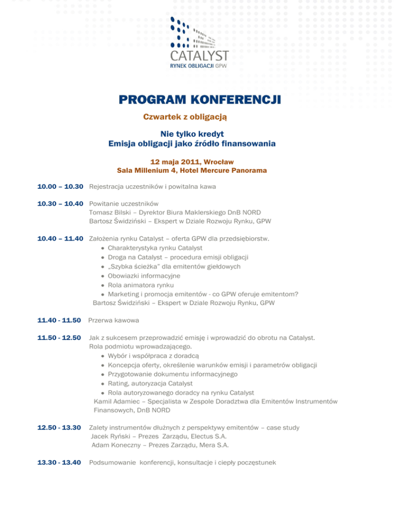 Czwartek z obligacją Nie tylko kredyt Emisja obligacji jako źródło finansowania 12 maja 2011, Wrocław Sala Millenium 4, Hotel Mercure Panorama 10.00 – 10.30 Rejestracja uczestników i powitalna kawa 10.30 – 10.40 Powitanie uczestników Tomasz Bilski – Dyrektor Biura Maklerskiego DnB NORD Bartosz Świdziński – Ekspert w Dziale Rozwoju Rynku, GPW 10.40 – 11.40 Założenia rynku Catalyst – oferta GPW dla przedsiębiorstw. Charakterystyka rynku Catalyst Droga na Catalyst – procedura emisji obligacji „Szybka ścieżka” dla emitentów giełdowych Obowiazki informacyjne Rola animatora rynku Marketing i promocja emitentów - co GPW oferuje emitentom? Bartosz Świdziński – Ekspert w Dziale Rozwoju Rynku, GPW 11.40 - 11.50 Przerwa kawowa 11.50 - 12.50 Jak z sukcesem przeprowadzić emisję i wprowadzić do obrotu na Catalyst. Rola podmiotu wprowadzającego. Wybór i współpraca z doradcą Koncepcja oferty, określenie warunków emisji i parametrów obligacji Przygotowanie dokumentu informacyjnego Rating, autoryzacja Catalyst Rola autoryzowanego doradcy na rynku Catalyst Kamil Adamiec – Specjalista w Zespole Doradztwa dla Emitentów Instrumentów Finansowych, DnB NORD 12.50 - 13.30 Zalety instrumentów dłużnych z perspektywy emitentów – case study Jacek Ryński – Prezes Zarządu, Electus S.A. Adam Koneczny – Prezes Zarządu, Mera S.A. 13.30 - 13.40 Podsumowanie konferencji, konsultacje i ciepły poczęstunek