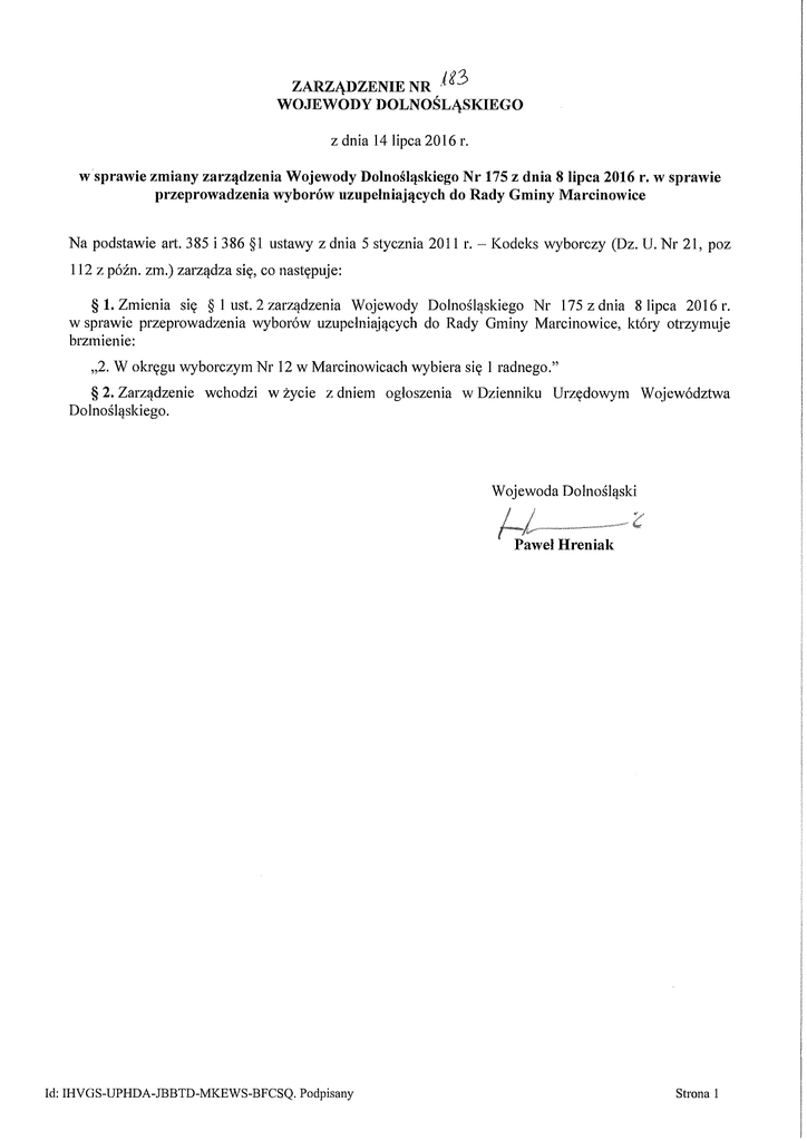 ZARZĄDZENIE NR ^ WOJEWODY DOLNOŚLĄSKIEGO z dnia 14 lipca 2016 r. w sprawie zmiany zarządzenia Wojewody Dolnośląskiego Nr 175 z dnia 8 lipca 2016 r. w sprawie przeprowadzenia wyborów uzupełniających do Rady Gminy Marcinowice Na podstawie art. 385 i 386 §1 ustawy z dnia 5 stycznia 2011 r. - Kodeks wyborczy (Dz. U. N r 21, poz 112 z późn. zm.) zarządza się, co następuje: § 1. Zmienia się § 1 ust. 2 zarządzenia Wojewody Dolnośląskiego Nr 175 z dnia 8 lipca 2016 r. w sprawie przeprowadzenia wyborów uzupełniających do Rady Gminy Marcinowice, który otrzymuje brzmienie: „2. W okręgu wyborczym Nr 12 w Marcinowicach wybiera się 1 radnego.” § 2. Zarządzenie wchodzi w życie z dniem ogłoszenia w Dzienniku Urzędowym Województwa Dolnośląskiego. Wojewoda Dolnośląski Paweł Hreniak Id: IHVGS-UPHDA-JBBTD-MKEWS-BFCSQ. Podpisany Strona 1