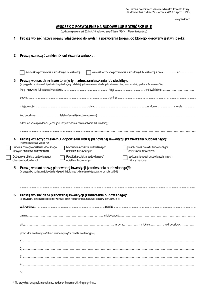 Załączniki do rozporządzenia Ministra Infrastruktury i Budownictwa z dnia 24 sierpnia 2016 r. (poz. 1493) Załącznik nr 1 WNIOSEK O POZWOLENIE NA BUDOWĘ LUB ROZBIÓRKĘ (B-1) (podstawa prawna: art. 32 i art. 33 ustawy z dnia 7 lipca 1994 r. – Prawo budowlane) 1. Proszę wpisać nazwę organu właściwego do wydania pozwolenia (organ, do którego kierowany jest wniosek): ................................................................................................................................................................................................................................................... 2. Proszę oznaczyć znakiem X cel złożenia wniosku: Wniosek o pozwolenie na budowę lub rozbiórkę Wniosek o zmianę pozwolenia na budowę lub rozbiórkę z dnia ...................nr................... 3. Proszę wpisać dane inwestora (w tym adres zamieszkania lub siedziby): (w przypadku konieczności podania danych drugiego lub kolejnych inwestorów lub danych pełnomocnika, dane te należy podać w formularzu B-4) imię i nazwisko lub nazwa inwestora:................................................................ kraj: .......................................... województwo: ...……………………………… powiat: ............................................................................................................... gmina: ............................................................................................................ miejscowość: ........................................................................ ulica: ........................................................................nr domu: ................... nr lokalu: ................. kod pocztowy: .............................. telefon/e-mail (nieobowiązkowo): ....................................................................................................................................... adres do korespondencji (jeżeli jest inny niż adres zamieszkania lub siedziby): ……………………………………………………………………………………… .......................................................................................................………………………………………………………………………………………………………. 4. Proszę oznaczyć znakiem X odpowiedni rodzaj planowanej inwestycji (zamierzenia budowlanego): (można zaznaczyć więcej niż 1) Budowa nowego obiektu budowlanego /nowych obiektów budowlanych Rozbudowa obiektu budowlanego/ obiektów budowlanych Nadbudowa obiektu budowlanego/ obiektów budowlanych Odbudowa obiektu budowlanego/ obiektów budowlanych Rozbiórka obiektu budowlanego/ obiektów budowlanych Wykonanie robót budowlanych innych niż wymienione 5. Proszę wpisać nazwę planowanej inwestycji (zamierzenia budowlanego)1): (w przypadku konieczności podania większej ilości danych, dane te należy podać w formularzu B-4) ................................................................................................................................................................................................................................................... ................................................................................................................................................................................................................................................... 6. Proszę wpisać dane planowanej inwestycji (zamierzenia budowlanego): (w przypadku konieczności podania większej liczby nieruchomości, należy je podać w formularzu B-4) województwo: .............................................................................................. powiat: ................................................................................................................. gmina: …………………………………………………….……………..……… miejscowość: …………………………………………………………………………… ulica: …………………………………………………………………………...…………… nr domu: …………… nr lokalu: …………… kod pocztowy: …….……… jednostka ewidencyjna/obręb ewidencyjny/nr działki ewidencyjnej: 1) ……………………………………………………………………………………………………………………………………………………………….……………….. 2) ……………………………………………………………………………………………………………………………………………………………….……………….. 3) ……………………………………………………………………………………………………………………………………………………………….……………….. 4) ……………………………………………………………………………………………………………………………………………………………….……………….. 5) ……………………………………………………………………………………………………………………………………………………………….……………….. 1) Na przykład: budynek mieszkalny, budynek inwentarski, droga gminna. 7. Proszę wskazać załączniki do wniosku: (w przypadku konieczności wskazania większej liczby załączników, dane te należy podać w formularzu B-4) 1) ........................................................................................................................................................................................................................................... 2) …………………………………………………………………………………………………………………………………………………………