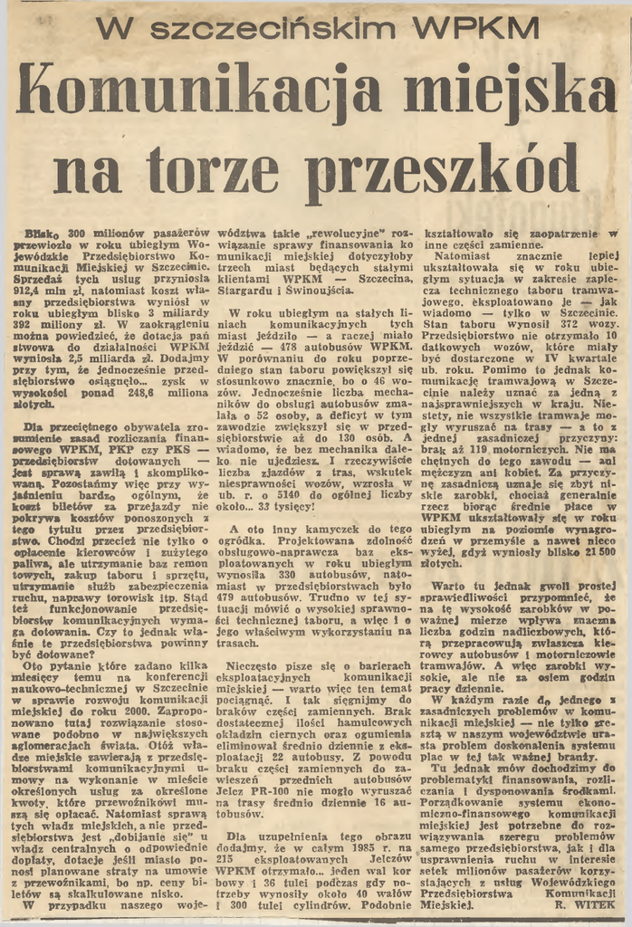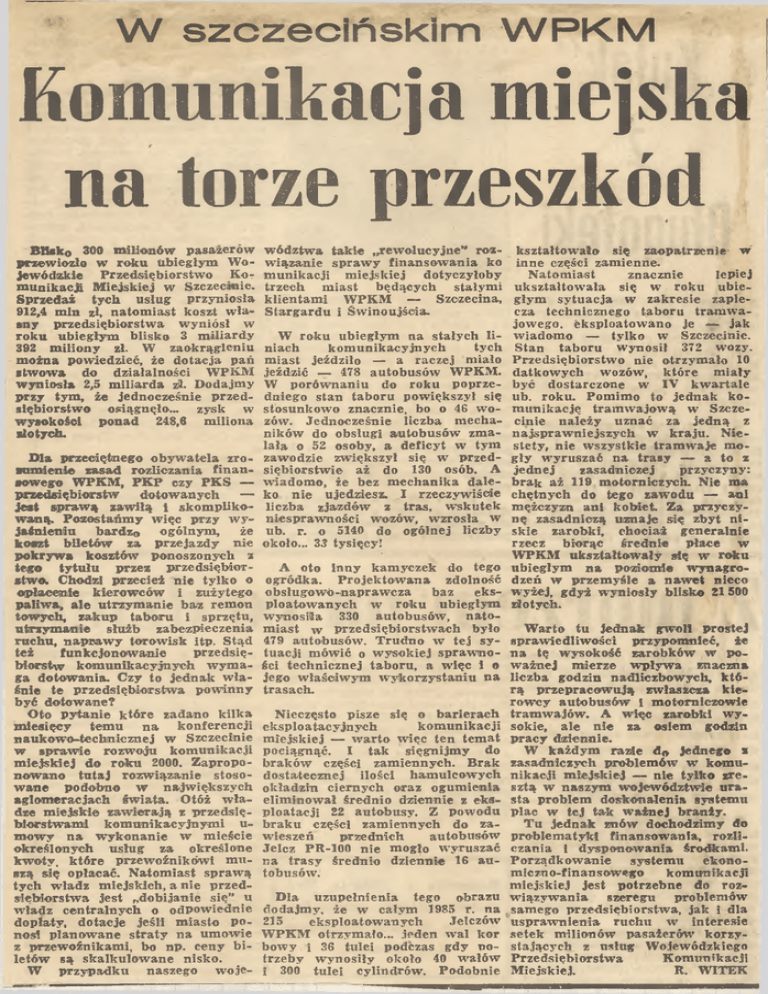 W szczecińskim W P K M Komunikacja miejska na torze przeszkód B lisk o 300 m ilion ów pasażerów przew iozło w roku Ubiegłym Wo jew ódzk ie Przedsiębiorstw o K o m u n ikacji M iejskiej w Szczecinie. Sprzedaż tych usług przyniosła 912,4 m in zł, natom iast koszt w ła sn y przedsiębiorstw a w yn ió sł w roku ub iegłym blisko 3 m iliardy 392 m ilion y zł. W zaokrągleniu m ożna pow iedzieć, że dotacja pań itw o w a do działalności WPKM w y n io sła 2,5 m iliarda zł. Dodajm y przy tym , że jednocześnie przed siębiorstw o osiągnęło™ zysk w w ysok ości ponad 248,6 m iliona sto tych. D la przeciętnego ob yw atela zro zu m ienie zasad rozliczania fin a n sow ego WPKM, PK P czy PK S — przedsiębiorstw dotow anych — je st spraw ą zaw iłą i skom p lik o w an ą. P ozostańm y w ięc przy w y ja śn ien iu bardzo ogólnym , że k oszt b iletów za przejazdy nie pokryw a kosztów ponoszonych z tego tytu łu przez przedsiębior stw o. Chodzi przecież n ie tylk o o opłacenie k ierow ców i zużytego p aliw a, a le utrzym anie baz remon tow ych, zakup taboru i sprzętu, utrzym anie służb zabezpieczenia ruchu, n ap raw y torow isk itp. Stąd też funkcjonow anie przedsię biorstw kom unikacyjnych w y m a ga dotow ania. Czy to jednak w ła śnie te przedsiębiorstw a pow in n y b yć dotow ane? O to p ytan ie które zadano k ilk a m iesięcy tem u n a konferencji nau kow o-technicznej w Szczecinie w spraw ie rozw oju kom unikacji m iejsk iej do roku 2000. Zapropo n ow ano tu taj rozw iązanie stoso w a n e podobno w najw ięk szych aglom eracjach św iata. Otóż w ła dze m iejsk ie zaw ierają z przedsię biorstw am i k om unikacyjnym i um o w y n a w ykonanie w m ieście określonych usług za określone kw oty, które przew oźników ! m u szą się opłacać. N atom iast spraw ą tych w ładz m iejskich, a nie przed sięb iorstw a jest „dobijanie się ” u w ład z centralnych o odpow iednie dopłaty, dotacje jeśli m iasto po nosi planow ane straty na um ow ie z przew oźnikam i, bo np. ceny b i letó w są skalku low ane nisko. W przypadku naszego w oje w ód ztw a tak ie „rew olucyjne” roz kształtow ało się zaopatrzenie w w iązanie sp raw y fin an sow an ia ko inne części zam ienne. N atom iast znacznie lepiej m unikacji m iejskiej dotyczyłoby trzech m iast będących stałym i ukształtow ała się w roku ubie klientam i W PKM — Szczecina, głym sytuacja w zakresie zaple cza technicznego taboru tram w a Stargardu i Św inoujścia. jow ego. eksploatow ano je — jak W roku ubiegłym na stałych li w iadom o — tylko w Szczecinie. niach kom unikacyjnych tych Stan taboru w y n osił 372 w ozy. m iast jeździło — a raczej miało P rzedsiębiorstw o nie otrzym ało 10 jeździć — 478 autobusów WPKM. datkow ych w ozów , które m iały W porów naniu do roku poprze być dostarczone w IV kw artale dniego stan taboru pow iększy! się ub. roku. Pom im o to jednak ko stosunkow o znacznie, bo o 46 w o m unikację tram w ajow ą w Szcze zów. Jednocześnie liczba m echa cin ie należy uznać za jedną z ników do obsługi autobusów zm a najspraw niejszych w kraju. N ie lała o 52 osoby, a d eficyt w tym stety, nie w szystk ie tram w aje m o zaw odzie zw ięk szył się w przed g ły w yruszać na trasy — a to z zasadniczej przyczyny: sięb iorstw ie aż do 130 osób. A jednej w iadom o, że bez m echanika dale brak aż 119 m otorniczych. N ie ma ko n ie ujedziesz. I rzeczyw iście ch ętn ych do te go zaw odu — auł liczba zjazdów z tras, w skutek m ężczyzn ani kobiet. Za przyczy niespraw ności w ozów , w zrosła w n ę zasadniczą uznaje się zbyt n i ub. r. o 5140 do ogólnej liczby skie zarobki, chociaż generalnie rzecz biorąc średnie płace w około... 33 tysięcy! WPKM u k ształtow ały się w roku A oto Inny kam yczek do tego ubiegłym n a poziom ie w ynagro ogródka. P rojektow ana zdolność dzeń w przem yśle a n aw et nieco obsługow ó-napraw cza baz eks w yżej, gdyż w y n io sły blisko 21500 ploatow anych w roku ubiegłym złotych. w y n o siła 330 autobusów , nato W arto tu jednak gw ol! prostej m iast w przedsiębiorstw ach było 479 autobusów. Trudno w tej sy sp raw ied liw ości przypom nieć, że tuacji m ów ić o w y so k iej spraw no n a tę w ysok ość zarobków w po ści technicznej taboru, a w ięc i o w ażn ej m ierze w p ły w a znaczna jego w łaściw ym w ykorzystaniu na liczba godzin nadliczbow ych, k tó trasach. rą przepracow ują zw łaszcza k ie row cy autobusów I m otorniczow ie N ieczęsto pisze się o barierach tram w ajów . A w ięc zarobki w y ek sploatacyjnych kom unikacji sokie, ale n ie za osiem godzin m iejsk iej — w arto w ięc ten tem at pracy dziennie. W każdym razie dn jednego i pociągnąć. I tak sięgn ijm y do braków części zam iennych. Brak zasadniczych problem ów w kom u dostatecznej ilości ham ulcow ych nikacji m iejsk iej — nie tylk o zre okładzin ciernych oraz ogum ienia sztą w naszym w ojew ód ztw ie u ra elim in ow ał średnio dziennie z eks sta problem doskonalenia system u ploatacji 22 autobusy. Z pow odu plac w tej tak w ażn ej branży. T u jednak znów dochodzim y do braku części zam iennych do za w ieszeń przednich autobusów problem atyki finansow ania, rozli Jelcz PR-100 nie m ogło w yruszać czania 1 d ysponow ania środkam i. system u ekono na trasy średnio dziennie 16 au Porządkow anie m iczno-finansow ego kom unikacji tobusów. m iejsk iej jest potrzebne do roz szeregu problem ów D la uzupełnienia tego obrazu w iązyw an ia dodajm y, że w całym 1985 r. ria .sam ego przedsiębiorstw a, jak i dla 215 eksploatow anych Jelczów u spraw nienia ruchu w interesie W PKM otrzym ało... jeden w a l kor setek m ilion ów pasażerów korzy bow y i 36 tulei podczas gdy po stających z usług W ojew ódzkiego K om unikacji trzeby w y n o siły około 40 w ałów Przedsiębiorstw a R. WITEK i 300 tu lei cylindrów . Podobnie M iejskiej.