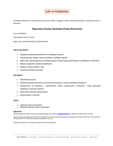 Do międzynarodowej firmy o ugruntowanej pozycji na rynku polskim, działającej w branży materiałów budowlanych, poszukujemy osoby na stanowisko: Regionalny Dyrektor Sprzedaży (Polska Wschodnia) Nr ref. /1016/RDS-W Data publikacji oferty: 03.10.2016 Miejsce pracy: dowolna lokalizacja ( Polska Wschodnia) Zakres obowiązków: Zarządzanie sprzedażą produktów firmy w podległym obszarze Przygotowywanie strategii prognoz sprzedaży w podległym regionie Nadzór nad i odpowiedzialność za realizację budżetu (budżet zespołu regionalnego), we współpracy z hurtowniami Bieżące zarządzanie zespołem sprzedażowym Dbałość o rozwój udziałów w rynku Analizowanie działań konkurencji Wymagania: Wykształcenie wyższe Kilkuletnie doświadczenie pracy na stanowisku kierowniczym w branży materiałów budowlanych Doświadczenie we współpracy z dystrybutorami, firmami wykonawczymi, inwestorami i innymi podmiotami związanymi z procesem inwestycji Bardzo dobre zdolności interpersonalne Dyspozycyjność i mobilność Oferta: Atrakcyjne warunki zatrudnienia Możliwość dalszego rozwoju zawodowego Zgłoszenia: Osoby zainteresowane ofertą, prosimy o przesłanie aktualnego CV na adres: [email protected] i wpisanie w temacie maila nr ref. oferty. Wyrażam zgodę na przetwarzanie moich danych osobowych dla potrzeb procesu rekrutacji zgodnie z Ustawą z dnia 29 sierpnia 1997 roku o ochronie danych osobowych (Dz.U.02.101.926 tekst jednolity z późniejszymi zmianami)". Uprzejmie informujemy, że skontaktujemy się tylko z wybranymi kandydatami. _________________________________________________________________________________________________________________________________ HR INTEGRAM Executive Search Usługi dla Rad Nadzorczych Rozwiązania rekrutacyjne HR Management Outsourcing Outplacement