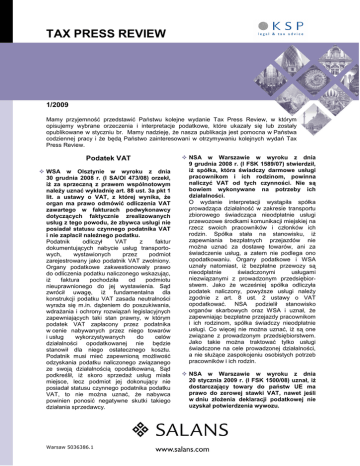 TAX PRESS REVIEW 1/2009 Mamy przyjemność przedstawić Państwu kolejne wydanie Tax Press Review, w którym opisujemy wybrane orzeczenia i interpretacje podatkowe, które ukazały się lub zostały opublikowane w styczniu br. Mamy nadzieję, Ŝe nasza publikacja jest pomocna w Państwa codziennej pracy i Ŝe będą Państwo zainteresowani w otrzymywaniu kolejnych wydań Tax Press Review. Podatek VAT WSA w Olsztynie w wyroku z dnia 30 grudnia 2008 r. (I SA/Ol 473/08) orzekł, iŜ za sprzeczną z prawem wspólnotowym naleŜy uznać wykładnię art. 88 ust. 3a pkt 1 lit. a ustawy o VAT, z której wynika, Ŝe organ ma prawo odmówić odliczenia VAT zawartego w fakturach podwykonawcy dotyczących faktycznie zrealizowanych usług z tego powodu, Ŝe zbywca usługi nie posiadał statusu czynnego podatnika VAT i nie zapłacił naleŜnego podatku. Podatnik odliczył VAT z faktur dokumentujących nabycie usług transportowych, wystawionych przez podmiot zarejestrowany jako podatnik VAT zwolniony. Organy podatkowe zakwestionowały prawo do odliczenia podatku naliczonego wskazując, iŜ faktura pochodziła od podmiotu nieuprawnionego do jej wystawienia. Sąd zwrócił uwagę, iŜ fundamentalna dla konstrukcji podatku VAT zasada neutralności wyraŜa się m.in. dąŜeniem do poszukiwania, wdraŜania i ochrony rozwiązań legislacyjnych zapewniających taki stan prawny, w którym podatek VAT zapłacony przez podatnika w cenie nabywanych przez niego towarów i usług wykorzystywanych do celów działalności opodatkowanej nie będzie stanowił dla niego ostatecznego kosztu. Podatnik musi mieć zapewnioną moŜliwość odzyskania podatku naliczonego związanego ze swoją działalnością opodatkowaną. Sąd podkreślił, iŜ skoro sprzedaŜ usług miała miejsce, lecz podmiot jej dokonujący nie posiadał statusu czynnego podatnika podatku VAT, to nie moŜna uznać, Ŝe nabywca powinien ponosić negatywne skutki takiego działania sprzedawcy. Warsaw 5036386.1 NSA w Warszawie w wyroku z dnia 9 grudnia 2008 r. (I FSK 1589/07) stwierdził, iŜ spółka, która świadczy darmowe usługi pracownikom i ich rodzinom, powinna naliczyć VAT od tych czynności. Nie są bowiem wykonywane na potrzeby ich działalności. O wydanie interpretacji wystąpiła spółka prowadząca działalność w zakresie transportu zbiorowego świadcząca nieodpłatnie usługi przewozowe środkami komunikacji miejskiej na rzecz swoich pracowników i członków ich rodzin. Spółka stała na stanowisku, iŜ zapewniania bezpłatnych przejazdów nie moŜna uznać za dostawę towarów, ani za świadczenie usług, a zatem nie podlega ono opodatkowaniu. Organy podatkowe i WSA uznały natomiast, iŜ bezpłatne przewozy są nieodpłatnie świadczonymi usługami niezwiązanymi z prowadzonym przedsiębiorstwem. Jako Ŝe wcześniej spółka odliczyła podatek naliczony, powyŜsze usługi naleŜy zgodnie z art. 8 ust. 2 ustawy o VAT opodatkować. NSA podzielił stanowisko organów skarbowych oraz WSA i uznał, Ŝe zapewniając bezpłatne przejazdy pracownikom i ich rodzinom, spółka świadczy nieodpłatnie usługi. Co więcej nie moŜna uznać, iŜ są one związane z prowadzonym przedsiębiorstwem. Jako takie moŜna traktować tylko usługi świadczone na cele prowadzonej działalności, a nie słuŜące zaspokojeniu osobistych potrzeb pracowników i ich rodzin. NSA w Warszawie w wyroku z dnia 20 stycznia 2009 r. (I FSK 1500/08) uznał, iŜ dostarczający towary do państw UE ma prawo do zerowej stawki VAT, nawet jeśli w dniu złoŜenia deklaracji podatkowej nie uzyskał potwierdzenia wywozu. O wydanie interpretacji wnioskowała spółka dostarczająca produkty podmiotom z innych państw Unii. Zdaniem spółki, w przypadku, gdy w momencie składania deklaracji VAT-7 za dany okres rozliczeniowy nie posiada ona wszystkich dokumentów potwierdzających dokonanie wewnątrzwspólnotowej dostawy, w ewidencji podatkowej powinna wykazać takie transakcje jako dostawy na terytorium kraju. Nie musi ich jednak wykazywać w deklaracji VAT-7, ani uiszczać podatku. Ministerstwo Finansów oraz WSA uznały jednak, iŜ w powyŜszej sytuacji w deklaracji VAT-7 spółka powinna wykazać dostawę krajową i zapłacić naleŜny podatek. NSA podzielił stanowisko spółki. Wskazał, iŜ brak dokumentów potwierdzających wywóz towarów przed złoŜeniem deklaracji podatkowej za dany okres rozliczeniowy, gdy faktycznie nastąpił wywóz w ramach wewnątrzwspólnotowej dostawy towarów, nie powoduje powstania obowiązku opodatkowania takiej transakcji zgodnie z zasadami właściwymi dla dostaw krajowych, przy zastosowaniu stawki 22%. Zgodnie z art. 42 ust. 12 ustawy o VAT spółka musi jedynie ująć taką transakcję w ewidencji podatkowej jako dostawę krajową. ETS w wyroku z dnia 15 stycznia 2009 r. w sprawie spółki K-1 (C-502/07) orzekł, iŜ dodatkowe zobowiązanie podatkowe w podatku VAT nie jest sprzeczne z prawem wspólnotowym. Urząd skarbowy stwierdził, iŜ spółka zawyŜyła w deklaracji podatek naliczony i określił za ten miesiąc dodatkowe zobowiązanie podatkowe. Spółka wniosła odwołanie do Izby Skarbowej, a następnie skargę do WSA, zarzucając niezgodność dodatkowej sankcji podatkowej z przepisami wspólnotowymi. Ani organ podatkowy drugiej instancji ani WSA nie podzieliły stanowiska spółki, która wniosła skargę kasacyjną. NSA zwrócił się do ETS Warsaw 5036386.1 z pytaniem prejudycjalnym. Trybunał stwierdził, iŜ dodatkowe zobowiązanie podatkowe nie ma cech podatku VAT, a w szczególności zdarzeniem podatkowym powodującym powstanie tego zobowiązania jest błąd w deklaracji podatkowej, a nie czynność opodatkowana. Ponadto kwota zobowiązania nie jest określana proporcjonalnie do ceny otrzymanej przez podatnika. A zatem nie jest to podatek a sankcja administracyjna nakładana w razie stwierdzenia, Ŝe podatnik zadeklarował kwotę zwrotu róŜnicy VAT lub zwrotu podatku naliczonego wyŜszą od kwoty naleŜnej. ETS pod