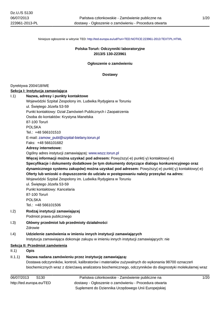 Dz.U./S S130 06/07/2013 223961-2013-PL Państwa członkowskie - Zamówienie publiczne na dostawy - Ogłoszenie o zamówieniu - Procedura otwarta 1/20 Niniejsze ogłoszenie w witrynie TED: http://ted.europa.eu/udl?uri=TED:NOTICE:223961-2013:TEXT:PL:HTML Polska-Toruń: Odczynniki laboratoryjne 2013/S 130-223961 Ogłoszenie o zamówieniu Dostawy Dyrektywa 2004/18/WE Sekcja I: Instytucja zamawiająca I.1) Nazwa, adresy i punkty kontaktowe Wojewódzki Szpital Zespolony im. Ludwika Rydygiera w Toruniu ul. Świętego Józefa 53-59 Punkt kontaktowy: Dział Zamówień Publicznych i Zaopatrzenia Osoba do kontaktów: Krystyna Manelska 87-100 Toruń POLSKA Tel.: +48 566101510 E-mail: [email protected] Faks: +48 566101682 Adresy internetowe: Ogólny adres instytucji zamawiającej: www.wszz.torun.pl Więcej informacji można uzyskać pod adresem: Powyższy(-e) punkt(-y) kontaktowy(-e) Specyfikacje i dokumenty dodatkowe (w tym dokumenty dotyczące dialogu konkurencyjnego oraz dynamicznego systemu zakupów) można uzyskać pod adresem: Powyższy(-e) punkt(-y) kontaktowy(-e) Oferty lub wnioski o dopuszczenie do udziału w postępowaniu należy przesyłać na adres: Wojewódzki Szpital Zespolony im. Ludwika Rydygiera w Toruniu ul. Świętego Józefa 53-59 Punkt kontaktowy: Kancelaria 87-100 Toruń POLSKA Tel.: +48 566101506 I.2) Rodzaj instytucji zamawiającej Podmiot prawa publicznego I.3) Główny przedmiot lub przedmioty działalności Zdrowie I.4) Udzielenie zamówienia w imieniu innych instytucji zamawiających Instytucja zamawiająca dokonuje zakupu w imieniu innych instytucji zamawiających: nie Sekcja II: Przedmiot zamówienia II.1) Opis II.1.1) Nazwa nadana zamówieniu przez instytucję zamawiającą: Dostawa odczynników, kontroli, kalibratorów i materiałów zużywalnych do wykonania 98700 oznaczeń biochemicznych wraz z dzierżawą analizatora biochemicznego, odczynników do diagnostyki molekularnej wraz 06/07/2013 S130 http://ted.europa.eu/TED Państwa członkowskie - Zamówienie publiczne na dostawy - Ogłoszenie o zamówieniu - Procedura otwarta Suplement do Dziennika Urzędowego Unii Europejskiej 1/20 Dz.U./S S130 06/07/2013 223961-2013-PL Państwa członkowskie - Zamówienie publiczne na dostawy - Ogłoszenie o zamówieniu - Procedura otwarta 2/20 z dzierżawą aparatu do diagnostyki molekularnej metodą Real Time PCR i testów do oznaczania przeciwciał wraz z dzierżawą analizatora do badań immunodiagnostycznych met. fluoroimmunoenzymatyczną. II.1.2) Rodzaj zamówienia oraz lokalizacja robót budowlanych, miejsce realizacji dostawy lub świadczenia usług Dostawy Kupno Główne miejsce lub lokalizacja robót budowlanych, miejsce realizacji dostawy lub świadczenia usług: Magazyny zlokalizowane na terenie siedzib Zamawiającego przy ul. Św. Józefa 53-59 i przy ul. Krasińskiego 4/4a. Kod NUTS II.1.3) Informacje na temat zamówienia publicznego, umowy ramowej lub dynamicznego systemu zakupów (DSZ) Ogłoszenie dotyczy zamówienia publicznego II.1.4) Informacje na temat umowy ramowej II.1.5) Krótki opis zamówienia lub zakupu Przedmiotem zamówienia jest: Zadanie Nr 1 - dostawa odczynników, kontroli, kalibratorów i materiałów zużywalnych do wykonania 98700 oznaczeń biochemicznych wraz z dzierżawą analizatora biochemicznego; Zadanie Nr 2 - dostawa odczynników do diagnostyki molekularnej wraz z dzierżawą aparatu do diagnostyki molekularnej metodą Real Time PCR; Zadanie Nr 3 - dostawa testów do oznaczania przeciwciał wraz z dzierżawą analizatora do badań immunodiagnostycznych met. fluoroimmunoenzymatyczną. Zadanie Nr 1: I. Odczynniki 1. Albumina ** - 3 000 oznaczeń 2. Aminotransferaza alaninowa - 19 000 oznaczeń 3. Aminotransferaza asparaginowa - 11 000 oznaczeń 4. Amylaza - 4 500 oznaczeń 5. Białko całkowite - 4 500 oznaczeń 6. Białko w moczu / PMR ** - 2 000 oznaczeń 7. Bilirubina całkowita - 8 000 oznaczeń 8. Cholesterol całkowity - 1 500 oznaczeń 9. CRP HS (CRP ultraczułe) - 7 500 oznaczeń 10. Fosfataza alkaliczna - 4 000 oznaczeń 11. GGTP - 6 000 oznaczeń 12. Glukoza - 9 000 oznaczeń 13. Kreatynina - 9 000 oznaczeń 14. Magnez * - 1 000 oznaczeń 15. Mocznik - 5 500 oznaczeń 16. Trójglicerydy * - 1 200 oznaczeń 17. Wapń całkowity * - 800 oznaczeń 18. Żelazo - 1 200 oznaczeń Uwaga: 1. Podane ilości testów nie uwzględniają ilości testów potrzebnych do wykonania kalibracji i kontroli (wewnętrznej i zewnętrznej). 2. Częstotliwość kontroli wewnętrznej: 06/07/2013 S130 http://ted.europa.eu/TED Państwa członkowskie - Zamówienie publiczne na dostawy - Ogłoszenie o zamówieniu - Procedura otwarta Suplement do Dziennika Urzędowego Unii Europejskiej 2/20 Dz.U./S S130 06/07/2013 223961-2013-PL Państwa członkowskie - Zamówienie publiczne na dostawy - Ogłoszenie o zamówieniu - Procedura otwarta 3/20 2.1 dla testów oznaczonych „ * ” – 2 x w tygodniu na 2 poziomach kontroli 2.2. dla pozostałych testów – 6 razy w tygodniu na 2 poziomach kontroli 3. Częstotliwość kontroli zewnętrznej: 3.1 kontrola krajowa dla wszystkich parametrów poza parametrami oznaczonymi „*” i „**” – 2 x w miesiącu na 2 poziomach kontroli. Specyfikacja techniczna analizatora biochemicznego I. Charakterystyka analizatora i dodatkowe wymagania 1. W pełni automatyczny analizator biochemiczny, data produkcji nie wcześniej niż 2011 r. 2. Analizator do postawienia na stole laboratoryjnym 3. Praca w systemie odczynnikowym całkowicie otwartym – otwarte wszystkie kanały aplikacyjne. 4. Analizator pracujący w zakresie pomiarowym o długości fali: minimum 340-650 nm. 5. Wydajność analizatora: minimum 200 testów fotometrycznych na godzinę, bez ISE 6. Wykorzystywane metody pomiarowe: - kinetyczna - punktu końcowego - turbidymetryczna 7. Możliwość wykonywania badań w materiale: - surowicy - osoczu - moczu - płynie mózgowo-rdzeniowym 8. Możliwość wykonywania badań w zakresie: - substraty - enzymy - białka specyficzne 9. Syst