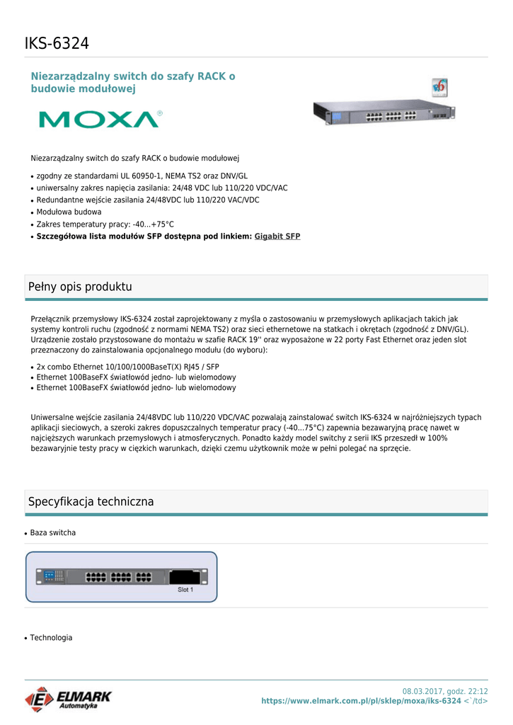 IKS-6324 Niezarządzalny switch do szafy RACK o budowie modułowej Niezarządzalny switch do szafy RACK o budowie modułowej ● zgodny ze standardami UL 60950-1, NEMA TS2 oraz DNV/GL ● uniwersalny zakres napięcia zasilania: 24/48 VDC lub 110/220 VDC/VAC ● Redundantne wejście zasilania 24/48VDC lub 110/220 VAC/VDC ● Modułowa budowa ● Zakres temperatury pracy: -40...+75°C ● Szczegółowa lista modułów SFP dostępna pod linkiem: Gigabit SFP Pełny opis produktu Przełącznik przemysłowy IKS-6324 został zaprojektowany z myśla o zastosowaniu w przemysłowych aplikacjach takich jak systemy kontroli ruchu (zgodność z normami NEMA TS2) oraz sieci ethernetowe na statkach i okrętach (zgodność z DNV/GL). Urządzenie zostało przystosowane do montażu w szafie RACK 19'' oraz wyposażone w 22 porty Fast Ethernet oraz jeden slot przeznaczony do zainstalowania opcjonalnego modułu (do wyboru): ● ● ● 2x combo Ethernet 10/100/1000BaseT(X) RJ45 / SFP Ethernet 100BaseFX światłowód jedno- lub wielomodowy Ethernet 100BaseFX światłowód jedno- lub wielomodowy Uniwersalne wejście zasilania 24/48VDC lub 110/220 VDC/VAC pozwalają zainstalować switch IKS-6324 w najróżniejszych typach aplikacji sieciowych, a szeroki zakres dopuszczalnych temperatur pracy (-40...75°C) zapewnia bezawaryjną pracę nawet w najcięższych warunkach przemysłowych i atmosferycznych. Ponadto każdy model switchy z serii IKS przeszedł w 100% bezawaryjnie testy pracy w cięzkich warunkach, dzięki czemu użytkownik może w pełni polegać na sprzęcie. Specyfikacja techniczna ● Baza switcha ● Technologia 08.03.2017, godz. 22:12 https://www.elmark.com.pl/pl/sklep/moxa/iks-6324 <`/td> Standards IIEEE 802.3 for 10BaseT IEEE 802.3u for 100BaseT(X) and 100Base FX IEEE 802.3ab for 1000BaseT(X) IEEE 802.3z for 1000BaseSX/LX/LHX/ZX IEEE 802.3x for Flow Control Flow Control IEEE 802.3x flow control, back pressure flow control ● Interfejsy RJ45 Ports 10/100BaseT(X) or 10/100/1000BaseT(X) auto negotiation speed, F/H duplex mode and auto MDI/MDI-X connection Fiber Port(s) 100BaseFX (SC/ST connector) or 1000BaseSFP slots LED Indicators STAT, PWR1, PWR2, FAULT, LNK/ACT, FDX/HDX, SPEED ● Zasilanie Input Voltage 12/24/48 VDC (9 to 60 V), or 110/220 VDC/VAC (88 to 300 VDC and 85 to 264 VAC) Input Current (all ports are equipped with fiber) Max. 0.68 A @ 24 VDC Max. 0.35 A @ 48 VDC Max. 0.17/0.11 A @ 110/220 VDC Max. 0.33/0.23 A @ 110/220 VAC Overload Current Protection Present Connection 10-pin terminal block Reverse Polarity Protection Present ● Obudowa i instalacja Casing IP30 protection Dimensions (W x H x D) 440 x 44 x 254 mm (17.32 x 1.73 x 10.00 in) Weight 4300 g Installation 19'' rack mounting ● Warunki zewnętrzne Operating Temperature -40 to 75°C (-40 to 167°F) Storage Temperature -40 to 85°C (-40 to 185°F) Ambient Relative Humidity 5 to 95% (non-condensing) 08.03.2017, godz. 22:12 https://www.elmark.com.pl/pl/sklep/moxa/iks-6324 <`/td> ● Certyfikaty i gwarancja EMI FCC Part 15, CISPR (EN55022) class A Safety UL60950-1, CSA C22.2 No. 60950-1, EN60950-1 (Pending) Martitime DNV (Pending), GL (Pending) Traffic Control NEMA TS2 (Pending) Shock & Vibration EN50155 Rail Traffic EN50155/EN50121-4 Modele Akcesoria i dodatki Symbol Opis PM-7200-2GTXSFP moduł interfejsowy: 2 porty combo 10/100/1000BaseTx/1000BaseSFP PM-7200-2MSC moduł interfejsowy: 2 porty światłowodowe wielomodowe SC PM-7200-2MST moduł interfejsowy: 2 porty światłowodowe wielomodowe ST PM-7200-2SSC moduł interfejsowy: 2 porty światłowodowe jednomodowe SC PM-7200-1MSC moduł interfejsowy: 1 port światłowodowy wielomodowy SC PM-7200-1MST moduł interfejsowy: 1 port światłowodowy wielomodowy ST Zawartość zestawu ● ● ● 1x baza switcha modułowego IKS-6726 Hardware installation guide Uchwyty do montażu w szafie rack 08.03.2017, godz. 22:12 https://www.elmark.com.pl/pl/sklep/moxa/iks-6324 <`/td>