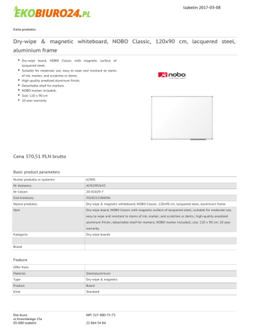 Izabelin 2017-03-08 Karta produktu: Dry-wipe & magnetic whiteboard, NOBO Classic, 120x90 cm, lacquered steel, aluminium frame Dry-wipe board, NOBO Classic with magnetic surface of lacquered steel; Suitable for moderate use, easy to wipe and resistant to stains of ink, marker, and scratches or dents; High-quality anodized aluminum finish; Detachable shelf for markers NOBO marker included; Size: 120 x 90 cm 10 year warranty Cena 370,51 PLN brutto Basic product parameters Numer produktu w systemie 62905 Nr dostawcy ACN1902643 Nr Celcen 20-01029-7 Kod kreskowy 5028252286046 Nazwa produktu Dry-wipe & magnetic whiteboard, NOBO Classic, 120x90 cm, lacquered steel, aluminium frame Opis Dry-wipe board, NOBO Classic with magnetic surface of lacquered steel;; suitable for moderate use, easy to wipe and resistant to stains of ink, marker, and scratches or dents;; high-quality anodized aluminum finish;; detachable shelf for markers; NOBO marker included;; size: 120 x 90 cm; 10 year warranty Kategoria Dry-wipe boards Brand Feature Offer from Material Steel/aluminium Type Dry-wipe & magnetic Product Board Kind Standard Eko biuro ul Krasińskiego 23a 05-080 Izabelin NIP: 527-000-75-75 22 864 54 84 Izabelin 2017-03-08 Karta katalogowa produktu cd. Dry-wipe & magnetic whiteboard, NOBO Classic, 120x90 cm, lacquered steel, aluminium frame Procurement vocabulary CPV 30195900-1 Tablice do pisania i tablice magnetyczne Certifications Warranty 10 Hit Standard New product New Colour Colour White Dimensions Dimensions (mm) 1200x900 Pozostałe zdjęcia produktu Eko biuro ul Krasińskiego 23a 05-080 Izabelin NIP: 527-000-75-75 22 864 54 84 Izabelin 2017-03-08 Serdecznie zapraszamy do współpracy Eko biuro zespół. Eko biuro ul Krasińskiego 23a 05-080 Izabelin NIP: 527-000-75-75 22 864 54 84