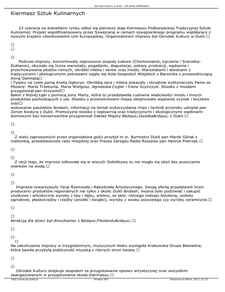 Ośrodek Kultury w Dukli - OK Dukla ZAPRASZA! Kiermasz Sztuk Kulinarnych 23 czerwca na dukielskim rynku odbył się pierwszy etap Kiermaszu Podkarpackiej Tradycyjnej Sztuki Kulinarnej. Projekt współfinansowany przez Szwajcarię w ramach szwajcarskiego programu współpracy z nowymi krajami członkowskimi Unii Europejskiej. Organizatorem imprezy był Ośrodek Kultury w Dukli. Podczas imprezy, koncertowały zaproszone zespoły ludowe (Chorkowianie, Łęczanie i SzarotkaDuklanie), obywały się liczne warsztaty, pogadanki, degustacje, pokazy produkcji, wędzenia i przechowywania płodów rolnych, obróbki mleka i serów oraz miodu. Warsztatami i stoiskami z tradycyjnymi i ekologicznymi potrawami zajęły się Koła Gospodyń Wiejskich z Barwinka z przewodniczącą Anną Delimatą i Tylawy na czele panią Anetą Gęborys. Obróbkę sera i mleka pokazały i skrzętnie wytłumaczyły Panie ze Mszany: Maria Trzebunia, Maria Wielgosz, Agnieszka Cygler i Irena Szymczyk. Stoisko z miodami przygotował pan Krzysztof Bałon z Niżnej Łąki z pomocą żony Marty, która to przedstawiła cudowne właściwości miodu i innych produktów pochodzących z ula. Stoisko z przetwórstwem mięsa obejmowało wędzenie szynek i boczków oraz wekowanie pasztetów – informacji na temat wykorzystania mięs i technik przerobu udzielał pan Zenon Kostyra z Dukli. Promocyjne stoisko z wędzarnią oraz tradycyjnymi i ekologicznymi wędlinami domowymi bez konserwantów przygotował Zakład Mięsny „Jasiołka” z Dukli. Z wielu zaproszonych przez organizatora gości przybył m.in. Burmistrz Dukli pan Marek Górak z małżonką, przedstawiciele rady miejskiej oraz Prezes Zarządu Radia Rzeszów pan Henryk Pietrzak. Z racji tego, że impreza odbywała się w wieczór Sobótkowy to nie mogło się obyć bez puszczania wianków na wodę. Imprezie towarzyszyły Targi Rzemiosła i Rękodzieła Artystycznego. Swoją ofertę przedstawili liczni producenci produktów regionalnych nie tylko z okolic Dukli – można było podziwiać i zakupić użytkowe i artystyczne wyroby z lipy i dębu, wikliny, ze skór, różnego rodzaju biżuterię, ozdoby ogrodowe, płaskorzeźby i rzeźby (aniołki i świątki), wyroby z wosku pszczelego czy wyroby ceramiczne. Atrakcją dla dzieci był dmuchaniec z „Fikolandu”. Na zakończenie imprezy w trzygodzinnym, muzycznym bloku wystąpiła Krakowska Grupa Biesiadna, która bawiła przybyłą publiczność muzyką z różnych stron świata. Ośrodek Kultury dziękuje zespołom za przygotowanie oprawy artystycznej oraz wszystkim zaangażowanym w przygotowanie stoisk kiermaszu. http://www.ok.dukla.pl Kreator PDF Utworzono 8 March, 2017, 22:12 Ośrodek Kultury w Dukli - OK Dukla ZAPRASZA! Galeria zdjęć http://www.ok.dukla.pl Kreator PDF Utworzono 8 March, 2017, 22:12