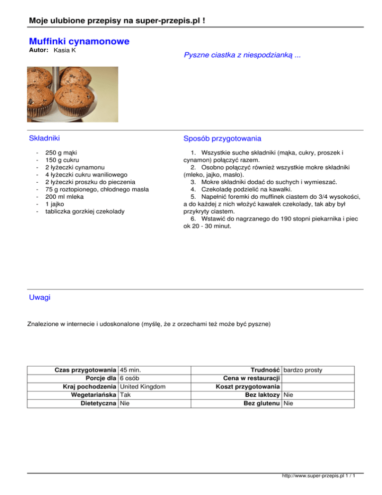 Moje ulubione przepisy na super-przepis.pl ! Muffinki cynamonowe Autor: Kasia K Pyszne ciastka z niespodzianką ... Składniki - Sposób przygotowania 250 g mąki 150 g cukru 2 łyżeczki cynamonu 4 łyżeczki cukru waniliowego 2 łyżeczki proszku do pieczenia 75 g roztopionego, chłodnego masła 200 ml mleka 1 jajko tabliczka gorzkiej czekolady 1. Wszystkie suche składniki (mąka, cukry, proszek i cynamon) połączyć razem. 2. Osobno połączyć również wszystkie mokre składniki (mleko, jajko, masło). 3. Mokre składniki dodać do suchych i wymieszać. 4. Czekoladę podzielić na kawałki. 5. Napełnić foremki do muffinek ciastem do 3/4 wysokości, a do każdej z nich włożyć kawałek czekolady, tak aby był przykryty ciastem. 6. Wstawić do nagrzanego do 190 stopni piekarnika i piec ok 20 - 30 minut. Uwagi Znalezione w internecie i udoskonalone (myślę, że z orzechami też może być pyszne) Czas przygotowania Porcje dla Kraj pochodzenia Wegetariańska Dietetyczna 45 min. 6 osób United Kingdom Tak Nie Trudność bardzo prosty Cena w restauracji Koszt przygotowania Bez laktozy Nie Bez glutenu Nie http://www.super-przepis.pl 1 / 1