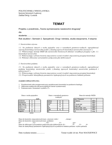 POLITECHNIKA WROCŁAWSKA Instytut Inżynierii Lądowej Zakład Dróg i Lotnisk TEMAT Projektu z przedmiotu „Teoria wymiarowania nawierzchni drogowej” dla studenta:........................................................................................................................ Rok studiów I. Semestr 2. Specjalność: Drogi i lotniska, studia stacjonarne, II stopnia 1. Nawierzchnie sztywne. 1.1. Na podstawie danych o ruchu pojazdów oraz o warunkach gruntowo-wodnych, zaprojektować sztywną konstrukcję nawierzchni jezdni („Katalog typowych konstrukcji nawierzchni sztywnych”). 1.2. Wykorzystując metodę OSŻD dla nawierzchni betonowych dokonać weryfikacji przyjętej w pkt. 1.1. konstrukcji nawierzchni. 1.3. Wykorzystując wybrane kryteria zmęczeniowe ocenić trwałość zmęczeniową przyjętej konstrukcji. 1.4. Wykonać obliczenia wytrzymałości połączenia płyt dyblowanych 2. Nawierzchnie podatne. 2.1. Na podstawie danych o ruchu pojazdów oraz o warunkach gruntowo-wodnych, zaprojektować podatną konstrukcję nawierzchni jezdni („Katalog typowych konstrukcji nawierzchni podatnych i półsztywnych”). 2.2. Wykorzystując wybrane kryteria zmęczeniowe ocenić trwałość zmęczeniową przyjętej konstrukcji. 2.3. Przeprowadzić identyfikacja parametrów lepkosprężystych na podstawie badania pełzania ZAKRES OPRACOWANIA 1. Przedstawienie toku postępowania przy projektowaniu konstrukcji na podstawie katalogu. 2. Obliczenia analityczne dla poszczególnych metod wymiarowania. 3. Podsumowanie i komentarz wyników (*). Dane o ruchu pojazdów: Dane o warunkach gruntowowodnych: SDR osobowe dostawcze cięż. bez p. cięż.p. 4 oś cięż.p. 5 oś autobusy ciągniki b c d e f g h suma wykop nasyp pzw kb WP CBR PL m m m m % Dane do metody OSŻD: wsp. Poissona E betonu Et E chudy bet. E bet. asf. E grunt stab. cem. E krusz.stab. mech. ∆T MPa MPa MPa MPa MPa MPa stop. Dane do kryteriów zmęczeniowych (naw. sztywne): σobc= , σtemp= Dane do kryteriów zmęczeniowych (naw. podatne): PI= , Va= , Vb= , E= , eps= Dane do obliczenia wytrzymałości połączenia płyt dyblowanych: K= , P= , E= , d= Dane do identyfikacji parametrów lepkosprężystych na podstawie badania pełzania: wykres pełzania Data wydania tematu:............... Temat wydał: dr inż. Piotr MACKIEWICZ