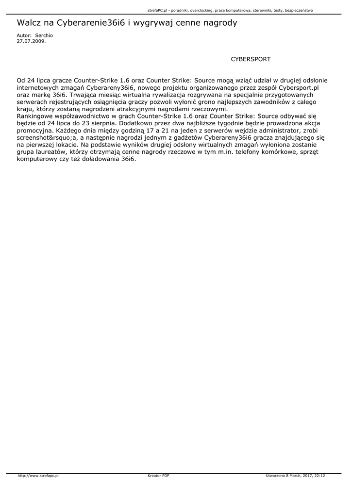 strefaPC.pl - poradniki, overclocking, prasa komputerowa, sterowniki, testy, bezpieczeństwo Walcz na Cyberarenie36i6 i wygrywaj cenne nagrody Autor: Serchio 27.07.2009. CYBERSPORT Od 24 lipca gracze Counter-Strike 1.6 oraz Counter Strike: Source mogą wziąć udział w drugiej odsłonie internetowych zmagań Cyberareny36i6, nowego projektu organizowanego przez zespół Cybersport.pl oraz markę 36i6. Trwająca miesiąc wirtualna rywalizacja rozgrywana na specjalnie przygotowanych serwerach rejestrujących osiągnięcia graczy pozwoli wyłonić grono najlepszych zawodników z całego kraju, którzy zostaną nagrodzeni atrakcyjnymi nagrodami rzeczowymi. Rankingowe współzawodnictwo w grach Counter-Strike 1.6 oraz Counter Strike: Source odbywać się będzie od 24 lipca do 23 sierpnia. Dodatkowo przez dwa najbliższe tygodnie będzie prowadzona akcja promocyjna. Każdego dnia między godziną 17 a 21 na jeden z serwerów wejdzie administrator, zrobi screenshot’a, a następnie nagrodzi jednym z gadżetów Cyberareny36i6 gracza znajdującego się na pierwszej lokacie. Na podstawie wyników drugiej odsłony wirtualnych zmagań wyłoniona zostanie grupa laureatów, którzy otrzymają cenne nagrody rzeczowe w tym m.in. telefony komórkowe, sprzęt komputerowy czy też doładowania 36i6. http://www.strefapc.pl Kreator PDF Utworzono 8 March, 2017, 22:12