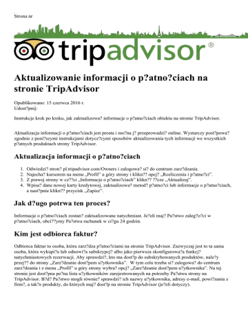 Strona nr Aktualizowanie informacji o p?atno?ciach na stronie TripAdvisor Opublikowano: 15 czerwca 2016 r. Udost?pnij: Instrukcje krok po kroku, jak zaktualizowa? informacje o p?atno?ciach obiektu na stronie TripAdvisor. Aktualizacja informacji o p?atno?ciach jest prosta i mo?na j? przeprowadzi? online. Wystarczy post?powa? zgodnie z poni?szymi instrukcjami dotycz?cymi sposobów aktualizowania tych informacji we wszystkich p?atnych produktach strony TripAdvisor. Aktualizacja informacji o p?atno?ciach 1. 2. 3. 4. Odwiedzi? stron? pl.tripadvisor.com/Owners i zalogowa? si? do centrum zarz?dzania. Najecha? kursorem na menu „Profil” u góry strony i klikn?? opcj? „Rozliczenia i p?atno?ci”. Z prawej strony w cz??ci „Informacje o p?atno?ciach” klikn?? ??cze „Aktualizuj”. Wpisa? dane nowej karty kredytowej, zaktualizowa? metod? p?atno?ci lub informacje o p?atno?ciach, a nast?pnie klikn?? przycisk „Zapisz”. Jak d?ugo potrwa ten proces? Informacje o p?atno?ciach zostan? zaktualizowane natychmiast. Je?eli maj? Pa?stwo zaleg?o?ci w p?atno?ciach, obci??ymy Pa?stwa rachunek w ci?gu 24 godzin. Kim jest odbiorca faktur? Odbiorca faktur to osoba, która zarz?dza p?atno?ciami na stronie TripAdvisor. Zazwyczaj jest to ta sama osoba, która wykupi?a lub odnowi?a subskrypcj? albo jako pierwsza skonfigurowa?a funkcj? natychmiastowych rezerwacji. Aby sprawdzi?, kto ma dost?p do subskrybowanych produktów, nale?y przej?? do strony „Zarz?dzanie dost?pem u?ytkownika”. W tym celu trzeba si? zalogowa? do centrum zarz?dzania i z menu „Profil” u góry strony wybra? opcj? „Zarz?dzanie dost?pem u?ytkownika”. Na tej stronie jest dost?pna pe?na lista u?ytkowników zarejestrowanych na potrzeby Pa?stwa strony na TripAdvisor. B?d? Pa?stwo mogli równie? sprawdzi? ich nazwy u?ytkownika, adresy e-mail, powi?zania z firm?, a tak?e produkty, do których maj? dost?p na stronie TripAdvisor (je?eli dotyczy). Czy mog? mie? przypisanych kilka kart na stronie TripAdvisor? Tak, mo?na mie? przypisanych kilka kart, jednak tylko jedna z nich mo?e by? ustawiona jako domy?lna na potrzeby p?atno?ci. Odbiorca faktur przypisany do obiektu mo?e w dowolnym momencie zaktualizowa? wybran? domy?ln? kart?. Nie widz? opcji „Rozliczenia i p?atno?ci”. Co zrobi? w takiej sytuacji? Prawdopodobnie nie s? Pa?stwo zarejestrowani jako odbiorca faktur na potrzeby swojego obiektu na stronie TripAdvisor. W takim przypadku nale?y poprosi? odbiorc? faktur o zalogowanie si? do centrum zarz?dzania i zaktualizowanie informacji o p?atno?ciach zgodnie z powy?sz? instrukcj?. Je?eli ta osoba nie powinna ju? zarz?dza? fakturami i p?atno?ciami, mog? Pa?stwo przes?a? wniosek o zmian? odbiorcy faktur za po?rednictwem centrum zarz?dzania. W?a?ciciele z subskrypcj? og?osze? biznesowych*: Aby zmieni? w?a?ciciela subskrypcji p?atnego produktu takiego jak og?oszenia biznesowe, nale?y przes?a? zg?oszenie za po?rednictwem internetowego dzia?u obs?ugi klienta. Oto jak nale?y to zrobi?: 1. 2. 3. 4. 5. Odwiedzi? centrum zarz?dzania W polu „Skontaktuj si? ze stron? TripAdvisor” klikn?? przycisk „Napisz do nas”. W polu „Prosimy o informacj?, na czym polega problem” wybra? pozycj? „Og?oszenia biznesowe”. Jako podtemat wybra? „Aktualizacja ustawie? dost?pu do konta”. W polu „Komentarze” wpisa? wszystkie informacje dotycz?ce proponowanej zmiany. * Pocz?wszy od stycznia 2017 roku og?oszenia biznesowe zostan? zast?pione now? ekscytuj?c? subskrypcj? przeznaczon? dla przedstawicieli obiektów: Biznes Plus strony TripAdvisor. Wi?cej informacji na ten temat mo?na uzyska? tutaj. W?a?ciciele z subskrypcj? Biznes Plus: 1. 2. 3. 4. 5. Odwiedzi? centrum zarz?dzania W polu „Skontaktuj si? z witryn? TripAdvisor” klikn?? przycisk „Napisz do nas”. W polu „Prosimy o informacj?, na czym polega problem” wybra? pozycj? „Biznes Plus”. Jako podtemat wybra? „Aktualizacja ustawie? dost?pu do konta”. W polu „Komentarze” wpisa? wszystkie informacji dotycz?ce proponowanej zmiany. W?a?ciciele z natychmiastowymi rezerwacjami: 1. Odwiedzi? centrum zarz?dzania. 2. W polu „Skontaktuj si? z witryn? TripAdvisor” klikn?? przycisk „Napisz do nas”. 3. W polu „Prosimy o informacj?, na czym polega problem” wybra? pozycj? „Pomoc zwi?zana z platform? TripConnect”. 4. Wybra? „Natychmiastowe rezerwacje na platformie TripConnect”. 5. W polu komentarza opisa? problem. Informacje o stronie TripAdvisor TripAdvisor® to najwi?ksza na ?wiecie strona turystyczna**, która pozwala podró?nym w pe?ni wykorzysta? ka?d? podró?. Mo?na na niej znale?? sprawdzone porady milionów podró?nych, szeroki wachlarz us?ug u?atwiaj?cych planowanie wyjazdu, a tak?e zintegrowane narz?dzia pozwalaj?ce dokonywa? rezerwacji i przeszukiwa? setki witryn w celu znalezienia najlepszych cen obowi?zuj?cych w hotelach. Witryny wspó?pracuj?ce ze stron? TripAdvisor tworz? najwi?ksz? spo?eczno?? podró?nych na ?wiecie. S? one odwiedzane ?rednio 390 milionów razy miesi?cznie* i mo?na na nich znale?? 435 milionów recenzji oraz opinii na temat 6,8 miliona obiektów zakwaterowania, restauracji i atrakcji. Nasze witryny s? dost?pne na 49 rynkach na ca?ym ?wiecie. TripAdvisor: Dowiedzcie si? wi?cej. Rezerwujcie lepiej. Podró?ujcie ?atwiej. TripAdvisor, Inc. (NASDAQ:TRIP) za po?rednictwem swoich spó?ek zale?nych obs?uguje witryny 24 innych marek z bran?y turystycznej: www.airfarewatchdog.com, www.bookingbuddy.com, www.citymaps.com, www.cruisecritic.com, www.familyvacationcritic.com, www.flipkey.com, www.thefork.com (w tym www.lafourchette.com, www.eltenedor.com, www.iens.nl, www.besttables.com i www.dimmi.com.au), www.gateguru.com, www.holidaylettings.co.uk, www.holidaywatchdog.com, www.housetrip.com, www.independenttraveler.com, www.jetsetter.com, www.niumba.com, www.onetime.com, www.oyster.com , www.seatguru.com, www.smartertravel.com, www.tingo.com, www.travelpod.com, www.tripbod.com, www.vacationhomerentals.com, www.viator.com oraz www.virtualtourist.com. *?r
