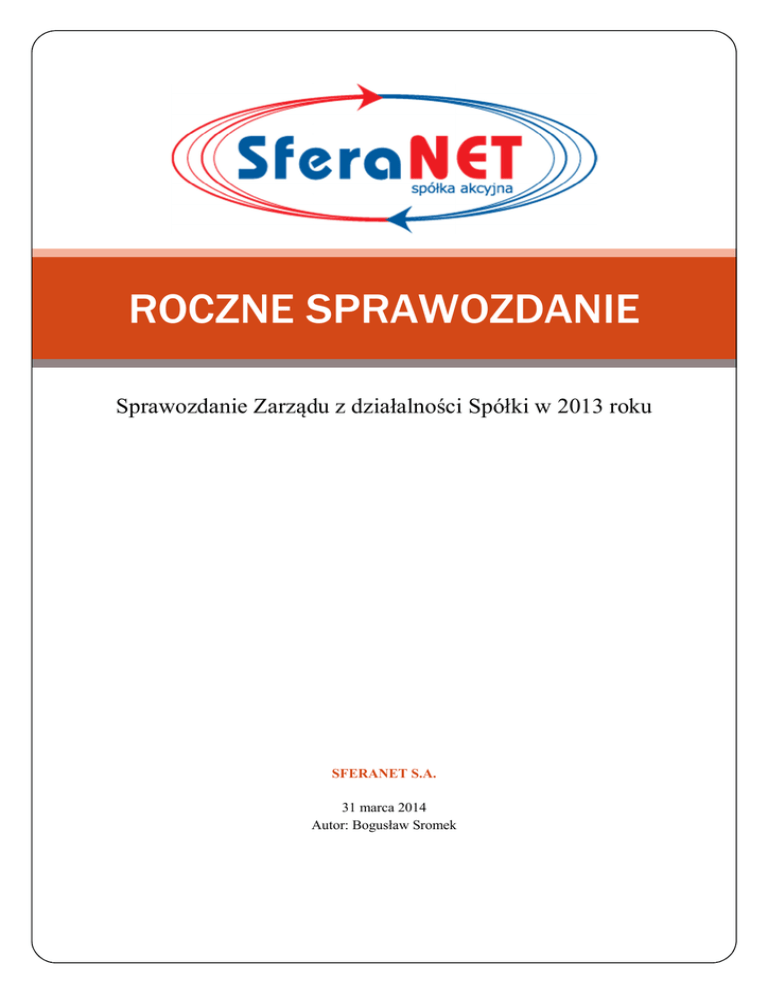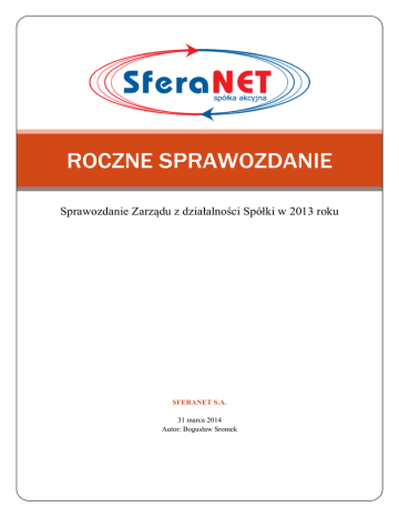 ROCZNE SPRAWOZDANIE Sprawozdanie Zarządu z działalności Spółki w 2013 roku SFERANET S.A. 31 marca 2014 Autor: Bogusław Sromek ROCZNE SPRAWOZDANIE Sprawozdanie Zarządu z działalności Spółki w 2013 roku Spis treści 1. STATUS PRAWNY I ORGANIZACJA SPÓŁKI. ...............................................................................2 1.1.DANE PODSTAWOWE ..........................................................................................................2 1.2. POWSTANIE SPÓŁKI ...........................................................................................................2 1.3. ORGANY SPÓŁKI ................................................................................................................2 1.4. STRUKTURA AKCJONARIATU .............................................................................................3 1.5. CHARAKTERYSTYKA DZIAŁALNOŚCI.................................................................................4 2. ZDARZENIA ISTOTNIE WPŁYWAJĄCE NA DZIAŁALNOŚĆ JEDNOSTKI, JAKIE NASTĄPIŁY W ROKU OBROTOWYM ................................................................................................................................5 3. ZDARZENIA, KTÓRE WYSTĄPIŁY PO DNIU BILANSOWYM I MOGĄ ZNACZĄCO WPŁYNĄĆ NA WYNIKI FINANSOWE JEDNOSTKI W 2014 ROKU..........................................................................................6 4. PRZEWIDYWANY ROZWÓJ SPÓŁKI ............................................................................................7 5. WAŻNIEJSZE OSIĄGNIĘCIA W DZIEDZINIE BADAŃ I ROZWOJU ..................................................7 6. AKTUALNA I PRZEWIDYWANA SYTUACJA FINANSOWA, MAJĄTKOWA I KADROWA .............8 6.1. RACHUNEK ZYSKÓW I STRAT.............................................................................................8 6.2. BILANS ...............................................................................................................................8 6.3. AKTUALNA SYTUACJA FINANSOWA SPÓŁKI ....................................................................10 6.4. PRZEWIDYWANA SYTUACJA FINANSOWA SPÓŁKI ...........................................................11 6.5. MAJĄTEK SPÓŁKI ORAZ ZOBOWIĄZANIA I NALEŻNOŚCI SPÓŁKI.....................................11 6.6. PRZYSŁUGUJĄCE PRAWO DO POMIESZCZEŃ BIUROWYCH ...............................................12 6.7. SYTUACJA KADROWA ......................................................................................................12 7. POSIADANE PRZEZ SPÓŁKĘ ODDZIAŁY ...............................................................................12 ROCZNE SPRAWOZDANIE | 31 marca 2014 8. 1 WSKAZANIE CZYNNIKÓW RYZYKA I ZAGROŻEŃ ................................................................12 8.1. RYZYKO ZWIĄZANE Z SYTUACJĄ MAKROEKONOMICZNĄ ...............................................12 8.2. RYZYKO WZROSTU KONKURENCJI ..............................................................................12 8.3. RYZYKO UTRATY KLUCZOWYCH PRACOWNIKÓW ......................................................13 8.4. RYZYKO ZWIĄZANE Z ROZBUDOWĄ INFRASTRUKTURY .............................................13 8.5. RYZYKO ZWIĄZANE Z REALIZOWANIEM PROJEKTU WSPÓŁFINANSOWANEGO ZE ŚRODKÓW UNII EUROPEJSKIEJ.................................................................................................................13 9. PRZEZNACZENIE ZYSKU .....................................................................................................14 1. Status prawny i organizacja Spółki. 1.1.Dane podstawowe SFERANET S.A. Forma prawna przedsiębiorstwa: Spółka akcyjna Organ rejestrowy: Sąd Rejonowy w Bielsku-Białej, VIII wydział gospodarczy krajowego rejestru sądowego KRS: Regon: NIP: 0000464462 072888096 937-240-88-25 Adres: ul. PCK 8, Tel: (033) 498 44 55 Strona internetowa: Adres e-mail: 43-300 Bielsko - Biała Fax: (033) 498 44 66 www.sferanet.pl [email protected] Kapitał zakładowy: 2 500 000 PLN w całości opłacony 1.2. Powstanie Spółki SferaNET S.A. powstała w wyniku przekształcenia ze spółki z ograniczoną odpowiedzialnością na mocy uchwały Walnego Zgromadzenia Wspólników z dnia 20.04.2013 roku. KRS 0000464462 nastąpiła w dniu 04 czerwca 2013 roku. SferaNET S.A. wstąpiła w prawa i obowiązki wcześniej działającej od 2003 roku na rynku spółki z ograniczoną odpowiedzialnością. 1.3. Organy Spółki Zgodnie z § 14 Statutu Spółki Zarząd może być jedno lub wieloosobowy, składający się z członków powołanych przez Radę Nadzorczą na okres trzyletniej kadencji. Na koniec 2013 roku SferaNET S.A. posiadała jednoosobowy Zarząd tj.: ROCZNE SPRAWOZDANIE | 31 marca 2014 Rejestracja spółki w Rejestrze Przedsiębiorców Krajowego Rejestru Sądowego pod nr 2 Bogusław Sromek – Prezes Zarządu Zgodnie z § 19 Statutu Spółki Rada Nadzorcza składa się z pięciu do dziewięciu Członków, a kadencja trwa przez okres trzech lat. Kadencja poszczególnych Członków nie musi być równa. Rada Nadzorcza jest wybierana przez Walne Zgromadzenie. Na koniec 2013 roku skład Rady Nadzorczej SferaNET S.A.: 1. Anna Stanaszek – Przewodnicząca Rady Nadzorczej 2. Jacek Cieciak 3. Michał Damek 4. Mirosław Hejosz 5. Lesław Tlaga 1.4. Struktura akcjonariatu Na dzień 31 grudnia 2013 r. kapitał zakładowy Emitenta wynosił 2 500 000,00 zł i dzielił się na 2 500 000 akcji zwykłych na okaziciela, o wartości nominalnej 1 zł, w tym: a) 2 000 000 akcji serii A b) 500 000 akcji serii B Struktura akcjonariatu z uwzględnieniem akcjonariuszy posiadających powyżej 5% w ROCZNE SPRAWOZDANIE | 31 marca 2014 kapitale zakładowym, przedstawia się następująco: 3 Udział w kapitale Akcjonariusz Ilość akcji Piotr Londzin 932772 37,31% 37,31% Henryk Wizner 932772 37,31% 37,31% Bogusław Sromek 182456 7,30% 7,30% 452000 18,08% 18,08% Pozostali Akcjonariusze zakładowym Udział w głosa