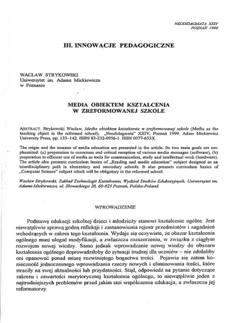 NEODIDAGMATA XXIV POZNAŃ 1999 in . INNOWACJE PEDAGOGICZNE WACŁAW STRYKOWSKI Uniwersytet im. Adama Mickiewicza w Poznaniu MEDIA OBIEKTEM KSZTAŁCENIA W ZREFORMOWANEJ SZKOLE A b s t r a c t . Strykowski Wacław, Media obiektem kształcenia w zreformowanej szkole (Media as the teaching object in the reformed school), „Neodidagmata” XXIV, Poznań 1999. Adam Mickiewicz University Press, pp. 133-142. ISBN 83-232-0956-1. ISSN 0077-653X. The origin and the essence of media education are presented in the article. Its two main goals are emphassized: (a) preparation to conscious and critical reception of various media messages (software), (b) preparation to efficient use of media as tools for communication, study and intellectual work (hardware). The article also presents curriculum basics o f „Reading and media education” subject designed as an interdisciplinary path in elementary and secondary schools. It also presents curriculum basics of „Computer Science” subject which will be obligatory in the reformed school. IVaclaw Strykowski, Zakład Technologii Kształcenia, Wydział Studiów Edukacyjnych, Uniwersytet im. Adama Mickiewicza, ul. Słowackiego 20, 60-823 Poznań, Połska-Poland. WPROWADZENIE Podstawę edukacji szkolnej dzieci i młodzieży stanowi kształcenie ogólne. Jest niewątpliwie sprawą godną refleksji i zastanowienia rejestr przedmiotów i zagadnień wchodzących w zakres tego kształcenia. Wydaje się oczywiste, że obszar kształcenia ogólnego musi ulegać modyfikacji, a zwłaszcza rozszerzeniu, w związku z ciągłym rozwojem nowej wiedzy. Samo jednak wprowadzanie nowej wiedzy do obszaru kształcenia ogólnego doprowadziłoby do sytuacji trudnej dla uczniów - nie zdołaliby oni opanować ponad miarę rozwiniętego bogactwa treści. Pojawia się zatem ko nieczność jednoczesnego wprowadzania rzeczy nowych i eliminowania treści, które straciły na swej aktualności lub przydatności. Stąd, odpowiedź na pytanie dotyczące zakresu i zawartości merytorycznej kształcenia ogólnego, to niewątpliwie jeden z najtrudniejszych problemów przed jakim stoi współczesna edukacja, a zwłaszcza jej reformatorzy. 134 W. Strykowski Potrzebę wzbogacenia i modyfikacji programu kształcenia ogólnego dostrzegali z całą mocą autorzy bodajże najgłośniejszego raportu edukacyjnego pt. „Uczyć się, aby być”. W Raporcie tym czytamy: „Pojęcie kształcenia ogólnego należy rozsze rzyć tak, aby objęło ono w sposób skuteczny również ogólną wiedzę społeczno-ekonomiczną, techniczną i praktyczną” (Faure, 1975, s. 358). Zdaniem autorów tego dokumentu liczne dziedziny wiedzy zarezerwowane wcześniej dla specjalistów należą obecnie do kultury ogólnej, dotyczy to zwłaszcza problematyki ekonomicznej i nowych technologii informacyjnych, czyli mediów. Im bardziej współczesny czło wiek odczuwa skutki rozwoju techniki i jest zmuszony do zrozumienia i opanowania świata techniki, tym bardziej wychowanie technologiczne i medialne, tak teoretycz ne, jak i praktyczne, staje się niezbędne dla wszystkich. W innych rozważaniach i dokumentach nad kształceniem ogólnym stwierdza się też, że istotnym celem tego kształcenia ma być przygotowanie do życia we współ czesnym świecie i społeczeństwie. Niezwykle zaś ważnym czynnikiem kreującym oblicze współczesnego świata są media - wszechobecne we wszystkich dziedzinach naszego życia. Stąd komisje oświatowe na świecie określające model współczesnej edukacji i szkoły dostrzegają pilną potrzebę uczenia się o mediach jako niezbędny obiekt kształcenia i kultury ogólnej. Wyposażenie uczniów w kompetencje me dialne - a więc rozumienie mediów i technik komunikacyjnych, ich sensowne wyko rzystanie do celów osobistych, zawodowych i społecznych to jedno z podstawowych zadań szkoły współczesnej. W świetle powyższych uwag dobrze się stało, że w zreformowanej szkole, obok innych ważnych edukacji, przewidziana jest również edukacja medialna, a więc uczenie o mediach przygotowujące dzieci i młodzież do właściwego korzystania z przekazów medialnych, a także posługiwania się mediami jako narzędziami komuni kowania, uczenia się i pracy intelektualnej. GENEZA I CELE EDUKACJI MEDIALNEJ Przygotowanie uczniów do właściwego odbioru przekazów medialnych, a także uczenie praktycznego posługiwania się narzędziami medialnymi występuje już czę ściowo w naszych szkołach w ramach innych przedmiotów, takich jak m.in.: język polski, technika i informatyka. Najpełniejsze opracowanie teoretyczne i rozwiązania treściowe znalazła edu kacja medialna w zakresie przygotowania do właściwego odbioru komunikatów medialnych, w ramach języka polskiego pod hasłem edukacji filmowej, a następnie edukacji audiowizualnej. Poloniści najwcześniej dostrzegli ogromną rolę kultury audiowizualnej w roz woju współczesnej cywilizacji, udowadniając, że środki masowego przekazu, takie Media obiektem kształcenia w zreformowanej szkole 135 jak film, radio i telewizja są stałymi elementami współczesnej kultury, podobnie jak książki i czasopisma. Wraz z pojawieniem się audiowizualnych i audialnych form zapisu i przekazu zmienił się charakter kultury. Obok form literackich (werbalnych) pojawiły się owe media audiowizualne, których zakres odbioru i udział w kształto waniu dzieci i młodzieży okazał się silniejszy aniżeli tradycyjnych przekazów słow nych. Wkrótce okazało się też, że media audiowizualne są znakomitymi narzędziami komunikowania się ludzi i pracy zawodowej. Problematyka mediów jako urządzeń technicznych pojawiła się więc w ramach przedmiotu „technika” . Szybki rozwój technologii komputerowej i jej wielorakie zastosowania spowodowały wprowadzenie do szkoły przedmiotu „informatyka”, najpierw jako fakultatywnego, a po reformie jako obligatoryjnego. Zagadnienie edukacji medialnej w odniesieniu do filmu było szczególnie mocno po