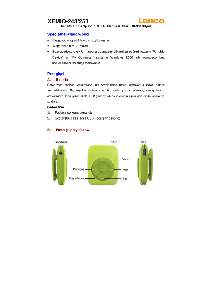 XEMIO-243/253 IMPORTER:DSV Sp. z o. o. S.K.A.; Plac Kaszubski 8; 81-350 Gdynia Specjalne właściwości • Elegancki wygląd I łatwość użytkowania. • Wsparcie dla MP3, WMA. • Beznapędowy dysk U – można zarządzać plikami za pośrednictwem “Portable Device” w “My Computer” systemu Windows 2000 lub nowszego bez konieczności instalacji sterownika. Przegląd A. Bateria Odtwarzacz posiada wbudowaną, nie wymienialną przez użytkownika litową baterię akumulatorową. Aby uzyskać najlepsze wyniki, zanim po raz pierwszy skorzystasz z odtwarzacza, ładuj przez około 1 - 2 godziny lub do momentu zgaśnięcia dioda ładowania zgaśnie. Ładowanie 1. Podłącz do komputera lub 2. Skorzystaj z zasilacza USB. (dostęny osobno) B. Funkcje przycisków 1 XEMIO-243/253 IMPORTER:DSV Sp. z o. o. S.K.A.; Plac Kaszubski 8; 81-350 Gdynia • button: Play / Pause, włącz. / wyłącz. • : poprzednia ścieżka / naciśnij i przytrzymaj, aby przewijać w tył. • : następna ścieżka / naciśnij i przytrzymaj, aby przewijać w przód. • : wzrost poziomu głośności. • : obniżanie poziomu poziomu głośności. • USB: połączenie z komputerem i zasilanie C. Włączanie 1 Włącz. / wyłącz. 1.1 Podłącz słuchawki 1.2 Naciśnij i przytrzymaj przez 2 - 3 sekundy w celu włączenia odtwarzacza. Rozpocznie się odtwarzanie. 1.3 Naciśnij i przytrzymaj przez 2 - 3 second, aby wyłączyć urządzenie. 2 Odtwarzanie / pauza 2.1 Naciśnij w celu wstrzymania odtwarzania. Naciśnij ponownie, aby wznowić odtwarzanie. 2.2 Jeśli pauza jest włączona przez 3 minuty, odtwarzacz zostanie wyłączony automatycznie. 3 Regulacja głośności 3.1 4 5 / : podnoszenie / obniżanie poziomu głośności. Przełączanie plików 4.1 : następna ścieżka. 4.2 : poprzednia ścieżka. Przewijanie 2 XEMIO-243/253 IMPORTER:DSV Sp. z o. o. S.K.A.; Plac Kaszubski 8; 81-350 Gdynia 5.1 Naciśnij i przytrzymaj : przewijanie w przód. 5.2 Naciśnij i przytrzymaj : przewijanie w tył. D. USB 1 Podłączanie do komputera 1.1 Podłącz urządzenie kablem USB do gniazda USB komputera z systemem Windows 2000 / XP System lub nowszym. 1.2 W katalogu “My computer” pojawi sie wymienny. Możliwe jest kopiowanie plików i trwa ładowanie odtwarzacza. 1.3 Po naciśnięciu przycisku Play rozpocznie się odtwarzanie. Po odłączeniu od komputera odtwarzanie zostanie zatrzymane. 2 Odłączanie urządzenia od komputera: Należy bezpiecznie usunąć urządzenie z komputera zanim odłączysz kabel USB, aby uniknąć ewentualnego uszkodzenia systemu plików. 2.1 Windows: w My Computer lub kliknij ikonę “Safely Remove Hardware” w pasku zadań Windows. 2.2 Mac: przeciągnij ikonę odtwarzacza do kosza. 2.3 Teraz można odłączyć kabel USB od odtwarzacza i od komputera. 2.4 Jeśli przypadkiem odłączysz kabel od komputera, natychmiast podłącz go ponownie. 2.5 Gdy włączony, odtwarzacz po odłączeniu od komputera rozpocznie odtwarzanie automatycznie. E. Funkcja wskaźnika • Tryb odtwarzania: miga na czerwono co sekundę. • Tryb pauzy: jasno świeci na czerwono. • Tryb łączenia z komputerem: jasno świeci na czerwono. (ładowanie w tle) • Tryb ładowania: jasno świeci na czerwono. 3 XEMIO-243/253 IMPORTER:DSV Sp. z o. o. S.K.A.; Plac Kaszubski 8; 81-350 Gdynia • Ładowanie zakończone: czerwone podświetlenie gaśnie F. Problemy Nie można włączyć • Sprawdź stan baterii. Brak dźwięku • SPrawdź poziom głośności. • Sprawdź stan wtyku i gniazdka słuchawkow. • Uszkodzone pliki WMA / MP3 mogą powodować zakłócenia i w efekcie brak dźwięku. Upewnij się, że pliki nie są uszkodzone i są w kompatybilnynm z tym odtwarzaczem formacie. Nie można pobrać plików. • Sprawdź połączenie USB. • Sprawdź stan stan pamięci. G. Specyfikacje Wymiary 45.5 mm (H) x 35 mm (W) x 18 mm (D) Waga 15g Złącze komputerowe USB 2.0 (High Speed) Impedancja słuchaw. 32 Ohm Wbudow. pamięć Flash: Xemio-243 2GB Baterie Wbudowana bateria litowa z możliwością ładowania / Xemio-253 4GB (3.7V 110mA) Czas pracy: 6 – 7 godz. Kompatybilność MP3 32kbps - 320kbps WMA 32kbps – 384kbps 4 XEMIO-243/253 IMPORTER:DSV Sp. z o. o. S.K.A.; Plac Kaszubski 8; 81-350 Gdynia Dźwięk Moc słuchawek L: 150mVrms + R: 150mV (32 Ohm) Pasmo przenoszenia 20Hz – 20,000Hz SNR 80dB ℃ - 40℃ Temperatura pracy -0 Systemy operac. Windows 98/SE/ME2000/XP/Vista, MAC 9.2 lub nowszy Note: Product design and specification are subject to change without prior notice. H. Recycling Jeśli w dowolnym momencie w przyszłości zechcesz pozbyć się tego produktu, pamiętaj, że: odpadów urządzeń elektrycznych nie należy wyrzucać razem z odpadkami domowymi. Należy poddać je specjalnej utylizacji. Skontaktuj się z władzami lokalnymi lub sprzedawcą w celu porad w zakresie recyklingu. Więcej szczegółów na stronie, www.lenco.eu 5