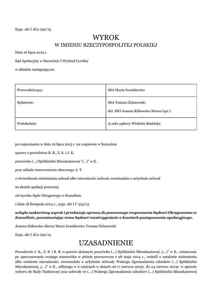 Sygn. akt I ACa 250/15 WYROK W IMIENIU RZECZYPOSPOLITEJ POLSKIEJ Dnia 16 lipca 2015 r. Sąd Apelacyjny w Szczecinie I Wydział Cywilny w składzie następującym: Przewodniczący: SSA Maria Iwankiewicz Sędziowie: SSA Tomasz Żelazowski del. SSO Joanna Kitłowska-Moroz (spr.) Protokolant: st.sekr.sądowy Wioletta Simińska po rozpoznaniu w dniu 16 lipca 2015 r. na rozprawie w Szczecinie sprawy z powództwa B. B., Z. S. i J. K. przeciwko (...) Spółdzielni Mieszkaniowej "(...)" w K. przy udziale interwenienta ubocznego A. T. o stwierdzenie nieistnienia uchwał albo nieważności uchwał, ewentualnie o uchylenie uchwał na skutek apelacji pozwanej od wyroku Sądu Okręgowego w Koszalinie z dnia 18 listopada 2014 r., sygn. akt I C 323/13 uchyla zaskarżony wyrok i przekazuje sprawę do ponownego rozpoznania Sądowi Okręgowemu w Koszalinie, pozostawiając temu Sądowi rozstrzygnięcie o kosztach postępowania apelacyjnego. Joanna Kitłowska-Moroz Maria Iwankiewicz Tomasz Żelazowski Sygn. akt I ACa 250/15 UZASADNIENIE Powodowie J. K., Z. S. i B. B. w pozwie złożonym przeciwko (...) Spółdzielni Mieszkaniowej „(...)” w K., ostatecznie po sprecyzowaniu swojego stanowiska w piśmie procesowym z 28 maja 2014 r., wnieśli o ustalenie nieistnienia albo ustalenie nieważności, ewentualnie o uchylenie uchwały Walnego Zgromadzenia członków (...) Spółdzielni Mieszkaniowej „(...)” w K., odbytego w 6 częściach w dniach od 17 czerwca 2013r. do 24 czerwca 2013r. w sprawie wyboru do Rady Nadzorczej oraz uchwały nr (...) Walnego Zgromadzenia członków (...) Spółdzielni Mieszkaniowej „(...)” w K. dotyczącej odrzucenia projektu uchwały wniesionej przez członków Spółdzielni w sprawie odwołania z Rady Nadzorczej M. K. - o ustalenie (stwierdzenie) nieważności tej uchwały, ewentualnie o jej uchylenie. Odnośnie uchwały nr (...) powodowie wskazali, że członek Spółdzielni, M. T., pismem z 28 maja 2013r., na podstawie art. 8( 3) ust. 10, 11 ustawy z dnia 15 grudnia 2000 r. o spółdzielniach mieszkaniowych oraz na podstawie postanowień § 104 ust. 8 Statutu - zgłosił projekt uchwały w sprawie odwołania z Rady Nadzorczej M. K.. Projekt uchwały poparło 70 członków. Tymczasem projekt ten nie został jednak ani przygotowany pod względem formalnym, ani poddany pod głosowanie, albowiem Zarząd pozwanej Spółdzielni potraktował ten projekt jako żądanie odwołania członków Rady Nadzorczej i jednocześnie zgłosił projekt uchwały w sprawie odrzucenia w/w projektu uchwały. W ocenie powodów, nie było żadnych „przyczyn formalnych", z powodu których należało podjąć zgłoszoną przez Zarząd uchwałę nr (...) w sprawie odrzucenia projektu uchwały wniesionej przez członków Spółdzielni. Zarząd pozwanej Spółdzielni wprowadził w błąd członków Spółdzielni, a zaskarżona uchwała jest sprzeczna nie tylko z przepisami ustawy, ale także z postanowieniami Statutu i dobrymi obyczajami. W przedmiocie uchwały podjętej w sprawie wyboru do Rady Nadzorczej, powodowie wskazali, że nie została ona odrębnie zredagowana, nie nadano jej numeru i została odnotowana jedynie w protokole Walnego Zgromadzenia i protokołach komisji mandatowo-skrutacyjnych. Według powodów, przedstawiciele pozwanej Spółdzielni pozostają w błędnym przekonaniu, że Walne Zgromadzenie Spółdzielni nie podejmuje uchwał w sprawie odwołania i powołania członków jej organów. Nadto, powodowie zarzucili, że przy podjęciu tej uchwały dopuszczono się rażących nadużyć w przeprowadzeniu obrad Walnego Zgromadzenia pozwanej w dniach od 17 czerwca 2013 r. do 24 czerwca 2013 r. oraz w sposobie głosowania i liczenia głosów podczas wyborów do Rady Nadzorczej polegających na: 1. uchybieniu terminowi, wynikającemu z art. 83 ust. 11 u.s.m. i § 105 ust, 1 Statutu Spółdzielni, czyli zawiadomienia o czasie, miejscu i porządku obrad Walnego Zgromadzenia lub jego części wszystkich członków na piśmie co najmniej 21 dni przed terminem posiedzenia Walnego Zgromadzenia lub pierwszej jego części. 2. wybraniu, podczas drugiej części Walnego Zgromadzenia, prezydium w składzie tylko przewodniczącego, sekretarza i jednego asesora, podczas gdy zgodnie z § 108 ust. 2 Statutu, Walne Zgromadzenie albo jego część wybiera prezydium w składzie co najmniej: przewodniczący, sekretarz i asesor, natomiast § 7 ust. 2 Regulaminu Walnego Zgromadzenia (§ 108 ust. 3 Statutu) przewiduje, że Walne Zgromadzenie wybiera prezydium części zgromadzenia w składzie: przewodniczący, sekretarz i dwaj asesorowie; 3. wadliwym wyborze komisji mandatowo-skrutacyjnych, gdzie przy 5 kandydatach do komisji, radca prawny pozwanej Spółdzielni poinformowała uczestników Walnego Zgromadzenia, że w głosowaniu nad kandydatami zaproponowanymi przez byłego pracownika Spółdzielni (3 kandydatów) głosować mogą wszyscy obecni członkowie, a następnie na pozostałych kandydatów (2 kandydatów) mogli głosować tylko ci, którzy nie oddali jeszcze głosu; 4. odmowie skorzystania przez członków Spółdzielni z prawa korzystania z pomocy eksperta, co jest sprzeczne z art. 36 § 7 ustawy prawo spółdzielcze oraz § 101 ust. 3 Statutu; 5. prowadzeniu Walnego Zgromadzenia przez nieuprawnioną osobę, tj. przez radcę prawnego pozwanej A. L., podczas, gdy zgodnie z § 108 ust. 2 i 3 Statutu oraz postanowieniami Regulaminu Walnego Zgromadzenia, powinien je prowadzić przewodniczący; 6. błędnym liczenie głosów podczas wyborów do Rady Nadzorczej i uwzględnieniu głosów nieważnych. W odpowiedzi na pozew, pozwana (...) Spółdzielnia Mieszkaniowa „(...)” w K. wniosła o oddalenie powództwa w całości. Ustosunkowując się do zarzutów wskazanych w pozwie, pozwana Spółdzielnia podała, że na skutek wniosków członków Spółdzielni, w tym powodów, co do odwołania członka Rady Nadzorczej M. K., zmieniono porządek obrad i umieszczono w nim projekty uchwał zgłoszonych przez czł