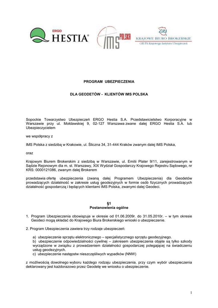 PROGRAM UBEZPIECZENIA DLA GEODETÓW - KLIENTÓW IMS POLSKA Sopockie Towarzystwo Ubezpieczeń ERGO Hestia S.A. Przedstawicielstwo Korporacyjne w Warszawie przy ul. Mołdawskiej 9, 02-127 Warszawa zwane dalej ERGO Hestia S.A. lub Ubezpieczycielem we współpracy z IMS Polska z siedzibą w Krakowie, ul. Śliczna 34, 31-444 Kraków zwanym dalej IMS Polska, oraz Krajowym Biurem Brokerskim z siedzibą w Warszawie, ul. Emilii Plater 9/11, zarejestrowanym w Sądzie Rejonowym dla m. st. Warszawy, XIX Wydział Gospodarczy Krajowego Rejestru Sądowego, nr KRS: 0000121086, zwanym dalej Brokerem przedstawia ofertę ubezpieczenia (zwaną dalej Programem Ubezpieczenia) dla Geodetów prowadzących działalność w zakresie usług geodezyjnych w formie osób fizycznych prowadzących działalność gospodarczą i będących klientami IMS Polska, zwanymi dalej Geodeci. §1 Postanowienia ogólne 1. Program Ubezpieczenia obowiązuje w okresie od 01.06.2009r. do 31.05.2010r. – w tym okresie Geodeci mogą składać do Krajowego Biura Brokerskiego wnioski o ubezpieczenie. 2. Program Ubezpieczenia zawiera trzy rodzaje ubezpieczeń: a) ubezpieczenie sprzętu elektronicznego – specjalistycznego sprzętu geodezyjnego. b) ubezpieczenie odpowiedzialności cywilnej – zakresem ubezpieczenia objęte są tylko szkody wyrządzone w związku z prowadzeniem działalności gospodarczej polegającej na świadczeniu usług geodezyjnych. c) ubezpieczenie następstw nieszczęśliwych wypadków (NNW) z moŜliwością dowolnego wyboru kaŜdego rodzaju ubezpieczenia, przy czym wybór ubezpieczenia deklarowany jest kaŜdorazowo przez Geodetę we wniosku o ubezpieczenie. 1 §2 Adresaci Programu Ubezpieczenia Program Ubezpieczenia dedykowany jest dla Geodetów będących klientami IMS Polska i prowadzących działalność gospodarczą w formie osób fizycznych prowadzących działalność gospodarczą. §3 Przystąpienie Geodety do ubezpieczenia 1. Ubezpieczającym i ubezpieczonym jest Geodeta, który skutecznie przesłał do Krajowego Biura Brokerskiego, poprawnie wypełniony wniosek o ubezpieczenie stanowiący załącznik nr 1 do Programu. 2. Broker archiwizuje otrzymane od Geodetów wnioski o ubezpieczenie i przesyła (w formie elektronicznej) zbiorczo do Ubezpieczyciela poprawnie wypełnione wnioski, w terminie 3 dni roboczych od daty wpływu wniosku do Brokera. 3. Ubezpieczyciel na podstawie otrzymanych wniosków wystawia polisę ubezpieczeniową potwierdzającą zawarcie umowy ubezpieczenia dla kaŜdego Ubezpieczającego (Geodety) oddzielnie. 4. Ubezpieczyciel przesyła skan polisy ubezpieczeniowej do Brokera, a oryginał polisy pocztą do Geodety, wskazanego we wniosku o ubezpieczenie. 5. Druki wniosków, ogólne warunki ubezpieczenia oraz materiały informacyjne o Programie znajdują się na stronie internetowej Brokera oraz IMS Polska. § 4 Okres ubezpieczenia 1. Umowy ubezpieczenia dla kaŜdego Geodety zawierane są na jeden rok, z zastrzeŜeniem ustępu 2. 2. Okres ubezpieczenia dla danego geodety rozpoczyna się od dnia wskazanego we wniosku o ubezpieczenie, ochrona ubezpieczeniowa rozpoczyna się od dnia opłacenia składki za ubezpieczenie. § 5 Program ubezpieczenia Program zawiera trzy rodzaje ubezpieczeń: Geodeta wskazuje we wniosku o ubezpieczenie z których rodzajów ubezpieczeń chce skorzystać. Geodeta moŜe zawrzeć wybrane i wskazane przez siebie we wniosku ubezpieczenia. I. Ubezpieczenie sprzętu elektronicznego od wszystkich ryzyk (ubezpieczeniu podlega sprzęt elektroniczny uŜytkowany przez Geodetę w pracy zawodowej) 1. Podstawa ubezpieczenia: Ogólne Warunki Ubezpieczenia (OWU) sprzętu elektronicznego od wszystkich ryzyk STU Ergo Hestia S.A. z 10.08.2007r. OWU stanowią załącznik nr 2 do Programu. 2. OWU precyzują warunki ubezpieczenia, w tym wyłączenia odpowiedzialności Ubezpieczyciela. Przed zawarciem umowy ubezpieczenia naleŜy uwaŜnie się z nimi zapoznać. 3. Zakres ubezpieczenia: zgodnie z OWU oraz klauzulami dodatkowymi. 4. Zakres terytorialny: teren RP 5. Sumy i stawki ubezpieczenia: 2 a) sekcja I – szkody materialne: Przedmiot ubezpieczenia Przenośny sprzęt elektroniczny (specjalistyczny sprzęt geodezyjny)¹ Metoda wyceny Stawka (składka wyliczana jest od sumy ubezpieczenia określonej we wniosku przez Geodetę) dla pojedynczego ubezpieczonego Geodety Sumy stałe, wg wartości księgowej brutto lub odtworzeniowej maksymalna suma ubezpieczenia wynosi 350.000,- PLN 0,75% ¹ maksymalny wiek sprzętu do 7 lat. Wiek sprzętu liczony jest od daty produkcji b) sekcja III – zwiększone koszty działalności: Przedmiot ubezpieczenia Metoda wyceny Koszty odtworzenia danych, koszt wynajmu sprzętu zastępczego (na okres max do 30 dni, do sumy ubezpieczenia) Limit na jedno i wszystkie zdarzenia w okresie ubezpieczenia (na jednego ubezpieczonego) Suma ubezpieczenia (w zł) 10.000 zł Stawka/składka 200 zł 5. Klauzule dodatkowe: Klauzula nr 100 Ubezpieczenie sprzętu elektronicznego od kradzieŜy z włamaniem i rabunku. Z zastrzeŜeniem Ogólnych Warunków Ubezpieczenia i innych postanowień lub załączników do umowy ubezpieczenia uzgodniono, Ŝe na podstawie niniejszej klauzuli dodatkowej: 1. Zakres ubezpieczenia rozszerza się o szkody w ubezpieczonym sprzęcie, powstałe wskutek: 1) kradzieŜy z włamaniem - przez co rozumie się dokonanie albo usiłowanie dokonania zaboru sprzętu z lokali po uprzednim usunięciu siłą zabezpieczenia lub otworzeniu wejścia przy uŜyciu narzędzi, albo podrobionego lub dopasowanego klucza, bądź klucza oryginalnego, w którego posiadanie sprawca wszedł wskutek włamania do innego lokalu lub w wyniku rabunku, gdzie w niniejszych Ogólnych Warunkach Ubezpieczenia za lokal uwaŜa się przestrzeń wydzieloną trwałymi ścianami, stanowiącą funkcjonalną lub gospodarczą całość, słuŜącą zaspokojeniu potrzeb Ubezpieczającego, uŜytkowany na mocy posiadanego przez niego tytułu prawnego, składającą się z jednego lub większej liczby po