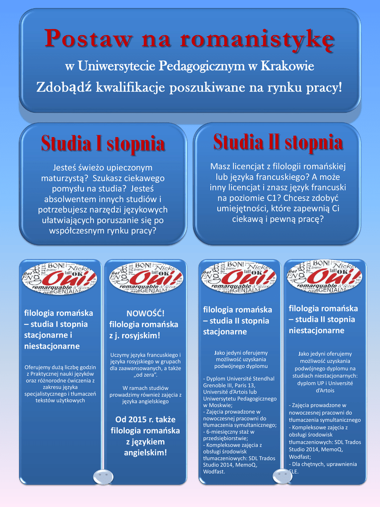 Postaw na romanistykę w Uniwersytecie Pedagogicznym w Krakowie Zdobądź kwalifikacje poszukiwane na rynku pracy! Studia I stopnia Studia II stopnia Jesteś świeżo upieczonym maturzystą? Szukasz ciekawego pomysłu na studia? Jesteś absolwentem innych studiów i potrzebujesz narzędzi językowych ułatwiających poruszanie się po współczesnym rynku pracy? Masz licencjat z filologii romańskiej lub języka francuskiego? A może inny licencjat i znasz język francuski na poziomie C1? Chcesz zdobyć umiejętności, które zapewnią Ci ciekawą i pewną pracę? filologia romańska – studia I stopnia stacjonarne i niestacjonarne Oferujemy dużą liczbę godzin z Praktycznej nauki języków oraz różnorodne ćwiczenia z zakresu języka specjalistycznego i tłumaczeń tekstów użytkowych NOWOŚĆ! filologia romańska z j. rosyjskim! Uczymy języka francuskiego i języka rosyjskiego w grupach dla zaawansowanych, a także „od zera”. W ramach studiów prowadzimy również zajęcia z języka angielskiego Od 2015 r. także filologia romańska z językiem angielskim! filologia romańska – studia II stopnia stacjonarne Jako jedyni oferujemy możliwość uzyskania podwójnego dyplomu - Dyplom Université Stendhal Grenoble III, Paris 13, Université d’Artois lub Uniwersytetu Pedagogicznego w Moskwie; - Zajęcia prowadzone w nowoczesnej pracowni do tłumaczenia symultanicznego; - 6-miesięczny staż w przedsiębiorstwie; - Kompleksowe zajęcia z obsługi środowisk tłumaczeniowych: SDL Trados Studio 2014, MemoQ, Wodfast. filologia romańska – studia II stopnia niestacjonarne Jako jedyni oferujemy możliwość uzyskania podwójnego dyplomu na studiach niestacjonarnych: dyplom UP i Université d’Artois - Zajęcia prowadzone w nowoczesnej pracowni do tłumaczenia symultanicznego - Kompleksowe zajęcia z obsługi środowisk tłumaczeniowych: SDL Trados Studio 2014, MemoQ, Wodfast; - Dla chętnych, uprawnienia FLE.