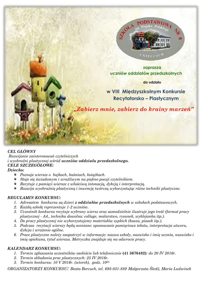 zaprasza uczniów oddziałów przedszkolnych do udziału w VIII Międzyszkolnym Konkursie Recytatorsko – Plastycznym „Zabierz mnie, zabierz do krainy marzeń” CEL GŁÓWNY Rozwijanie zainteresowań czytelniczych i wyobraźni plastycznej wśród uczniów oddziału przedszkolnego. CELE SZCZEGÓŁOWE: Dziecko: Poznaje wiersze o bajkach, baśniach, książkach. Staje się świadomym i wrażliwym na piękno poezji czytelnikiem. Recytuje z pamięci wiersze z właściwą intonacją, dykcją i interpretacją. Rozwija wyobraźnię plastyczną i inwencję twórczą wykorzystując różne techniki plastyczne. REGULAMIN KONKURSU: 1. Adresatem konkursu są dzieci z oddziałów przedszkolnych w szkołach podstawowych. 2. Każdą szkołę reprezentuje 1-2 uczniów. 3. Uczestnik konkursu recytuje wybrany wiersz oraz samodzielnie ilustruje jego treść (format pracy plastycznej - A4., technika dowolna: collage, malarstwo, rysunek, wyklejanka itp.). 4. Do pracy plastycznej nie wykorzystujemy materiałów sypkich (kasza, piasek itp.). 5. Podczas recytacji wierszy będą oceniane: opanowanie pamięciowe tekstu, interpretacja utworu, dykcja i wrażenie ogólne. 6. Prace plastyczne należy zaopatrzyć w informacje: nazwa szkoły, nazwisko i imię ucznia, nazwisko i imię opiekuna, tytuł wiersza. Metryczka znajduje się na odwrocie pracy. KALENDARZ KONKURSU: 1. Termin zgłaszania uczestników osobiście lub telefonicznie (41 3676482): do 20 IV 2016r. 2. Termin składania prac plastycznych: 25 IV 2016r. 3. Termin konkursu: 10 V 2016r. (wtorek), godz. 1000 ORGANIZATORZY KONKURSU: Beata Borcuch, tel. 693-031-889 Małgorzata Śledź, Maria Ludwinek