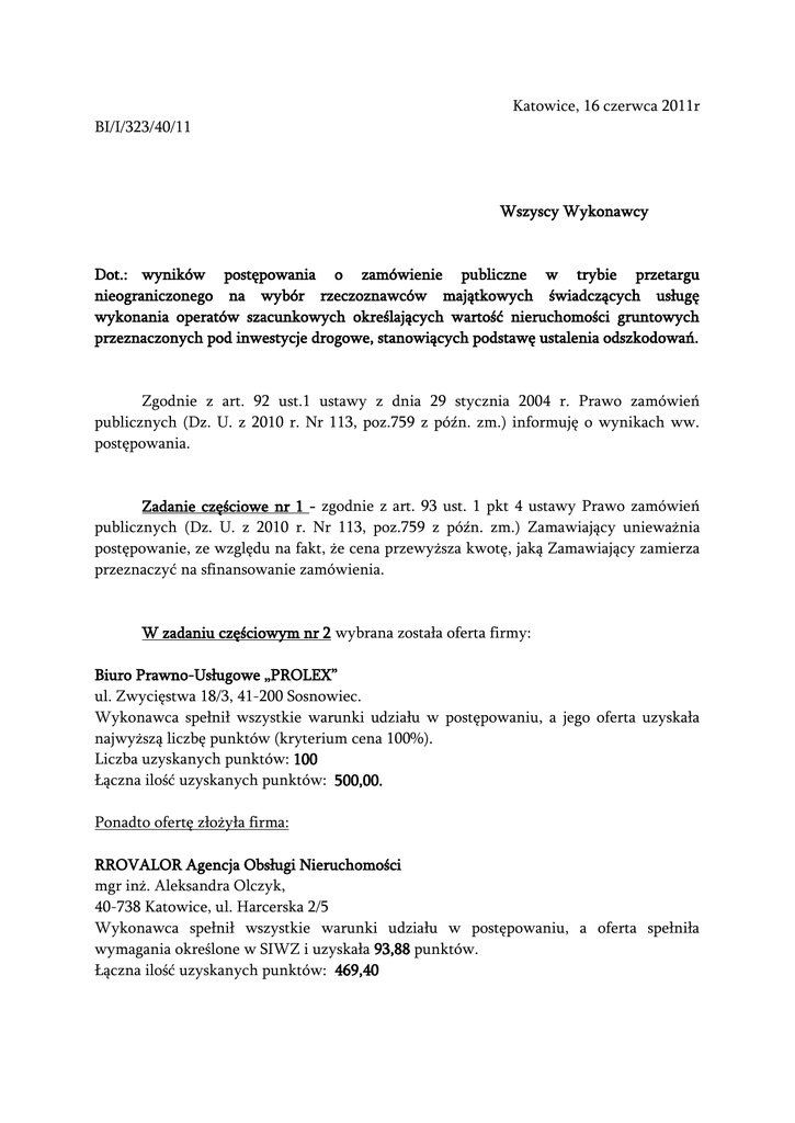Katowice, 16 czerwca 2011r BI/I/323/40/11 Wszyscy Wykonawcy Dot.: wyników postępowania o zamówienie publiczne w trybie przetargu nieograniczonego na wybór rzeczoznawców majątkowych świadczących usługę wykonania operatów szacunkowych określających wartość nieruchomości gruntowych przeznaczonych pod inwestycje drogowe, stanowiących podstawę ustalenia odszkodowań. Zgodnie z art. 92 ust.1 ustawy z dnia 29 stycznia 2004 r. Prawo zamówień publicznych (Dz. U. z 2010 r. Nr 113, poz.759 z późn. zm.) informuję o wynikach ww. postępowania. Zadanie częściowe nr 1 - zgodnie z art. 93 ust. 1 pkt 4 ustawy Prawo zamówień publicznych (Dz. U. z 2010 r. Nr 113, poz.759 z późn. zm.) Zamawiający unieważnia postępowanie, ze względu na fakt, że cena przewyższa kwotę, jaką Zamawiający zamierza przeznaczyć na sfinansowanie zamówienia. W zadaniu częściowym nr 2 wybrana została oferta firmy: Biuro Prawno-Usługowe „PROLEX” ul. Zwycięstwa 18/3, 41-200 Sosnowiec. Wykonawca spełnił wszystkie warunki udziału w postępowaniu, a jego oferta uzyskała najwyższą liczbę punktów (kryterium cena 100%). Liczba uzyskanych punktów: 100 Łączna ilość uzyskanych punktów: 500,00. Ponadto ofertę złożyła firma: RROVALOR Agencja Obsługi Nieruchomości mgr inż. Aleksandra Olczyk, 40-738 Katowice, ul. Harcerska 2/5 Wykonawca spełnił wszystkie warunki udziału w postępowaniu, a oferta spełniła wymagania określone w SIWZ i uzyskała 93,88 punktów. Łączna ilość uzyskanych punktów: 469,40 W zadaniu częściowym nr 3 wybrana została oferta firmy: RROVALOR Agencja Obsługi Nieruchomości mgr inż. Aleksandra Olczyk, 40-738 Katowice, ul. Harcerska 2/5 Wykonawca spełnił wszystkie warunki udziału w postępowaniu, a jego oferta uzyskała najwyższą liczbę punktów (kryterium cena 100%). Liczba uzyskanych punktów: 100 Łączna ilość uzyskanych punktów: 500,00. Ponadto ofertę złożyła firma: „PROLEX” Biuro Prawno – Usługowe, 41 – 200 Sosnowiec, ul. Zwycięstwa 18/3 Wykonawca spełnił wszystkie warunki udziału w postępowaniu, a oferta spełniła wymagania określone w SIWZ i uzyskała 94,31 punktów. Łączna ilość uzyskanych punktów: 471,55 Zadanie częściowe nr 4 - zgodnie z art. 93 ust. 1 pkt 4 ustawy Prawo zamówień publicznych (Dz. U. z 2010 r. Nr 113, poz.759 z późn. zm.) Zamawiający unieważnia postępowanie, ze względu na fakt, że cena przewyższa kwotę, jaką Zamawiający zamierza przeznaczyć na sfinansowanie zamówienia. Zadanie częściowe nr 5 - zgodnie z art. 93 ust.1 pkt 1 ustawy z dnia 29 stycznia 2004 r. Prawo zamówień publicznych (Dz. U. z 2010 r. Nr 113 poz. 759 z późn. zm.) Zamawiający unieważnia postępowanie, ze względu na fakt, że nie złożono żadnej oferty niepodlegającej odrzuceniu. W zadaniu częściowym nr 6 wybrana została oferta firmy: RROVALOR Agencja Obsługi Nieruchomości mgr inż. Aleksandra Olczyk, 40-738 Katowice, ul. Harcerska 2/5 Wykonawca spełnił wszystkie warunki udziału w postępowaniu, a jego oferta uzyskała najwyższą liczbę punktów (kryterium cena 100%). Liczba uzyskanych punktów 100 Łączna ilość uzyskanych punktów: 500,00. Ponadto ofertę złożyła firma: „PROLEX” Biuro Prawno – Usługowe, 41 – 200 Sosnowiec, ul. Zwycięstwa 18/3 Wykonawca spełnił wszystkie warunki udziału w postępowaniu, a oferta spełniła wymagania określone w SIWZ i uzyskała 71,27punktów. Łączna ilość uzyskanych punktów: 356,35 W zadaniu częściowym nr 7 wybrana została oferta firmy: Biuro Prawno-Usługowe „PROLEX” ul. Zwycięstwa 18/3, 41-200 Sosnowiec. Wykonawca spełnił wszystkie warunki udziału w postępowaniu, a jego oferta uzyskała najwyższą liczbę punktów (kryterium cena 100%). Liczba uzyskanych punktów 100 Łączna ilość uzyskanych punktów: 500,00. Ponadto ofertę złożyła firma: RROVALOR Agencja Obsługi Nieruchomości mgr inż. Aleksandra Olczyk, 40-738 Katowice, ul. Harcerska 2/5 Wykonawca spełnił wszystkie warunki udziału w postępowaniu, a oferta spełniła wymagania określone w SIWZ i uzyskała 40,30 punktów. Łączna ilość uzyskanych punktów: 201,50 Katarzyna Wiencek Dyrektor Biura Inwestycji, Zamówień Publicznych i Logistyki