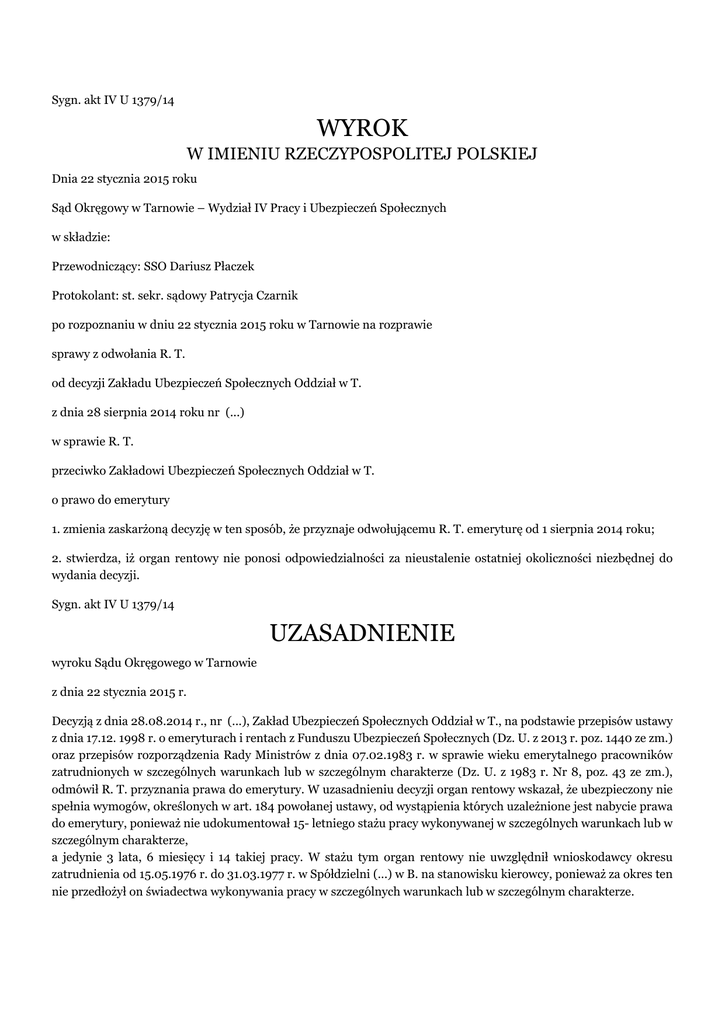 Sygn. akt IV U 1379/14 WYROK W IMIENIU RZECZYPOSPOLITEJ POLSKIEJ Dnia 22 stycznia 2015 roku Sąd Okręgowy w Tarnowie – Wydział IV Pracy i Ubezpieczeń Społecznych w składzie: Przewodniczący: SSO Dariusz Płaczek Protokolant: st. sekr. sądowy Patrycja Czarnik po rozpoznaniu w dniu 22 stycznia 2015 roku w Tarnowie na rozprawie sprawy z odwołania R. T. od decyzji Zakładu Ubezpieczeń Społecznych Oddział w T. z dnia 28 sierpnia 2014 roku nr (...) w sprawie R. T. przeciwko Zakładowi Ubezpieczeń Społecznych Oddział w T. o prawo do emerytury 1. zmienia zaskarżoną decyzję w ten sposób, że przyznaje odwołującemu R. T. emeryturę od 1 sierpnia 2014 roku; 2. stwierdza, iż organ rentowy nie ponosi odpowiedzialności za nieustalenie ostatniej okoliczności niezbędnej do wydania decyzji. Sygn. akt IV U 1379/14 UZASADNIENIE wyroku Sądu Okręgowego w Tarnowie z dnia 22 stycznia 2015 r. Decyzją z dnia 28.08.2014 r., nr (...), Zakład Ubezpieczeń Społecznych Oddział w T., na podstawie przepisów ustawy z dnia 17.12. 1998 r. o emeryturach i rentach z Funduszu Ubezpieczeń Społecznych (Dz. U. z 2013 r. poz. 1440 ze zm.) oraz przepisów rozporządzenia Rady Ministrów z dnia 07.02.1983 r. w sprawie wieku emerytalnego pracowników zatrudnionych w szczególnych warunkach lub w szczególnym charakterze (Dz. U. z 1983 r. Nr 8, poz. 43 ze zm.), odmówił R. T. przyznania prawa do emerytury. W uzasadnieniu decyzji organ rentowy wskazał, że ubezpieczony nie spełnia wymogów, określonych w art. 184 powołanej ustawy, od wystąpienia których uzależnione jest nabycie prawa do emerytury, ponieważ nie udokumentował 15- letniego stażu pracy wykonywanej w szczególnych warunkach lub w szczególnym charakterze, a jedynie 3 lata, 6 miesięcy i 14 takiej pracy. W stażu tym organ rentowy nie uwzględnił wnioskodawcy okresu zatrudnienia od 15.05.1976 r. do 31.03.1977 r. w Spółdzielni (...) w B. na stanowisku kierowcy, ponieważ za okres ten nie przedłożył on świadectwa wykonywania pracy w szczególnych warunkach lub w szczególnym charakterze. Od decyzji tej odwołał się R. T., domagając się jej zmiany i przyznania mu prawa do emerytury. W uzasadnieniu odwołujący podniósł, że zaskarżona decyzja jest dla niego krzywdząca, ponieważ legitymuje się co najmniej 15- letnim stażem pracy w szczególnych warunkach, ponieważ od 15.05.1976 r. do 31.03.1977 r. pracował w takim charakterze w Spółdzielni (...)w B. na stanowisku kierowcy samochodów ciężarowych o dopuszczalnym ciężarze całkowitym powyżej 3,5 tony oraz od 01.04.1977 r. do 30.05.1988 r. w (...)przy (...)w B. na stanowisku kierowcy TIR- ów (k. 2, 5, 11-12). W odpowiedzi na odwołanie organ rentowy wniósł o jego oddalenie. W uzasadnieniu podniósł, że za wskazany w zaskarżonej decyzji okres zatrudnienia i okres zatrudnienia od 01.03.1977 r. do 30.05.1988 r. w Zakładzie (...) w B. ubezpieczony nie przedłożył świadectw wykonywania pracy w szczególnych warunkach lub w szczególnym charakterze, a z dokumentacji archiwalnej nie wynika, aby w tych okresach zatrudnienia stale i w pełnym wymiarze godzin pracował w charakterze kierowcy samochodu ciężarowego o dopuszczalnym ciężarze całkowitym powyżej 3,5 tony. Bezsporne w niniejszej sprawie było, że R. T., w dniu 19.05. 2012 r. , na dzień 01.01.1999 r. udowodnił 27 lat, 9 miesięcy i 29 dni okresów składkowych i nieskładkowych oraz staż pracy w szczególnych warunkach w wymiarze 3 lat, 6 miesięcy i 14 dni z tytułu zatrudnienia w (...)Zakładach (...)w O. od 27.04.1989 r. do 31.12.1992 r. na stanowisku kierowcy samochodów ciężarowych o dopuszczalnym ciężarze całkowitym powyżej 3,5 tony. We wniosku z dnia 11.08.2014 r. ubezpieczony wniósł o przyznanie mu prawa do wcześniejszej emerytury. Zaskarżoną decyzją z dnia 28.08.2014 r. ZUS Oddział w T. odmówił R. T. przyznania prawa do tego świadczenia, ponieważ wnioskodawca nie udokumentował 15- letniego stażu pracy wykonywanej w szczególnych warunkach lub w szczególnym charakterze. Odwołujący nie przystąpił do OFE. (okoliczności bezsporne) Sąd ustalił ponadto następujący stan faktyczny sprawy: Odwołujący R. T. od 15.05.1976 r. do 31.03.1977 r. był zatrudniony w Spółdzielni (...) Zakład Wojewódzki w T. Oddział w B. w pełnym wymiarze czasu pracy na stanowisku kierowcy samochodowego. dowód: • świadectwo pracy z dnia 01.04.1977 r.- k. 7 cz. II akt ZUS, Spółdzielnia (...)Zakład Wojewódzki w T. Oddział w B. świadczyła usługi transportowe. W Zakładzie tym odwołujący na co dzień jeździł samochodami ciężarowymi o dopuszczalnym ciężarze całkowitym powyżej 3,5 tony typu K.i S.(...)Są to samochody ciężarowe o ładowności do 6 ton. Samochodami tymi woził węgiel ze stacji kolejowej do GS-ów. Spółdzielnia (...) nie miała na swoim stanie mniejszych samochodów. Dysponowała tylko jednym Ż., ale odwołujący nigdy nim nie jeździł. Pracę kierowcy samochodu ciężarowego o dopuszczalnym ciężarze całkowitym powyżej 3,5 tony odwołujący wykonywał stale i w pełnym wymiarze czasu pracy. W ramach dobowego wymiaru godzin nie był kierowany do realizowania jakichkolwiek innych czynności. dowód: • zeznania świadka J. R.- 00:17:49-00:19:11, • zeznania świadka A. Z.- 00:21:46, Od 01.04.1977 r. do 30.05.1988 r. odwołujący pracował w Przedsiębiorstwie (...) w K. w pełnym wymiarze czasu pracy na stanowisku kierowcy samochodu ciężarowego o ciężarze całkowitym powyżej 3,5 tony. dowód: • świadectwo pracy z dnia 30.05.1988 r.- k. 11 cz. I akt ZUS, • zaświadczenie z dnia 30.05.1988 r.- k. 10 cz. I akt ZUS, Zakład (...) w K. posiadał bazę transportową i we własnym zakresie świadczył usługi transportowe. Na stanie miał około 6 samochodów ciężarowych o dopuszczalnym ciężarze całkowitym powyżej 3,5 tony. Na co dzień odwołujący jeździł S.(...), a później J.. Samochodami tymi woził materiały budowlane. P