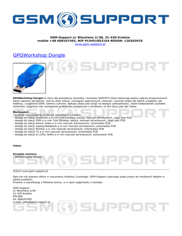 GSM-Support ul. Bitschana 2/38, 31-420 Kraków mobile +48 608107455, NIP PL9451852164 REGON: 120203925 www.gsm-support.pl GPGWorkshop Dongle GPGWorkshop Dongle to klucz dla posiadaczy serwisów i komisów GSM/RTV które dokonują oprócz napraw programowych także naprawy sprzętowe. Jest to zbiór solucji, rozwiązań naprawczych, manuali i tutoriali wideo dla takich urządzeń, jak telefony, urządzenia GSM, kamery cyfrowe, laptopy (baza jest wciąż na bieżąco uaktualniana). Jeżeli kiedykolwiek szukałeś schematu, diagramu lub rozwiązania problemów związanych z hardware, to ten klucz jest dla Ciebie. Możliwości: - szybkie wyszukiwanie po marce (producent) i modelu - dostęp do sekcji telefonów a w nim Test Pointów, solucji, manuali serwisowych, zdjęć płyt PCB - dostęp do sekcji GSM a w nim Test Pointów, solucji, manuali serwisowych, zdjęć płyt PCB - dostęp do sekcji Kamer Video a w nim manuali serwisowych, schematów PCB - dostęp do sekcji Laptop/Notebook a w nim manuali serwisowych, schematów PCB - dostęp do sekcji Monitor a w nim manuali serwisowych, schematów PCB - dostęp do sekcji TV a w nim manuali serwisowych, schematów PCB - dostęp do sekcji IC (CPU, RAM) a w nim manuali serwisowych, schematów PCB Video: Komplet zawiera: - GPGWorkshop dongle ©2012 www.gsm-support.pl Opis ten nie stanowi oferty w rozumieniu Kodeksu Cywilnego. GSM-Support zastrzega sobie prawo do możliwych błędów w opisie produktu. Prosimy o weryfikację z Państwa strony, a w razie wątpliwości o kontakt. GSM-Support ul. Bitschana 2/38 31-420 Kraków POLSKA tel. 608107455 e-mail: [email protected] Powered by TCPDF (www.tcpdf.org)