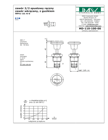 zawór 2/2 spustowy ręczny zawór wkręcany, z guzikiem MPV1-10.-K-0 IMAV-Hydraulik GmbH Breite Strasse 10 40670 Meerbusch - Germany fon +49 (0)2159 - 9188.0 fax +49 (0)2159 - 4242 e-mail: [email protected] internet: http://www.imav.com MD-110-100-00 (Zmiany zastrzeżone!) HEX 1" (moment dokręcania: 48 - 54 Nm) otwór mocujący C-10-2 patrz arkusz wymiarowy nr: IK-100-109-00 zawór 2/2 spustowy ręczny zawór wkręcany, z guzikiem MPV1-10.-K-0 IMAV-Hydraulik GmbH Breite Strasse 10 40670 Meerbusch - Germany fon +49 (0)2159 - 9188.0 fax +49 (0)2159 - 4242 e-mail: [email protected] internet: http://www.imav.com Przykład zamówienia: MPV1 - 10N - K - 0 MD-110-100-00 (Zmiany zastrzeżone!) Klucz typu: wersja urządzenia zawór spustowy ręczny odwodzenie sprężyny rodzaj uruchamiania K = pokrętło ręczne wielkość konstrukcyjna i uszczeln. 10N = Buna (NBR) 10V = Viton (FPM) forma konstrukcyjna 0 = zawór wkręcany Dane techniczne Wskazówka: otwieranie: pociągnięcie za przycisk zamykanie: odwodzenie sprężyny ciśnienie nominalne: 210 bar prąd nominalny: 45 l/min ciężar: 0,11 kg zakres temperatury: -40°C bis 120°C czynnik wytwarzający olej hydrauliczny HL zgodny z normą DIN 51524 T1 (ISO TC 131) ciśnienie: maks. nieszczelność: 5 kropli/min przy 22 cSt (50°C) i 210 bar uszczelnienie: do wyboru Buna (NBR) lub Viton (FPM), oraz teflonowy pierścień oporowy (PTFE) ciśnien. otwarcia zaworu zwrotnego: 16 bar otwór mocujący: C-10-2 patrz arkusz wymiarowy nr: IK-100-109-00 obudowa: 2LH-10.-B.. patrz arkusz wymiarowy nr: IH-100-000-00 zestaw uszczelek: SP-MDS-10N-21 (NBR), SP-MDS-10V-21 (FPM)