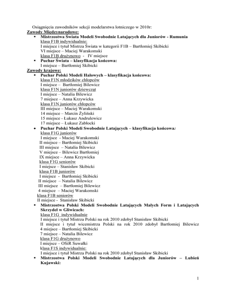 Osiągnięcia zawodników sekcji modelarstwa lotniczego w 2010r: Zawody Międzynarodowe: Mistrzostwa Świata Modeli Swobodnie Latających dla Juniorów - Rumunia klasa F1B indywidualnie: I miejsce i tytuł Mistrza Świata w kategorii F1B – Bartłomiej Skibicki VI miejsce – Maciej Warakomski klasa F1B drużynowo - IV miejsce Puchar Świata – klasyfikacja końcowa: I miejsce – Bartłomiej Skibicki Zawody krajowe: Puchar Polski Modeli Halowych – klasyfikacja końcowa: klasa F1N młodzików chłopców I miejsce – Bartłomiej Bilewicz klasa F1N juniorów dziewcząt I miejsce – Natalia Bilewicz 7 miejsce – Anna Krzywicka klasa F1N juniorów chłopców III miejsce – Maciej Warakomski 14 miejsce – Marcin Żyliński 15 miejsce - Łukasz Andrulewicz 17 miejsce – Łukasz Zabłocki Puchar Polski Modeli Swobodnie Latających – klasyfikacja końcowa: klasa F1G juniorów I miejsce - Maciej Warakomski II miejsce – Bartłomiej Skibicki III miejsce – Natalia Bilewicz V miejsce – Bilewicz Bartłomiej IX miejsce – Anna Krzywicka klasa F1G seniorów I miejsce – Stanisław Skibicki klasa F1B juniorów I miejsce - Bartłomiej Skibicki II miejsce – Natalia Bilewicz III miejsce – Bartłomiej Bilewicz 4 miejsce – Maciej Warakomski klasa F1B seniorów II miejsce - Stanisław Skibicki Mistrzostwa Polski Modeli Swobodnie Latających Małych Form i Latających Skrzydeł w Gliwicach: klasa F1G indywidualnie I miejsce i tytuł Mistrza Polski na rok 2010 zdobył Stanisław Skibicki II miejsce i tytuł wicemistrza Polski na rok 2010 zdobył Bartłomiej Bilewicz 4 miejsce – Bartłomiej Skibicki 7 miejsce – Natalia Bilewicz klasa F1G drużynowo I miejsce – OSiR Suwałki klasa F1S indywidualnie: I miejsce i tytuł Mistrza Polski na rok 2010 zdobył Stanisław Skibicki Mistrzostwa Polski Modeli Swobodnie Latających dla Juniorów – Lubień Kujawski: 1 klasa F1B indywidualnie: I miejsce i tytuł Mistrza Polski na rok 2010 zdobyła Aleksandra Warakomska II miejsce i tytuł wicemistrza Polski na rok 2010 zdobył Maciej Warakomski III miejsce i tytuł II-go wicemistrza Polski na rok 2010 zdobył Łukasz Andrulewicz 6 miejsce – Bartłomiej Skibicki 7 miejsce – Łukasz Zabłocki 8 miejsce – Natalia Bilewicz 9 miejsce – Bartłomiej Bilewicz 10 miejsce – Marcin Żyliński 11 miejsce – Anna Krzywicka klasa F1B drużynowo: I miejsce – OSiR Suwałki Mistrzostwa Polski Modeli Swobodnie Latających dla Juniorów Młodszych Gliwice: klasa F1G indywidualnie: I miejsce i tytuł Mistrza Polski na rok 2010 zdobyła Anna Krzywicka II miejsce i tytuł I-go wicemistrza Polski na rok 2010 zdobył Maciej Warakomski III miejsce i tytuł II-go wicemistrza Polski na rok 2010 zdobył Bartłomiej Bilewicz 4 miejsce – Natalia Bilewicz 7 miejsce – Bartłomiej Skibicki Klasa F1H indywidualnie: 5 miejsce – Maciej Warakomski Mistrzostwa Polski Modeli Swobodnie Latających F1A,F1B,F1C - seniorów – Krosno: klasa F1B indywidualnie: IV – Stanisław Skibicki 9 miejsce – Maciej Warakomski 10 miejsce –Natalia Bilewicz 11 miejsce – Bartłomiej Skibicki klasa F1B drużynowo: II miejsce – OSiR Suwałki Ogółem w Mistrzostwach Polski w 2010r. zawodnicy OSiR zdobyli: indywidualnie : 4 złote, 3 srebrne i 2 brązowe medale drużynowo : 2 złote medale, 1 srebrny medal 2