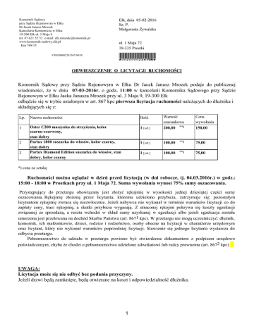 Komornik Sądowy przy Sądzie Rejonowym w Ełku Dr Jacek Janusz Mrozek Kancelaria Komornicza w Ełku 19-300 Ełk ul. 3 Maja 9 tel. 87 621 52 52 e-mail: [email protected] www.komornik-sadowy.elk.pl Km 768/15 #*0020000224156*/0419/ Ełk, dnia 05-02-2016 Sz. P. Małgorzata Żywulska ul. 1 Maja 72 19-335 Prostki *0020000224156* OBWIESZCZENIE O LICYTACJI RUCHOMOŚCI Komornik Sądowy przy Sądzie Rejonowym w Ełku Dr Jacek Janusz Mrozek podaje do publicznej wiadomości, że w dniu 07-03-2016r. o godz. 11:00 w kancelarii Komornika Sądowego przy Sądzie Rejonowym w Ełku Jacka Janusza Mrozek przy ul. 3 Maja 9, 19-300 Ełk odbędzie się w trybie ustalonym w art. 867 kpc pierwsza licytacja ruchomości należących do dłużnika i składających się z: Lp. Nazwa ruchomości Ilość 1 Oster C200 maszynka do strzyżenia, kolor czarno-czerwony, stan dobry Parlux 1800 suszarka do włosów, kolor czarny, stan dobry Parlux Diamond Edition suszarka do włosów, stan dobry, kolor czarny 1 [szt.] Wartość szacunkowa 200,00 **) 1 [szt.] 100,00 **) 75,00 1 [szt.] 100,00 **) 75,00 2 3 Cena wywołania 150,00 *) cena za sztukę Ruchomości można oglądać w dzień przed licytacją (w dni robocze, tj. 04.03.2016r.) w godz.: 15:00 - 18:00 w Prostkach przy ul. 1 Maja 72. Suma wywołania wynosi 75% sumy oszacowania. Przystępujący do przetargu obowiązany jest złożyć rękojmię w wysokości jednej dziesiątej części sumy oszacowania. Rękojmię złożoną przez licytanta, któremu udzielono przybicia, zatrzymuje się; pozostałym licytantom rękojmię zwraca się niezwłocznie. Jeżeli nabywca nie wykonał w terminie warunków licytacji co do zapłaty ceny, traci rękojmię, a skutki przybicia wygasają. Z utraconej rękojmi pokrywa się koszty egzekucji związanej ze sprzedażą, a reszta wchodzi w skład sumy uzyskanej w egzekucji albo jeżeli egzekucja została umorzona jest przelewana na dochód Skarbu Państwa (art. 8671 kpc). W przetargu nie mogą uczestniczyć: dłużnik, komornik, ich małżonkowie, dzieci, rodzice i rodzeństwo, osoby obecne na licytacji w charakterze urzędowym oraz licytant, który nie wykonał warunków poprzedniej licytacji. Stawienie się jednego licytanta wystarcza do odbycia przetargu. Pełnomocnictwo do udziału w przetargu powinno być stwierdzone dokumentem z podpisem urzędowo poświadczonym, chyba że chodzi o pełnomocnictwo udzielone adwokatowi lub radcy prawnemu (art. 8672 kpc) UWAGA: Licytacja może się nie odbyć bez podania przyczyny. Jeżeli drzwi będą zamknięte, będą otwierane na koszt i odpowiedzialność dłużnika. 1 Komornik Sądowy Dr Jacek Janusz Mrozek Adresat oryginału: Małgorzata Żywulska Do wiadomości: 1. Radca Prawny Kinga Brońska, 54-118 Wrocław 2. Sąd Rejonowy w Ełku, 19-300 Ełk 3. a/a 2
