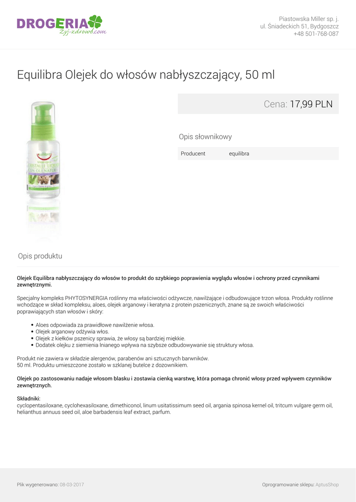 Piastowska Miller sp. j. ul. Śniadeckich 51, Bydgoszcz +48 501-768-087 Equilibra Olejek do włosów nabłyszczający, 50 ml Cena: 17,99 PLN Opis słownikowy Producent equilibra Opis produktu Olejek Equilibra nabłyszczający do włosów to produkt do szybkiego poprawienia wyglądu włosów i ochrony przed czynnikami zewnętrznymi. Specjalny kompleks PHYTOSYNERGIA roślinny ma właściwości odżywcze, nawilżające i odbudowujące trzon włosa. Produkty roślinne wchodzące w skład kompleksu, aloes, olejek arganowy i keratyna z protein pszenicznych, znane są ze swoich właściwości poprawiających stan włosów i skóry: Aloes odpowiada za prawidłowe nawilżenie włosa. Olejek arganowy odżywia włos. Olejek z kiełków pszenicy sprawia, że włosy są bardziej miękkie. Dodatek olejku z siemienia lnianego wpływa na szybsze odbudowywanie się struktury włosa. Produkt nie zawiera w składzie alergenów, parabenów ani sztucznych barwników. 50 ml. Produktu umieszczone zostało w szklanej butelce z dozownikiem. Olejek po zastosowaniu nadaje włosom blasku i zostawia cienką warstwę, która pomaga chronić włosy przed wpływem czynników zewnętrznych. Składniki: cyclopentasiloxane, cyclohexasiloxane, dimethiconol, linum usitatissimum seed oil, argania spinosa kernel oil, tritcum vulgare germ oil, helianthus annuus seed oil, aloe barbadensis leaf extract, parfum. Plik wygenerowano: 08-03-2017 Powered by TCPDF (www.tcpdf.org) Oprogramowanie sklepu: AptusShop
