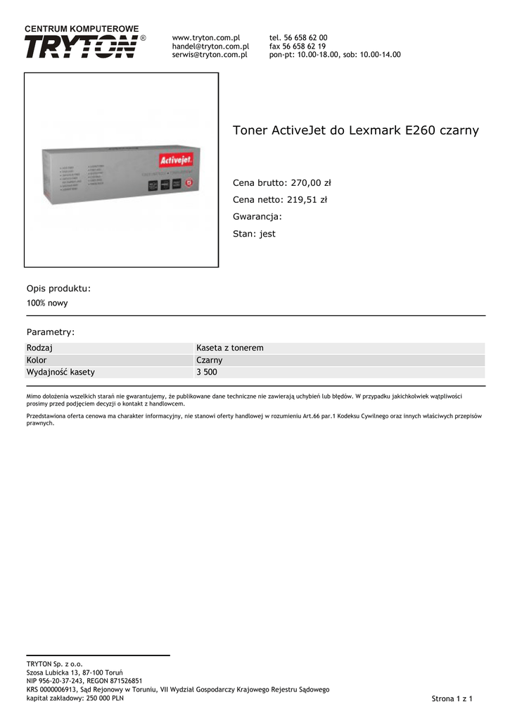 www.tryton.com.pl [email protected] [email protected] tel. 56 658 62 00 fax 56 658 62 19 pon-pt: 10.00-18.00, sob: 10.00-14.00 Toner ActiveJet do Lexmark E260 czarny Cena brutto: 270,00 zł Cena netto: 219,51 zł Gwarancja: Stan: jest Opis produktu: 100% nowy Parametry: Rodzaj Kolor Wydajność kasety Kaseta z tonerem Czarny 3 500 Mimo dołożenia wszelkich starań nie gwarantujemy, że publikowane dane techniczne nie zawierają uchybień lub błędów. W przypadku jakichkolwiek wątpliwości prosimy przed podjęciem decyzji o kontakt z handlowcem. Przedstawiona oferta cenowa ma charakter informacyjny, nie stanowi oferty handlowej w rozumieniu Art.66 par.1 Kodeksu Cywilnego oraz innych właściwych przepisów prawnych. TRYTON Sp. z o.o. Szosa Lubicka 13, 87-100 Toruń NIP 956-20-37-243, REGON 871526851 KRS 0000006913, Sąd Rejonowy w Toruniu, VII Wydział Gospodarczy Krajowego Rejestru Sądowego kapitał zakładowy: 250 000 PLN Strona 1 z 1