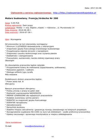 Data: 2017-03-08 Ogłoszenie z serwisu ogłoszeniowego http://http://ogloszeniawielkopolskie.pl Malarz budowlany. Francja/Ardeche Nr 200 Cena: 0.00 PLN Rodzaj ogłoszenia: Dam pracę Lokalizacja: Polska -> woj. Śląskie ,miasto -> Katowice , ul. Murckowska 14 Data dodania: 2016-06-28 r. Data ważności: 2016-07-28 r. Opis: Wymagania Od pracownika na tym stanowisku wymagamy: " Minimum 3-LETNIEGO doświadczenia z referencjami " Znajomości języka francuskiego branżowego budowlanego " Przygotowania własnej skrzynki z narzędziami " Znajomości rysunku technicznego oraz czytania planów " Dokładności i zaangażowania " Pracowitości, sumienności, bardzo dobrej organizacji pracy Obowiązki Do obowiązków pracownika będzie należało: " Przygotowanie ściany do malowania (szpachlowanie, szlifowanie) " Malowanie pędzlem / wałkiem " Obsługa szlifierki typu żyrafa Mile widziane Dodatkowym atutem pracownika będzie: " Prawo jazdy kat. B Oferujemy Naszym pracownikom oferujemy: " Polską umowę o pracę na pełen etat " Możliwość wypracowania NADGODZIN " PREMIE UZNANIOWE dla najlepszych pracowników " Dodatek żywieniowy (prime panier) " DODATKI za znajomość języka francuskiego " DODATEK narzędziowy " Zakwaterowanie " Samochód służbowy " Stabilne miejsce zatrudnienia i gwarancję rozwoju zawodowego na kolejnych projektach. " Wynagrodzenie wypłacane NA CZAS (w euro lub złotówkach - wedle preferencji pracownika) " Opiekę rzeczowego i sprawnego koordynatora w miejscu oddelegowania Dane kontaktowe E-mail: [email protected] 1/2 Telefon: 539931424 Link do ogłoszenia: http://http://ogloszeniawielkopolskie.pl/pokaz_sz_ogl.php?idogl=4722 2/2