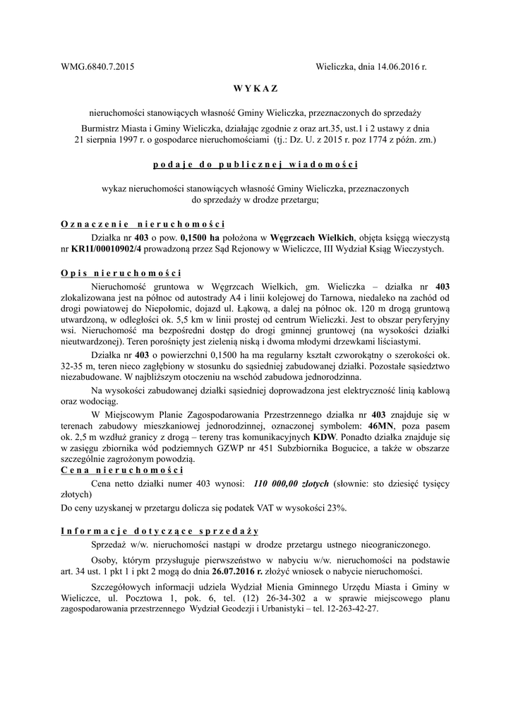 WMG.6840.7.2015 Wieliczka, dnia 14.06.2016 r. WYKAZ nieruchomości stanowiących własność Gminy Wieliczka, przeznaczonych do sprzedaży Burmistrz Miasta i Gminy Wieliczka, działając zgodnie z oraz art.35, ust.1 i 2 ustawy z dnia 21 sierpnia 1997 r. o gospodarce nieruchomościami (tj.: Dz. U. z 2015 r. poz 1774 z późn. zm.) podaje do publicznej wiadomości wykaz nieruchomości stanowiących własność Gminy Wieliczka, przeznaczonych do sprzedaży w drodze przetargu; Oznaczenie nieruchomości Działka nr 403 o pow. 0,1500 ha położona w Węgrzcach Wielkich, objęta księgą wieczystą nr KR1I/00010902/4 prowadzoną przez Sąd Rejonowy w Wieliczce, III Wydział Ksiąg Wieczystych. Opis nieruchomości Nieruchomość gruntowa w Węgrzcach Wielkich, gm. Wieliczka – działka nr 403 zlokalizowana jest na północ od autostrady A4 i linii kolejowej do Tarnowa, niedaleko na zachód od drogi powiatowej do Niepołomic, dojazd ul. Łąkową, a dalej na północ ok. 120 m drogą gruntową utwardzoną, w odległości ok. 5,5 km w linii prostej od centrum Wieliczki. Jest to obszar peryferyjny wsi. Nieruchomość ma bezpośredni dostęp do drogi gminnej gruntowej (na wysokości działki nieutwardzonej). Teren porośnięty jest zielenią niską i dwoma młodymi drzewkami liściastymi. Działka nr 403 o powierzchni 0,1500 ha ma regularny kształt czworokątny o szerokości ok. 32-35 m, teren nieco zagłębiony w stosunku do sąsiedniej zabudowanej działki. Pozostałe sąsiedztwo niezabudowane. W najbliższym otoczeniu na wschód zabudowa jednorodzinna. Na wysokości zabudowanej działki sąsiedniej doprowadzona jest elektryczność linią kablową oraz wodociąg. W Miejscowym Planie Zagospodarowania Przestrzennego działka nr 403 znajduje się w terenach zabudowy mieszkaniowej jednorodzinnej, oznaczonej symbolem: 46MN, poza pasem ok. 2,5 m wzdłuż granicy z drogą – tereny tras komunikacyjnych KDW. Ponadto działka znajduje się w zasięgu zbiornika wód podziemnych GZWP nr 451 Subzbiornika Bogucice, a także w obszarze szczególnie zagrożonym powodzią. Cena nieruchomości Cena netto działki numer 403 wynosi: 110 000,00 złotych (słownie: sto dziesięć tysięcy złotych) Do ceny uzyskanej w przetargu dolicza się podatek VAT w wysokości 23%. Informacje dotyczące sprzedaży Sprzedaż w/w. nieruchomości nastąpi w drodze przetargu ustnego nieograniczonego. Osoby, którym przysługuje pierwszeństwo w nabyciu w/w. nieruchomości na podstawie art. 34 ust. 1 pkt 1 i pkt 2 mogą do dnia 26.07.2016 r. złożyć wniosek o nabycie nieruchomości. Szczegółowych informacji udziela Wydział Mienia Gminnego Urzędu Miasta i Gminy w Wieliczce, ul. Pocztowa 1, pok. 6, tel. (12) 26-34-302 a w sprawie miejscowego planu zagospodarowania przestrzennego Wydział Geodezji i Urbanistyki – tel. 12-263-42-27.