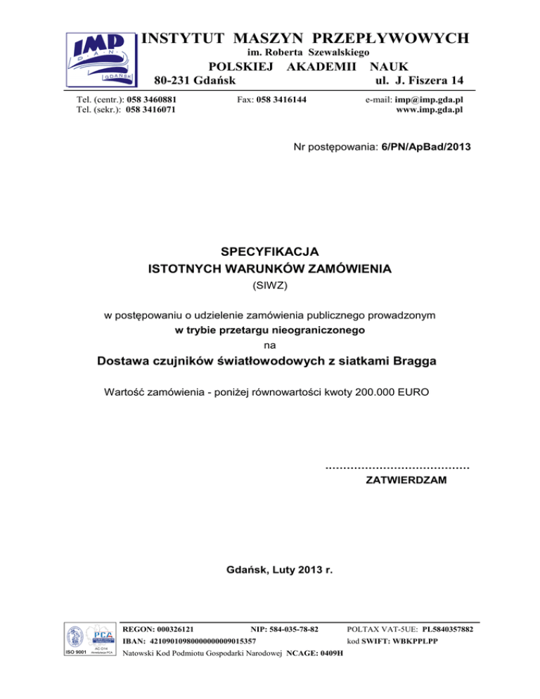INSTYTUT MASZYN PRZEPŁYWOWYCH im. Roberta Szewalskiego POLSKIEJ AKADEMII NAUK 80-231 Gdańsk ul. J. Fiszera 14 Tel. (centr.): 058 3460881 Tel. (sekr.): 058 3416071 Fax: 058 3416144 e-mail: [email protected] www.imp.gda.pl Nr postępowania: 6/PN/ApBad/2013 SPECYFIKACJA ISTOTNYCH WARUNKÓW ZAMÓWIENIA (SIWZ) w postępowaniu o udzielenie zamówienia publicznego prowadzonym w trybie przetargu nieograniczonego na Dostawa czujników światłowodowych z siatkami Bragga Wartość zamówienia - poniżej równowartości kwoty 200.000 EURO .………………………………… ZATWIERDZAM Gdańsk, Luty 2013 r. REGON: 000326121 NIP: 584-035-78-82 IBAN: 42109010980000000009015357 Natowski Kod Podmiotu Gospodarki Narodowej NCAGE: 0409H POLTAX VAT-5UE: PL5840357882 kod SWIFT: WBKPPLPP I. ZAMAWIAJĄCY Instytut Maszyn Przepływowych im. Roberta Szewalskiego Polskiej Akademii Nauk ul. Fiszera 14 80-231, Gdańsk II. TRYB POSTĘPOWANIA Postępowanie o udzielenie zamówienia publicznego prowadzone jest w trybie przetargu nieograniczonego na podstawie przepisów ustawy z dnia 29 stycznia 2004 roku Prawo zamówień publicznych (Dz. U. z 2007 r. Nr 223, poz. 1655 z późn. zm.), zwanej dalej „ustawą Pzp”. III. PRZEDMIOT ZAMÓWIENIA 1. Przedmiotem zamówienia jest : Dostawa czujników światłowodowych z siatkami Bragga – 40 sztuk (2x20) 2. Przedmiot zamówienia wg Wspólnego Słownika Zamówień CPV: 35125100-7 3. Opis przedmiotu zamówienia: 1. Czujniki światłowodowe z siatkami Bragga Przedmiot zamówienia powinien mieć następujące parametry: - Liczba czujników: 20 - Dopuszczalny zakres długości fali nominalnej czujnika: (1510nm - 1590nm), dokładna specyfikacja dot. wybranych długości fali czujników będzie podana w trakcie realizacji zamówienia; - Długość siatki Bragga: 1 mm; - Typ światłowodu na który naniesiona jest siatka Bragga: światłowód jednomodowy; - Spektralna szerokość połówkowa pasma odbitego (FWHM): < 0.25 nm; - Temperaturowy zakres pracy: (-20°C, 80°C); - Zakres pomiarowy : ±4000 µε; - Długość światłowodu i umiejscowienie czujnika: światłowód o długości 2m z czujnikiem wykonanym w połowie długości światłowodu ; - Złącza: światłowód z jednej strony zakończony złączem typu FC/APC; - Elementy zewnętrze czujnika: brak; czujniki światłowodowe wykonane na światłowodzie bez dodatkowych osłon czy elementów ułatwiających montaż w postaci metalowych, kompozytowych elementów itp. 2. Czujniki światłowodowe z siatkami Bragga Przedmiot zamówienia powinien mieć następujące parametry: - Liczba czujników: 20 - Dopuszczalny zakres długości fali nominalnej czujnika: (1510nm - 1590nm), dokładna specyfikacja dot. wybranych długości fali czujników będzie podana w trakcie realizacji zamówienia; - Długość siatki Bragga: 10mm; Typ światłowodu na który naniesiona jest siatka Bragga: światłowód jednomodowy; Spektralna szerokość połówkowa pasma odbitego (FWHM): < 0.25 nm; Temperaturowy zakres pracy: (-20°C, 80°C); Zakres pomiarowy : ±4000 µε; Długość światłowodu i umiejscowienie czujnika: światłowód o długości 2m z czujnikiem wykonanym w połowie długości światłowodu ; Złącza: światłowód z jednej strony zakończony złączem typu FC/APC; Elementy zewnętrze czujnika: brak; czujniki światłowodowe wykonane na światłowodzie bez dodatkowych osłon czy elementów ułatwiających montaż w postaci metalowych, kompozytowych elementów itp. 4. Inne wymagania: 1) Zamawiający wymaga by przedmiot zamówienia był fabrycznie nowy, pozbawiony wad oraz by został dostarczony na koszt i ryzyko Wykonawcy. Zamawiający potwierdzi odbiór zamówionego towaru protokołem odbioru, którego wzór Wykonawca ustali z Zamawiającym. Z chwilą podpisania protokołu odbioru przedmiot zamówienia staje się własnością Zamawiającego. 2) Zamawiający wymaga by gwarancja na przedmiot zamówienia wynosiła min. 12 miesięcy od dnia podpisania protokołu odbioru. Zamawiający nie dopuszcza składania ofert wariantowych. Zamawiający nie dopuszcza składania ofert częściowych. IV. TERMIN I MIEJSCE REALIZACJI ZAMÓWIENIA 1) Zamawiający wymaga, by dostawa nastąpiła w terminie do 8 tygodni od dnia podpisania umowy. 2) Zamawiający wymaga, by dostawa nastąpiła do siedziby Zamawiającego. Koszt dostawy pokrywa Wykonawca. V. WARUNKI UDZIAŁU W POSTĘPOWANIU ORAZ SPOSÓB OCENY ICH SPEŁNIENIA 1. O udzielenie zamówienia mogą ubiegać się wykonawcy, którzy spełniają warunki, dotyczące: a) posiadania uprawnień do wykonywania określonej działalności lub czynności, jeżeli przepisy prawa nakładają obowiązek ich posiadania; b) posiadania wiedzy i doświadczenia; c) dysponowania odpowiednim potencjałem technicznym oraz osobami zdolnymi do wykonania zamówienia; d) sytuacji ekonomicznej i finansowej. 2. Zamawiający dokona oceny spełnienia powyższych warunków na podstawie złożonych przez Wykonawców oświadczeń i dokumentów, zgodnie z formułą: spełnia / nie spełnia. 3. W sytuacjach opisanych w art. 24 Ustawy Pzp, Wykonawca zostanie wykluczony z postępowania a jego oferta odrzucona. VI. WYMAGANE OŚWIADCZENIA I DOKUMENTY 1. Dla potwierdzenia spełnienia warunków określonych w rozdz. V niniejszej SIWZ, Wykonawcy winni złożyć niżej wymienione oświadczenia i dokumenty: 1) oświadczenie o spełnieniu warunków określonych w art. 22 ust. 1 Ustawy Pzp (załącznik nr 2 do SIWZ). Oświadczenie musi być podpisane przez Wykonawcę. 2) Oświadczenie o braku podstaw do wykluczenia z postępowania z art. 24 ust. 1 Ustawy Pzp (załącznik nr 3 do SIWZ). Oświadczenie musi być podpisane przez Wykonawcę. 2. Jeżeli Wykonawca ma siedzibę lub miejsce zamieszkania poza terytorium Rzeczypospolitej Polskiej składa dokumenty zgodnie z Rozporządzeniem Prezesa Rady Ministrów z dnia 30.12.2009 r. w sprawie rodzajów dokumentów, jakich może żądać zamawiający od wykonawcy oraz form, w jakich te dokumenty mog