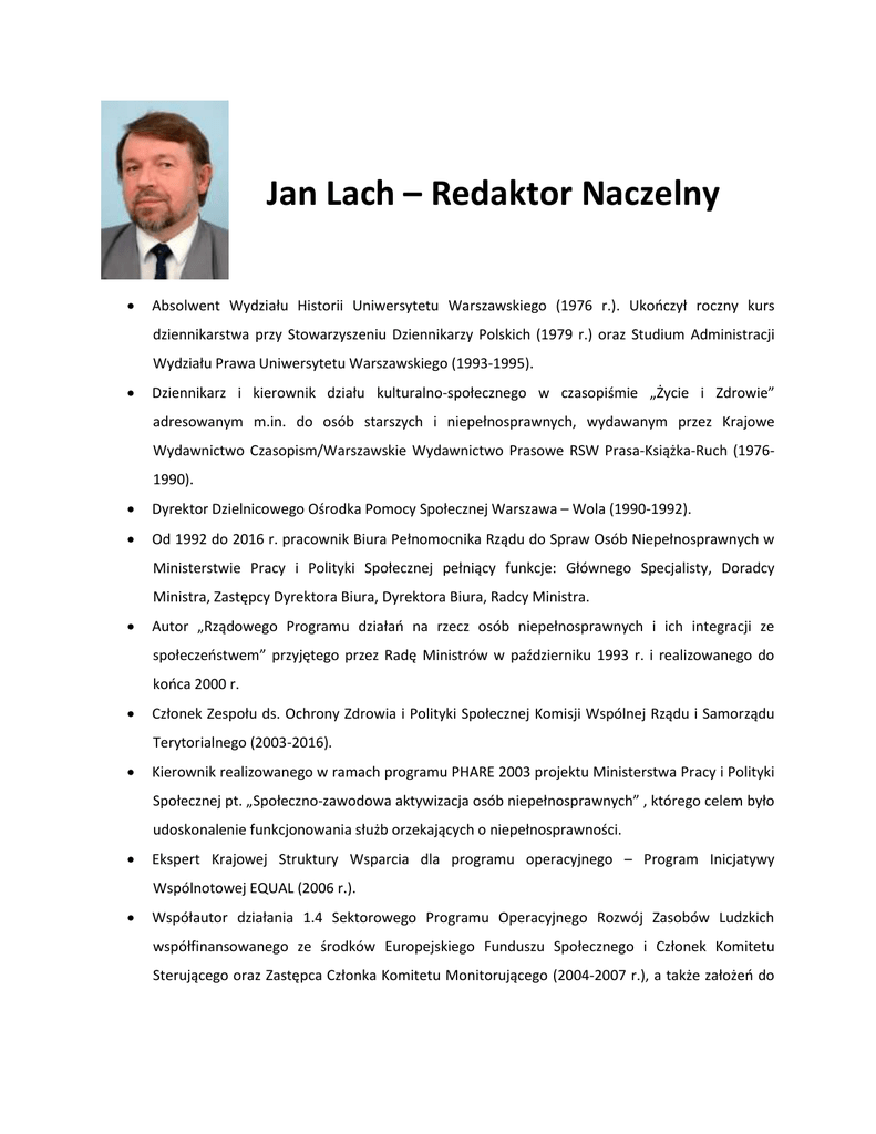 Jan Lach – Redaktor Naczelny Absolwent Wydziału Historii Uniwersytetu Warszawskiego (1976 r.). Ukończył roczny kurs dziennikarstwa przy Stowarzyszeniu Dziennikarzy Polskich (1979 r.) oraz Studium Administracji Wydziału Prawa Uniwersytetu Warszawskiego (1993-1995). Dziennikarz i kierownik działu kulturalno-społecznego w czasopiśmie „Życie i Zdrowie” adresowanym m.in. do osób starszych i niepełnosprawnych, wydawanym przez Krajowe Wydawnictwo Czasopism/Warszawskie Wydawnictwo Prasowe RSW Prasa-Książka-Ruch (19761990). Dyrektor Dzielnicowego Ośrodka Pomocy Społecznej Warszawa – Wola (1990-1992). Od 1992 do 2016 r. pracownik Biura Pełnomocnika Rządu do Spraw Osób Niepełnosprawnych w Ministerstwie Pracy i Polityki Społecznej pełniący funkcje: Głównego Specjalisty, Doradcy Ministra, Zastępcy Dyrektora Biura, Dyrektora Biura, Radcy Ministra. Autor „Rządowego Programu działań na rzecz osób niepełnosprawnych i ich integracji ze społeczeństwem” przyjętego przez Radę Ministrów w październiku 1993 r. i realizowanego do końca 2000 r. Członek Zespołu ds. Ochrony Zdrowia i Polityki Społecznej Komisji Wspólnej Rządu i Samorządu Terytorialnego (2003-2016). Kierownik realizowanego w ramach programu PHARE 2003 projektu Ministerstwa Pracy i Polityki Społecznej pt. „Społeczno-zawodowa aktywizacja osób niepełnosprawnych” , którego celem było udoskonalenie funkcjonowania służb orzekających o niepełnosprawności. Ekspert Krajowej Struktury Wsparcia dla programu operacyjnego – Program Inicjatywy Wspólnotowej EQUAL (2006 r.). Współautor działania 1.4 Sektorowego Programu Operacyjnego Rozwój Zasobów Ludzkich współfinansowanego ze środków Europejskiego Funduszu Społecznego i Członek Komitetu Sterującego oraz Zastępca Członka Komitetu Monitorującego (2004-2007 r.), a także założeń do projektu działań na rzecz osób niepełnosprawnych w ramach Programu Operacyjnego Kapitał Ludzki współfinansowanego ze środków Europejskiego Funduszu Społecznego (2007 r.). Współzałożyciel i Prezes Zarządu Warszawskiego Związku Inwalidów Narządu Ruchu „Solidarność” (1989-1990 r.). Członek Prezydium Regionalnej Sekcji Osób Niepełnosprawnych Regionu Warszawskiego NSZZ „Solidarność” (1990-1992 r.) oraz Członek Prezydium i Rzecznik Prasowy Krajowej Sekcji Osób Niepełnosprawnych i Spółdzielni Inwalidów Krajowej Komisji NSZZ „Solidarność” (1990-1991 r.). Członek Społecznego Zespołu Doradców przy Pełnomocniku do Spraw Osób Niepełnosprawnych (1991 r.).