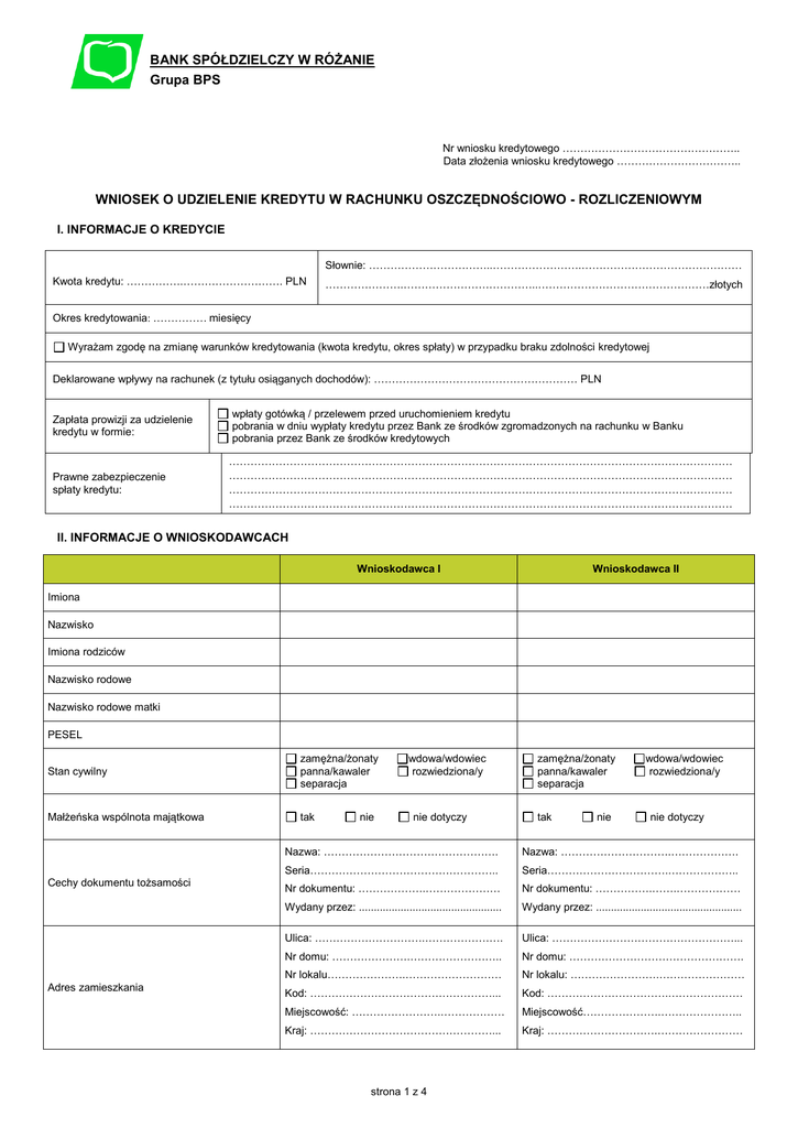 BANK SPÓŁDZIELCZY W RÓŻANIE Grupa BPS Nr wniosku kredytowego ………………………………………….. Data złożenia wniosku kredytowego …………………………….. WNIOSEK O UDZIELENIE KREDYTU W RACHUNKU OSZCZĘDNOŚCIOWO - ROZLICZENIOWYM I. INFORMACJE O KREDYCIE Słownie: ……………………………..…………………….……………………………………… Kwota kredytu: …………….………………………. PLN ………………….………………………………..…………………………………………złotych Okres kredytowania: …………… miesięcy Wyrażam zgodę na zmianę warunków kredytowania (kwota kredytu, okres spłaty) w przypadku braku zdolności kredytowej Deklarowane wpływy na rachunek (z tytułu osiąganych dochodów): ………………………………………………… PLN Zapłata prowizji za udzielenie kredytu w formie: Prawne zabezpieczenie spłaty kredytu: wpłaty gotówką / przelewem przed uruchomieniem kredytu pobrania w dniu wypłaty kredytu przez Bank ze środków zgromadzonych na rachunku w Banku pobrania przez Bank ze środków kredytowych …………………………………………………………………………………………………………………………… …………………………………………………………………………………………………………………………… …………………………………………………………………………………………………………………………… …………………………………………………………………………………………………………………………… II. INFORMACJE O WNIOSKODAWCACH Wnioskodawca I Wnioskodawca II Imiona Nazwisko Imiona rodziców Nazwisko rodowe Nazwisko rodowe matki PESEL Stan cywilny zamężna/żonaty panna/kawaler separacja Małżeńska wspólnota majątkowa tak Cechy dokumentu tożsamości Adres zamieszkania nie wdowa/wdowiec rozwiedziona/y nie dotyczy zamężna/żonaty panna/kawaler separacja tak nie wdowa/wdowiec rozwiedziona/y nie dotyczy Nazwa: …………………………………………. Nazwa: ………………………….………………. Seria…………………………………………….. Seria…………………………….……………….. Nr dokumentu: ……………….………………… Nr dokumentu: …………….…….……………… Wydany przez: ................................................ Wydany przez: ................................................. Ulica: ………………………….…………………. Ulica: ……………………………………………... Nr domu: ………………….…………………….. Nr domu: …………………………………………. Nr lokalu………………….……………………… Nr lokalu: …………………….…………………… Kod: ……………………………………………... Kod: …………………………….………………… Miejscowość: …………………….……………… Miejscowość………………….………………….. Kraj: ……………………………………………... Kraj: ………………………….…………………… strona 1 z 4 Wnioskodawca I Adres do korespondencji Nr telefonu (do wyboru) Wnioskodawca II Ulica……...………………………….…………… Ulica……...…………………….….……………… Nr domu: ……...………………………………… Nr domu: ……...…………………….…………… Nr lokalu: ……...……………...………………… Nr lokalu: ……...…………….…………………… Kod……...………….……….…………………… Kod……...………..…………….………………… Miejscowość: ……...…………………………… Miejscowość: …………....……………………… Kraj: ……...……………………………………… Kraj: ……...…………….………………………… stacjonarny: …………………………….………… stacjonarny: ……………………………………… komórkowy: ………………………….………….. komórkowy: ……………………….……………… E-mail: Wykształcenie wyższe magisterskie licencjat/inżynier średnie zasadnicze zawodowe podstawowe/gimnazjalne wyższe magisterskie licencjat/inżynier średnie zasadnicze zawodowe podstawowe/gimnazjalne nie posiadam posiadam ................. nie posiadam posiadam ................. Wykonywany zawód Rachunek III. INFORMACJE O DOCHODACH I WYDATKACH Wnioskodawca I Wnioskodawca II Całkowity staż pracy (w latach) Okres zatrudnienia u obecnego pracodawcy/czas prowadzenia obecnej dział. gospodarczej (w latach) Informacje o pracodawcy (nazwa, adres) Stanowisko Miesięczny dochód netto: Źródła dochodu właściciel firmy wyższa kadra zarządzająca średnia kadra zarządzająca urzędnik specjalista pracownik inne ..................................... PLN, w tym: umowa o pracę: .................................... emerytura: ............................................ renta: .................................................... zasiłek przedemerytalny: ...................... wolne zawody: ...................................... działalność gospodarcza: ..................... działalność rolnicza: ............................. umowa cywilno-prawna: ....................... umowa najmu: ...................................... umowa o pracę na czas określony do…….................: ............................... odsetki z aktywów finansowych: ............................................................. dywidendy: ........................................... inne: ...................................................... Liczba osób w gosp. (w tym dzieci) Wydatki stałe